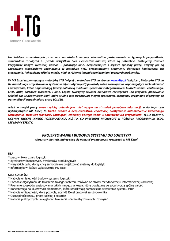 Na każdych prowadzonych przez nas warsztatach uczymy schematów postępowania w typowych przypadkach, standardów rozwiązań i… przede wszystkim tych elementów arkusza, które są potrzebne. Próbujemy również korygować nabyte wcześniej nawyki – pokazując inne, bezpieczniejsze i szybsze sposoby pracy, uczymy jak są zbudowane standardowe rozwiązania w metodyce 4TG, przedstawiamy argumenty dotyczące konieczności ich stosowania. Pokazujemy różnice między nimi, a różnymi innymi rozwiązaniami typowych problemów. W MS Excel wspomaganym metodyką 4TG (więcej o metodyce 4TG na stronie www.4tg.pl i książce: „Metodyka 4TG na tle metodologii projektowania systemów informatycznych”) powstały różne rozwiązania wspomagające rachunkowość i zarządzanie, które odpowiadają funkcjonalnością modułom systemów zintegrowanych: budżetowania i controllingu, CRM, MRP, balanced scorecard, i inne. Często tworzymy również nietypowe rozwiązania (na przykład: planowanie szkoleń dla użytkowników SAP), które trudno jest zrealizować innymi sposobami. Stosujemy oryginalne algorytmy do optymalizacji uzupełniające pracę SOLVER. Jeżeli w swojej pracy coraz częściej potrzebujesz mieć wpływ na strumień przepływu informacji, a do tego celu wykorzystujesz MS Excel, to trzeba zadbać o bezpieczeństwo, czytelność, elastyczność automatycznie tworzonego rozwiązania, stosować standardy rozwiązań, schematy postępowania w powtarzalnych przypadkach. TEGO UCZYMY. UCZYMY TROCHĘ INNEGO POSTĘPOWANIA, NIŻ TO, CO PREFERUJE MICROSOFT w RÓŻNYCH PROGRAMACH ECDL. MY MAMY EFEKTY. PROJEKTOWANIE I BUDOWA SYSTEMU DO LOGISTYKI Warsztaty dla tych, którzy chcą się nauczyć praktycznych rozwiązań w MS Excel DLA * * * * pracowników działu logistyki dyrektorów finansowych, dyrektorów produkcyjnych wszystkich tych, którzy chcą samodzielnie projektować systemy do logistyki informatyków, którzy wykorzystują MS Excel CEL I KORZYŚCI * * * * * * * Nabycie umiejętności budowy systemu logistyki Poznanie algorytmów do tworzenia takiego systemu, zarówno od strony merytorycznej i informatycznej (arkusza) Poznanie sposobów zastosowania takich narzędzi arkusza, które powiązane ze sobą tworzą spójną całość Koncentracja na kluczowych elementach, które umożliwiają samodzielne stworzenie systemu MRP Nabycie umiejętności, które pozwolą, aby MS Excel pracował za użytkownika Oszczędność czasu, pracy ludzkiej i kosztów Nabycie praktycznych umiejętności tworzenia sparametryzowanych rozwiązań PROJEKTOWANIE I BUDOWA SYSTEMU DO LOGISTYKI PROGRAM * Projektowanie struktury danych, zarówno od strony merytorycznej jak i narzędziowej arkusza * Projektowanie strumieni przepływu informacji w modelu MRP * prognoza (budowa rozwiązania do uzyskania prognozy z wykorzystaniem metody MNK i dekompozycji), - podstawa do budowy systemu logistyki * błędy prognoz - element planowania wielkości zapasów * równanie bilansowe: stan początkowy + przychody (produkcja + ... ) = stan końcowy + (sprzedaż + ... ) podstawą do modelowania wielkości produkcji * planowanie produkcji (panel managera do wspomagania planowania), struktura produkcji * plan produkcji vs zdolności produkcyjne - optymalizacja czasu, jeśli zdolności produkcyjne są wykorzystane - optymalizacja kosztów, jeśli zdolności produkcyjne nie są wykorzystane (planowanie optymalnej długości serii) - planowanie zużycia surowców wg norm - planowanie zużycia surowców w czasie - zamówienia uwzględniające czas przygotowania towarów przez dostawcę (raporty - podstawa do podejmowania decyzji) Wszystkie elementy programu są ćwiczone na przygotowanych wcześniej case study i budowane wg zasad metodyki 4TG. TERMIN I LOKALIZACJA: * W przypadku zainteresowania proszę zaproponować termin w pliku: PlanSzkolen.xlsx (plik jest na stronie głównej www.4tg.pl) CENA: 2.500 PLN + VAT (2.100 PLN dla osób, które uczestniczyły w warsztatach z projektowania lub wstępu do projektowania) + VAT obejmuje: * uczestnictwo w zajęciach (4 dni x 8 godz.) *materiały szkoleniowe (pliki z rozwiązaniami) * noclegi i całodzienne wyżywienie WARUNKI UCZESTNICTWA: * oczekujemy kilkuletniej praktyki w użytkowaniu arkusza (budowaniu modeli) * notebook z zainstalowaną pełną wersją Excela z pakietu Office 2003 lub wyższej wersji (w przypadku niemożności spełnienia powyższego warunku prosimy o zaznaczenie w zgłoszeniu – koszt wypożyczenia komputera na całe zajęcia wynosi 200 PLN + VAT) * przesłanie zeskanowanego formularza zgłoszeniowego z pieczątką firmową i podpisem osoby odpowiedzialnej na adres mail: [email protected] PROJEKTOWANIE I BUDOWA SYSTEMU DO LOGISTYKI