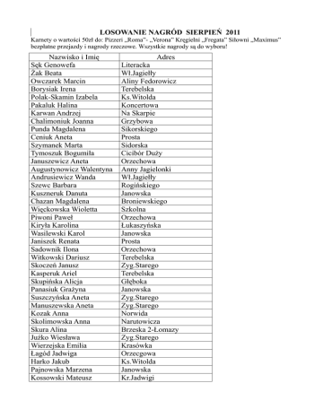 LOSOWANIE NAGRÓD SIERPIEŃ 2011 Karnety o wartości 50zł do: Pizzeri „Roma”- „Verona” Kręgielni „Fregata” Siłowni „Maximus” bezpłatne przejazdy i nagrody rzeczowe. Wszystkie nagrody są do wyboru! Nazwisko i Imię Sęk Genowefa Żak Beata Owczarek Marcin Borysiak Irena Polak-Skamin Izabela Pakaluk Halina Karwan Andrzej Chalimoniuk Joanna Punda Magdalena Ceniuk Aneta Szymanek Marta Tymoszuk Bogumiła Januszewicz Aneta Augustynowicz Walentyna Andrusiewicz Wanda Szewc Barbara Kuszneruk Danuta Chazan Magdalena Więckowska Wioletta Piwoni Paweł Kiryła Karolina Wasilewski Karol Janiszek Renata Sadownik Ilona Witkowski Dariusz Skoczeń Janusz Kasperuk Ariel Skupińska Alicja Panasiuk Grażyna Suszczyńska Aneta Manuszewska Aneta Kozak Anna Skolimowska Anna Skura Alina Juźko Wiesława Wierzejska Emilia Łagód Jadwiga Harko Jakub Pajnowska Marzena Kossowski Mateusz Adres Literacka Wł.Jagiełły Aliny Fedorowicz Terebelska Ks.Witolda Koncertowa Na Skarpie Grzybowa Sikorskiego Prosta Sidorska Cicibór Duży Orzechowa Anny Jagielonki Wł.Jagiełły Rogińskiego Janowska Broniewskiego Szkolna Orzechowa Łukaszyńska Janowska Prosta Orzechowa Terebelska Zyg.Starego Terebelska Głęboka Janowska Zyg.Starego Zyg.Starego Norwida Narutowicza Brzeska 2-Łomazy Zyg.Starego Krasówka Orzecgowa Ks.Witolda Janowska Kr.Jadwigi Kowieska Magda Kade Beata Zakrzewska Katarzyna Nowosielska Magda Daniluk Stanisław Bajbak Olga Marciniuk Sabina Chodzińska Justyna Chorąży Stefan Marchlewski Paweł Bober Zbigniew Oremczuk Przemysław Sujka Alina Stachak Monika Białecka Aneta Zalewska Elżbieta Malinowski Karol Tarasiewicz Helena Melanowicz Ela Rzepecka Edyta Lemieszek Teresa Literacka Okopowa Zyg.Starego Kołychawa Al.1000-lecia Kosmonautów 34Pułku Piechoty Woj.Polskiego-Terespol Parkowa Górna Kolejowa Sobieskiego Sosnowa Łukaszyńska Łukaszyńska Łukaszyńska Warszawska Chrobrego Jaracza Wólka Plebańska Warszawska Sikora Andrzej Szymańska Danuta Szutko Barbara Trębicka Monika Tomaszewska Angelika Tratkowska Marta Szucka Józefa Sigda Agnieszka Demczuk Krzysztof Jońska Katarzyna Mokrzycka Agnieszka Najdychor Emilia Marczuk Teresa Dzyr Teresa Janiszek Anna Kwiatkowska Marzena Nowaczenko Maryna Gałecka Magdalena Korolczuk Sandra Janowska Pl.Wolności Brzeska Nowa Radziwiłłowska Hola Ks.Witolda Przyjaźni-Lublin Ks.Witolda Robotnicza Łomaska Ks.Witolda Koncertwa Francuska Dąbskiego Pogodna Bojki Grzybowa Chłodna