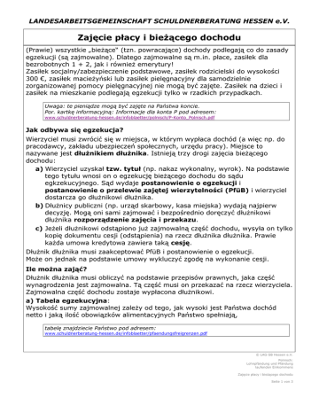 LANDESARBEITSGEMEINSCHAFT SCHULDNERBERATUNG HESSEN e.V. Zajęcie płacy i bieżącego dochodu (Prawie) wszystkie „bieżące“ (tzn. powracające) dochody podlegają co do zasady egzekucji (są zajmowalne). Dlatego zajmowalne są m.in. płace, zasiłek dla bezrobotnych 1 + 2, jak i również emerytury! Zasiłek socjalny/zabezpieczenie podstawowe, zasiłek rodzicielski do wysokości 300 €, zasiłek macieżyński lub zasiłek pielęgnacyjny dla samodzielnie zorganizowanej pomocy pielęgnacyjnej nie mogą być zajęte. Zasiłek na dzieci i zasiłek na mieszkanie podlegają egzekucji tylko w rzadkich przypadkach. Uwaga: te pieniądze mogą być zajęte na Państwa koncie. Por. kartkę informacyjną: Informacje dla konta P pod adresem: www.schuldnerberatung-hessen.de/infoblaetter/polnisch/P-Konto_Polnisch.pdf Jak odbywa się egzekucja? Wierzyciel musi zwrócić się w miejsca, w którym wypłaca dochód (a więc np. do pracodawcy, zakładu ubezpieczeń społecznych, urzędu pracy). Miejsce to nazywane jest dłużnikiem dłużnika. Istnieją trzy drogi zajęcia bieżącego dochodu: a) Wierzyciel uzyskał tzw. tytuł (np. nakaz wykonalny, wyrok). Na podstawie tego tytułu wnosi on o egzekucję bieżącego dochodu do sądu egkzekucyjnego. Sąd wydaje postanowienie o egzekucji i postanowienie o przelewie zajętej wierzytelności (PfüB) i wierzyciel dostarcza go dłużnikowi dłużnika. b) Dłużnicy publiczni (np. urząd skarbowy, kasa miejska) wydają najpierw decyzję. Mogą oni sami zajmować i bezpośrednio doręczyć dłużnikowi dłużnika rozporządzenie zajęcia i przekazu. c) Jeżeli dłużnikowi odstąpiono już zajmowalną część dochodu, wysyła on tylko kopię dokumentu cesji (odstąpienia) na rzecz dłużnika dłużnika. Prawie każda umowa kredytowa zawiera taką cesję. Dłużnik dłużnika musi zaakceptować PfüB i postanowienie o egzekucji. Może on jednak na podstawie umowy wykluczyć zgodę na wykonanie cesji. Ile można zająć? Dłużnik dłużnika musi obliczyć na podstawie przepisów prawnych, jaka część wynagrodzenia jest zajmowalna. Tą część musi on przekazać na rzecz wierzyciela. Zajmowalna część dochodu zostaje wypłacona dłużnikowi. a) Tabela egzekucyjna: Wysokość sumy zajmowalnej zależy od tego, jak wysoki jest Państwa dochód netto i jaką ilość obowiązków alimentacyjnych Państwo spełniają, tabelę znajdziecie Państwo pod adresem: www.schuldnerberatung-hessen.de/infoblaetter/pfaendungsfreigrenzen.pdf © LAG-SB Hessen e.V. Polnisch: Lohnpfändung und Pfändung laufenden Einkommens Zajęcie płacy i bieżącego dochodu Seite 1 von 3 LANDESARBEITSGEMEINSCHAFT SCHULDNERBERATUNG HESSEN e.V. Przykład 1: Znajdujecie się Państwo w związku małżeńskim, macie Państwo dwoje dzieci i zarabiacie miesięczne netto 1900 €. Zajmowalna część płacy wynosi wtedy 7,03 €. Przykład 2: Jest pani niezamężna/ jest pan nieżonaty, dzieci brak, zarabiacie miesięcznie netto 1500 €. Zajmowalna część płacy wynosi wtedy 318,47 €. Jako prawny obowiązek alimentacyjny uwzględnia się alimenty płacone na dzieci, małżonków (w wypadku wyroku lub dokumentu notarialnego również na żyjących w separacji lub na rozwiedzionych), rodziców (np. przypadające koszty domu spokojnej starości i koszty pielęgnacji), jak również na partnerów z zarejestrowanych jednopłciowych związków partnerskich. Jeżeli rodzice nie są w związku małżeńskim, trzeba płacić również alimenty na małżonka u którego dziecko jest wychowywane, przynajmniej przez okres pierwszych trzech lat życia wspólnego dziecka. Dzieje się to w przypadku, jeżeli małżonek nie posiada wystarczającego własnego dochodu. Jeżeli dłużnikowi dłużnika nie są znane wszystkie obowiązki alimentacyjne (na podstawie wpisu na karcie podatkowej), dłużnik musi mu je dowieść (np. przez uznanie ojcostwa, wyrok rozwodowy), jak i dowieść faktu swoich rzeczywistych płatności. b) Części dochodu, które nie mogą być zajęte: Na poczet płacy mogą być zajęte (brutto): zwroty kosztów, zwroty wydatków, połowa wynagrodzenia za nadgodziny, dodatki za brudne warunki, zasiłek urlopowy w zwykłej wysokości i połowa dodatkowego wynagrodzenia z okazji święta Bożego Narodzenia (jednakże max. 500 €). Przykład 3: Jest Pani niezamężna / jest Pan nieżonaty, nie macie Państwo dzieci i zarabiacie brutto 2400 € włącznie z kwotą 200 € za nadgodziny. Zostaje Państwu wypłacone 1656 € netto. Pracodawca musi potrącić teraz od płacy netto połowę nadgodzin - brutto (a więc 100 €) jako dłużnik dłużnika. Powstaje nowa („czysta“) suma netto w wysokości 1556 €. Zajmowalna część płacy wynosi wtedy 353,47 €. Czy większa ilość dochodów może być zsumowana? Tylko dochody jednej osoby (np. emerytura lub płaca) mogą być zsumowane na podstawie wyroku sądu (względnie na zarządzenie wierzyciela publicznego). Przy podwójnych zarobkach wierzyciel wykonujący egzekucję może złożyć wniosek do sądu, tak aby małżonek wystarczająco zarabiający nie był brany pod uwagę w momencie obliczania obowiązku alimentacyjnego. Czy wierzyciel może dochodzić powiększenia zajmowalnej należności? Jeżeli miejsce ma żądanie dotyczące wypłacania bieżących alimentów, długów z tytułu alimentów z ostatnich 12 miesięcy lub odszkodowań z tytułu umyślnie popełnionego przestępstwa, wierzyciel może zająć więcej niż to, co wynika z tabeli egzekucyjnej. Potrzebuje on w tym celu wyroku sądu. Jednakże dłużnikowi musi być zapewnione minimum egzystencyjne – w razie potrzeby należy złożyć wniosek o ponowne sprawdzenie. © LAG-SB Hessen e.V. Polnisch: Lohnpfändung und Pfändung laufenden Einkommens Zajęcie płacy i bieżącego dochodu Seite 2 von 3 LANDESARBEITSGEMEINSCHAFT SCHULDNERBERATUNG HESSEN e.V. Czy dłużnik może dochodzić pomniejszenia zajmowalnej należności? Na wniosek dłużnika sąd lub wierzyciel public