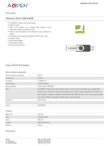 Wołomin 2017-03-04 Karta produktu: Memory Stick USB 64GB Q-CONNECT compact and stylish design; Ideal for travel; Stores and protects your valuable data (photos, music, documents, videos, presentations, etc.); USB 2.0; power supplied by the USB port in your computer or laptop; Compatible with Windows ME, 2000, XP, OS9.x. Win 7, Mac Capacity: 64GB Read speed: 18MB/s Write speed: 12MB/s Colour: silver and black Cena 149,91 PLN brutto Basic product parameters Numer produktu w systemie 20370 Nr dostawcy KF41514 Nr Celcen 11-00055-34 Kod kreskowy 5705831415140 Nazwa produktu Memory Stick USB 64GB Opis Q-CONNECT compact and stylish design;; ideal for travel;; stores and protects your valuable data (photos, music, documents, videos, presentations, etc.);; USB 2.0; power supplied by the USB port in your computer or laptop;; compatible with Windows ME, 2000, XP, OS9.x. Win 7, Mac; capacity: 64GB; read speed: 18MB/s; write speed: 12MB/s; colour: silver and black Kategoria Data Carriers Brand Q-CONNECT Feature Offer from 2014-01 Type Capacity 64 GB Kind USB 2.0 Product USB memory stick Material Plastic Dimensions Axpen ul. Laskowa 4 05-200 Wołomin NIP: 125-00-16-787 REGON: 010346305 +48 (22) 787 55 99 Wołomin 2017-03-04 Karta katalogowa produktu cd. Memory Stick USB 64GB Size 64GB Colour Colour Silver/black Procurement vocabulary CPV 30234600-4 Pamięć flash Certifications New product Standard Hit Standard Pozostałe zdjęcia produktu Serdecznie zapraszamy do współpracy Axpen zespół. Axpen ul. Laskowa 4 05-200 Wołomin NIP: 125-00-16-787 REGON: 010346305 +48 (22) 787 55 99