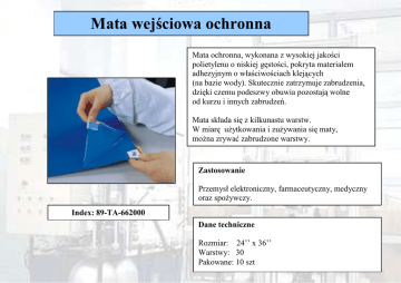 Mata wejściowa ochronna ochronna Mata ochronna, wykonana z wysokiej jakości polietylenu o niskiej gęstości, pokryta materiałem adhezyjnym o właściwościach klejących (na bazie wody). Skutecznie zatrzymuje zabrudzenia, dzięki czemu podeszwy obuwia pozostają wolne od kurzu i innych zabrudzeń. Mata składa się z kilkunastu warstw. W miarę uŜytkowania i zuŜywania się maty, moŜna zrywać zabrudzone warstwy. Zastosowanie Przemysł elektroniczny, farmaceutyczny, medyczny oraz spoŜywczy. Index: 89-TA-662000 Dane techniczne Rozmiar: 24’’ x 36’’ Warstwy: 30 Pakowane: 10 szt Nylonowe rękawice antystatyczne Rękawice wykonane z poliestru, przeszyte co 10 mm nitką węglową. Posiadają bardzo dobre właściwości antystatyczne. Mogą słuŜyć jako wkłady do innych rękawic. Odporne na zuŜycie, moŜna je prać. Zastosowanie Nadają się szczególnie do pracy przy montaŜu, np. do pracy ze sprzętem elektronicznym (m. in. montaŜ TV LCD). Dane techniczne Index: 89-TA-919000 Rozmiar: S-L Rezystancja: 105-107Ω Pakowane: 10 szt Chusteczki czyszczące z mikrofibry Chusteczki wykonane w 100% z podwójnie tkanej mikrofibry. Niezwykle miękkie, nie rysują czyszczonych powierzchni. Absorbują wodę, olej i kurz. Czyszczenie chusteczkami z mikrofibry nie wymaga uŜywania dodatkowych detergentów. Nie pozostawiają plam. Zastosowanie SłuŜą do czyszczenia produktów i przedmiotów w przemyśle elektronicznym oraz farmaceutycznym. UŜywane w klasach czystości: 10, 100, 1000 cleanrooms. Index: 89-TA-900900 Dane techniczne Rozmiar: 9’’ x 9’’ Kombinezon antystatyczny Kombinezon antystatyczny, wykonany w 100% z poliestru oraz włókna węglowego. Produkowane w reŜimie ISO 9001 oraz ISO 14001. Zastosowanie Kombinezon ma zastosowanie w produkcji elektronicznej oraz farmaceutycznej. UŜywany w klasach czystości: 10, 100, 1000 cleanrooms. Dane techniczne Index: 89-TA-000000 Rozmiar: Kolor: S - XL biały, błękitny, róŜowy Wsuwki antystatyczne Buty antystatyczne, wykonane z materiału tekstylnego, na podeszwie z PVC lub PU. Niezwykle lekkie oraz wygodne w uŜytku. MoŜna je prać i suszyć. Podeszwy nie zostawiają śladów. Zastosowanie Wsuwki mają zastosowanie w produkcji elektronicznej oraz farmaceutycznej. Dane techniczne Index: 89-TA-936000 Rozmiar: Kolor: Rezystancja podeszwy: 230 mm – 290 mm biały 1x106-5x108Ω Wsuwki antystatyczne z cholewką Buty antystatyczne z cholewką znajdują swoje zastosowanie wraz z kombinezonem antystatycznym. Cholewka wykonana z poliestru, podeszwa PVC lub PU. Niezwykle lekkie oraz wygodne w uŜytku. MoŜna je prać i suszyć. Podeszwy nie zostawiają śladów. Zastosowanie Przemysł elektroniczny, farmaceutyczny. Dane techniczne Index: 89-TA-947200 Rozmiar: Kolor: Rezystancja podeszwy: 220 mm – 290 mm biały 1x106-5x108Ω