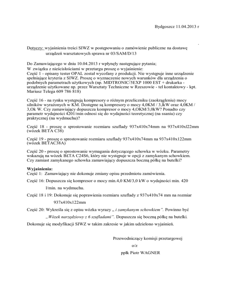 Bydgoszcz 11.04.2013 r . Dotyczy: wyjaśnienia treści SIWZ w postępowaniu o zamówienie publiczne na dostawę urządzeń warsztatowych sprawa nr 03/SAM/D/13 Do Zamawiającego w dniu 10.04.2013 r wpłynęły następujące pytania; W związku z nieścisłościami w przetargu proszę o wyjaśnienie: Część 1 - opisany tester OPAL został wycofany z produkcji. Nie występuje inne urządzenie spełniające kryteria z SIWZ. Proszę o wyznaczenie nowych warunków dla urządzenia o podobnych parametrach użytkowych (np. MlDTRONIC/5EXP 1000 EST + drukarka urządzenie użytkowane np. przez Warsztaty Techniczne w Rzeszowie - tel kontaktowy - kpt. Mariusz Telega 609 786 818) Część 16 - na rynku występują kompresory o różnym przeliczniku (zaokrągleniu) mocy silników wyrażonych w KM. Dostępne są kompresory o mocy 4,0KM / 3,lkW oraz 4,0KM / 3,Ok W. Czy zamawiający dopuszcza kompresor o mocy 4,OKM/3,0kW? Ponadto czy parametr wydajności 4201/min odnosi się do wydajności teoretycznej (na ssaniu) czy praktycznej (na wydmuchu)? Część 18 - proszę o sprostowanie rozmiaru szuflady 937x410x74mm na 937x410xl22mm (wózek BETA C38) Część 19 - proszę o sprostowanie rozmiaru szuflady 937x410x74mm na 937x410x122mm (wózek BETAC38A) Część 20 - proszę o sprostowanie wymagania dotyczącego schowka w wózku. Parametry wskazują na wózek B£TA C24S6, który nie występuje w opcji z zamykanym schowkiem. Czy zamiast zamykanego schowka zamawiający dopuszcza boczną półkę na butelki? Wyjaśnienia: Część 1: Zamawiający nie dokonuje zmiany opisu przedmiotu zamówienia. Część 16: Dopuszcza się kompresor o mocy min.4,0 KM/3,0 kW o wydajności min. 420 l/min. na wydmuchu. Część 18 i 19: Dokonuje się poprawienia rozmiaru szuflady z 937x410x74 mm na rozmiar 937x410x122mm Część 20: Wykreśla się z opisu wózka wyrazy „ i zamykanym schowkiem”. Powinno być „Wózek narzędziowy z 6 szufladami”. Dopuszcza się boczną półkę na butelki. Dokonuje się modyfikacji SIWZ w takim zakresie w jakim udzielono wyjaśnień. Przewodniczący komisji przetargowej o/z ppłk Piotr WAGNER