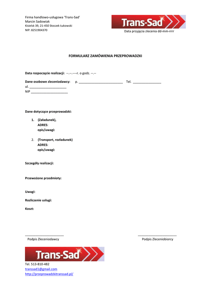 Firma handlowo-usługowa ‘Trans-Sad’ Marcin Sadowiak Kisielsk 39, 21-450 Stoczek Łukowski NIP: 8251904370 Data przyjęcia zlecenia dd-mm-rrrr FORMULARZ ZAMÓWIENIA PRZEPROWADZKI Data rozpoczęcie realizacji: --.--.----r. o godz. --.-Dane osobowe zleceniodawcy: ul. _____________________ NIP _____________________ p. _________________________ Tel. ________________ Dane dotyczące przeprowadzki: 1. (Załadunek), ADRES: opis/uwagi: 2. (Transport, rozładunek) ADRES: opis/uwagi: Szczegóły realizacji: Przewożone przedmioty: Uwagi: Rozliczenie usługi: Koszt: ______________________ Podpis Zleceniodawcy Tel. 513-810-482 [email protected] http://przeprowadzkitranssad.pl/ ______________________ Podpis Zleceniobiorcy