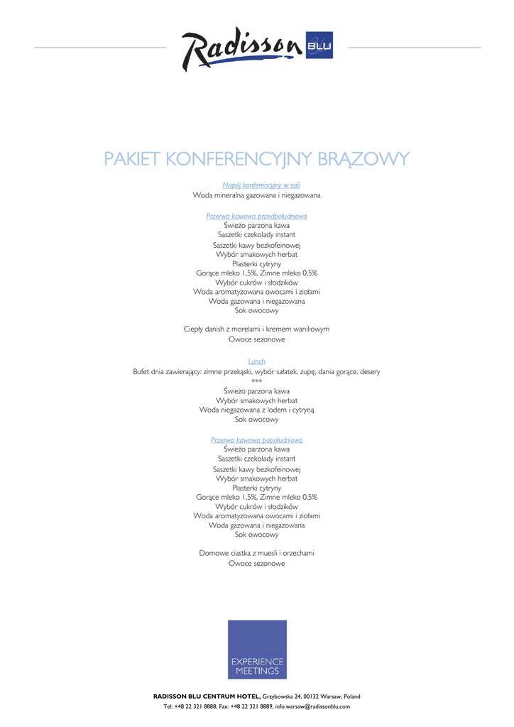 PAKIET KONFERENCYJNY BRĄZOWY a oNapój konferencyjny w sali Woda mineralna gazowana i niegazowana Przerwa kawowa przedpołudniowa Świeżo parzona kawa Saszetki czekolady instant Saszetki kawy bezkofeinowej Wybór smakowych herbat Plasterki cytryny Gorące mleko 1,5%, Zimne mleko 0,5% Wybór cukrów i słodzików Woda aromatyzowana owocami i ziołami Woda gazowana i niegazowana Sok owocowy Ciepły danish z morelami i kremem waniliowym Owoce sezonowe Lunch Bufet dnia zawierający: zimne przekąski, wybór sałatek, zupę, dania gorące, desery *** Świeżo parzona kawa Wybór smakowych herbat Woda niegazowana z lodem i cytryną Sok owocowy Przerwa kawowa popołudniowa Świeżo parzona kawa Saszetki czekolady instant Saszetki kawy bezkofeinowej Wybór smakowych herbat Plasterki cytryny Gorące mleko 1,5%, Zimne mleko 0,5% Wybór cukrów i słodzików Woda aromatyzowana owocami i ziołami Woda gazowana i niegazowana Sok owocowy Domowe ciastka z muesli i orzechami Owoce sezonowe RADISSON BLU CENTRUM HOTEL, Grzybowska 24, 00132 Warsaw, Poland Tel: +48 22 321 8888, Fax: +48 22 321 8889, [email protected] Klimatyzowana sala konferencyjna ze standardowym wyposażeniem: ekran, flipchart, notatniki z długopisami, cukierki miętowe Rzutnik multimedialny lub nagłośnienie z 2 mikrofonami bezprzewodowymi Asysta technika podczas prac przygotowawczych przed spotkaniem Obsługa Meetings & Events Host 2 miejsca parkingowe dla Organizatorów (podczas trwania konferencji) PLN 179,- netto od osoby Minimum 20 osób Min Opcje wzbogacenia przerw kawowych Wybór aromatycznych kaw Napoje gazowane Świeżo wyciskany sok owocowy m20 PLN 10,- netto od osoby / 1 pozycja osób Nie ma możliwści zmian w obrębie pakietu. Cena pakietu obowiązuje przy ustawieniu sali w układzie teatralnym. W przypadku innego ustawienia, wymagającego większej sali – cena pakietu może ulec zmianie. RADISSON BLU CENTRUM HOTEL, Grzybowska 24, 00132 Warsaw, Poland Tel: +48 22 321 8888, Fax: +48 22 321 8889, [email protected]