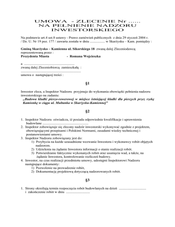 UMOWA - ZLECENIE Nr ...... NA PEŁNIENIE NADZORU INWESTORSKIEGO Na podstawie art.4 ust.8 ustawy - Prawo zamówień publicznych z dnia 29 styczeń 2004 r. / Dz. U. Nr 19 poz. 177 / zawarta została w dniu ................. w Skarżysku – Kam. pomiędzy : Gminą Skarżysko – Kamienna ul. Sikorskiego 18 zwaną dalej Zleceniodawcą reprezentowaną przez : Prezydenta Miasta - Romana Wojcieszka a ......................................................... zwaną dalej Zleceniobiorcą zamieszkałą : .................................................................... umowa o następującej treści : §1 Inwestor zleca, a Inspektor Nadzoru przyjmuje do wykonania obowiązki pełnienia nadzoru inwestorskiego na zadaniu: „Budowa kładki pieszo-rowerowej w miejsce istniejącej kładki dla pieszych przez rzekę Kamionkę w ciągu ul. Multanka w Skarżysku-Kamiennej” §2 1. Inspektor Nadzoru oświadcza, iż posiada odpowiednie kwalifikacje i uprawnienia budowlane .................................................... 2. Inspektor zobowiązuje się zlecony nadzór inwestorski wykonywać zgodnie z projektem, obowiązującymi przepisami i Polskimi Normami, zasadami wiedzy technicznej i postanowieniami umowy. 3. Inspektor Nadzoru zobowiązany jest do: 1) Przybycia na każde uzasadnione wezwanie Inwestora i wykonawcy robót objętych nadzorem. 2) Udzielenia na żądanie Inwestora informacji o stanie realizacji robót. 3) Potwierdzanie faktycznie wykonanych robót oraz usunięcia wad, a także, na żądanie Inwestora, kontrolowanie rozliczeń budowy. 4. Inwestor, na czas realizacji przedmiotu umowy, udostępni Inspektorowi Nadzoru następujące dokumenty: 1) Pozwolenie na prowadzenie robót, 2) Dokumentację projektową dotyczącą nadzorowanych robót. §3 1. Strony określają termin rozpoczęcia robót budowlanych na dzień ............................... i zakończenie robót w dniu ........................... §4 1. Za wykonanie przedmiotu umowy w zakresie wskazanym w §1 niniejszej umowy Inspektor Nadzoru otrzyma wynagrodzenie w kwocie: ............................ (słownie : .......................................... ) §5 1. Wypłata wynagrodzenia nastąpi po stwierdzeniu przez zleceniodawcę wykonania pracy będącej przedmiotem umowy i wystawieniu przez zleceniobiorcę rachunku na Urząd Miasta Skarżysko – Kamienna ul. Sikorskiego 18, 26-110 Skarżysko – Kam. NIP:663-00-08-207, w ciągu 30 dni od daty jej złożenia. . 2. Podstawę do wystawienia faktury za wykonanie przedmiotu umowy, stanowi podpisany przez Inwestora i Inspektora Nadzoru protokół końcowy odbioru robót objętych nadzorem. §6 1. Strony postanawiają , iż obowiązującą ich formą odszkodowania stanowią kary umowne. Kary te będą naliczane w następujących wypadkach i wysokościach : Zleceniobiorca zapłaci Zleceniodawcy kary umowne : a/ z tytułu odstąpienia od umowy z przyczyn niezależnych od Zleceniodawcy w wysokości 10% wynagrodzenia umownego / brutto / b/ za zwłokę w wykonaniu przedmiotu umowy w wysokości 1% wynagrodzenia umownego/ brutto/ za każdy dzień zwłoki 2 Zleceniodawca niezależnie od kar umownych zastrzega sobie prawo dochodzenia odszkodowania uzupełniającego, przewyższającego wysokość zastrzeżonych kar umownych na zasadach ogólnych Kodeksu cywilnego. §7 Inwestor może odstąpić od umowy w przypadku wykonywania umowy przez Inspektora w sposób niezgodny z obowiązującymi przepisami lub w przypadku niezgodności z postanowieniami umowy. §8 Sprawy sporne, wynikłe z realizacji niniejszej umowy, których Strony nie rozwiążą polubownie, rozstrzygać będzie Sąd właściwy dla Zleceniodawcy. §9 Wszelkie zmiany niniejszej umowy wymagają zachowania pod rygorem nieważności formy pisemnej . §10 Umowa obowiązuje od dnia podpisania. §11 Niniejszą umowę sporządzono w 4-ch jednobrzmiących egzemplarzach, po 2 egz. dla każdej ze stron. Zleceniobiorca : Zleceniodawca: