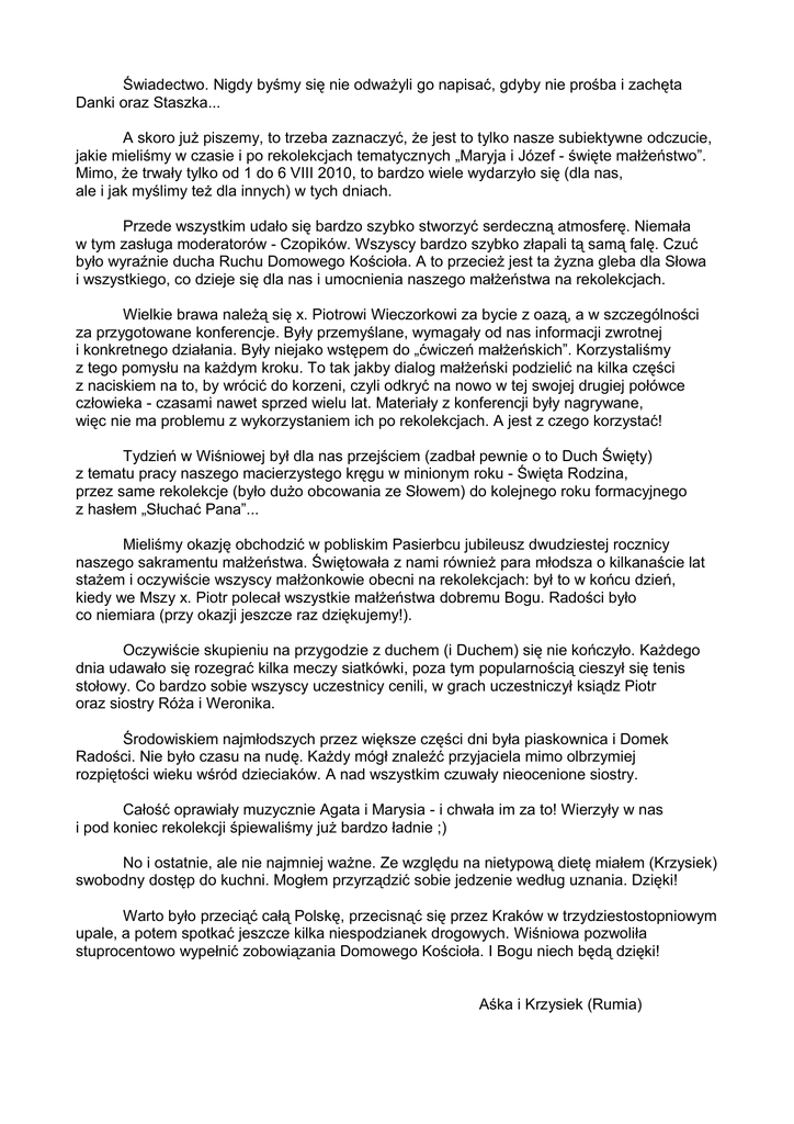 Świadectwo. Nigdy byśmy się nie odważyli go napisać, gdyby nie prośba i zachęta Danki oraz Staszka... A skoro już piszemy, to trzeba zaznaczyć, że jest to tylko nasze subiektywne odczucie, jakie mieliśmy w czasie i po rekolekcjach tematycznych „Maryja i Józef - święte małżeństwo”. Mimo, że trwały tylko od 1 do 6 VIII 2010, to bardzo wiele wydarzyło się (dla nas, ale i jak myślimy też dla innych) w tych dniach. Przede wszystkim udało się bardzo szybko stworzyć serdeczną atmosferę. Niemała w tym zasługa moderatorów - Czopików. Wszyscy bardzo szybko złapali tą samą falę. Czuć było wyraźnie ducha Ruchu Domowego Kościoła. A to przecież jest ta żyzna gleba dla Słowa i wszystkiego, co dzieje się dla nas i umocnienia naszego małżeństwa na rekolekcjach. Wielkie brawa należą się x. Piotrowi Wieczorkowi za bycie z oazą, a w szczególności za przygotowane konferencje. Były przemyślane, wymagały od nas informacji zwrotnej i konkretnego działania. Były niejako wstępem do „ćwiczeń małżeńskich”. Korzystaliśmy z tego pomysłu na każdym kroku. To tak jakby dialog małżeński podzielić na kilka części z naciskiem na to, by wrócić do korzeni, czyli odkryć na nowo w tej swojej drugiej połówce człowieka - czasami nawet sprzed wielu lat. Materiały z konferencji były nagrywane, więc nie ma problemu z wykorzystaniem ich po rekolekcjach. A jest z czego korzystać! Tydzień w Wiśniowej był dla nas przejściem (zadbał pewnie o to Duch Święty) z tematu pracy naszego macierzystego kręgu w minionym roku - Święta Rodzina, przez same rekolekcje (było dużo obcowania ze Słowem) do kolejnego roku formacyjnego z hasłem „Słuchać Pana”... Mieliśmy okazję obchodzić w pobliskim Pasierbcu jubileusz dwudziestej rocznicy naszego sakramentu małżeństwa. Świętowała z nami również para młodsza o kilkanaście lat stażem i oczywiście wszyscy małżonkowie obecni na rekolekcjach: był to w końcu dzień, kiedy we Mszy x. Piotr polecał wszystkie małżeństwa dobremu Bogu. Radości było co niemiara (przy okazji jeszcze raz dziękujemy!). Oczywiście skupieniu na przygodzie z duchem (i Duchem) się nie kończyło. Każdego dnia udawało się rozegrać kilka meczy siatkówki, poza tym popularnością cieszył się tenis stołowy. Co bardzo sobie wszyscy uczestnicy cenili, w grach uczestniczył ksiądz Piotr oraz siostry Róża i Weronika. Środowiskiem najmłodszych przez większe części dni była piaskownica i Domek Radości. Nie było czasu na nudę. Każdy mógł znaleźć przyjaciela mimo olbrzymiej rozpiętości wieku wśród dzieciaków. A nad wszystkim czuwały nieocenione siostry. Całość oprawiały muzycznie Agata i Marysia - i chwała im za to! Wierzyły w nas i pod koniec rekolekcji śpiewaliśmy już bardzo ładnie ;) No i ostatnie, ale nie najmniej ważne. Ze względu na nietypową dietę miałem (Krzysiek) swobodny dostęp do kuchni. Mogłem przyrządzić sobie jedzenie według uznania. Dzięki! Warto było przeciąć całą Polskę, przecisnąć się przez Kraków w trzydziestostopniowym upale, a potem spotkać jeszcze kilka niespodzianek drogowych. Wiśniowa pozwoliła stuprocentowo wypełnić zobowiązania Domowego Kościoła. I Bogu niech będą dzięki! Aśka i Krzysiek (Rumia)