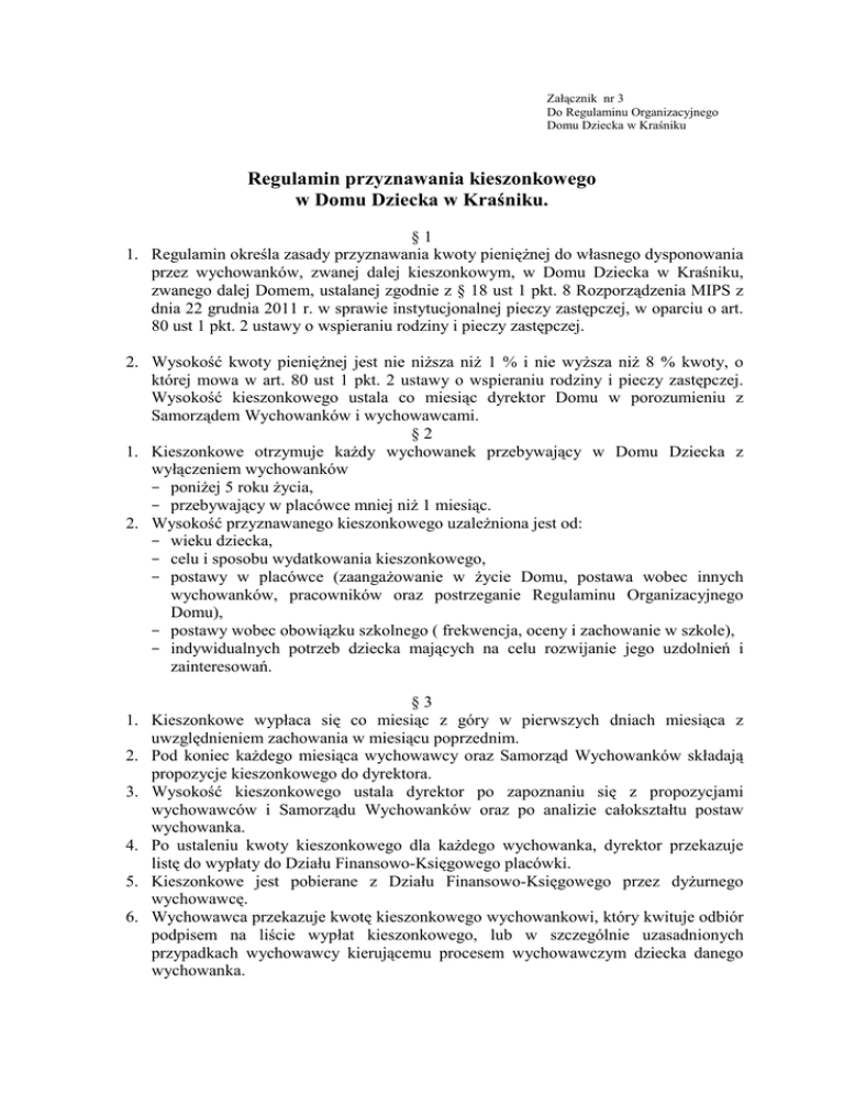 Załącznik nr 3 Do Regulaminu Organizacyjnego Domu Dziecka w Kraśniku Regulamin przyznawania kieszonkowego w Domu Dziecka w Kraśniku. §1 1. Regulamin określa zasady przyznawania kwoty pienięŜnej do własnego dysponowania przez wychowanków, zwanej dalej kieszonkowym, w Domu Dziecka w Kraśniku, zwanego dalej Domem, ustalanej zgodnie z § 18 ust 1 pkt. 8 Rozporządzenia MIPS z dnia 22 grudnia 2011 r. w sprawie instytucjonalnej pieczy zastępczej, w oparciu o art. 80 ust 1 pkt. 2 ustawy o wspieraniu rodziny i pieczy zastępczej. 2. Wysokość kwoty pienięŜnej jest nie niŜsza niŜ 1 % i nie wyŜsza niŜ 8 % kwoty, o której mowa w art. 80 ust 1 pkt. 2 ustawy o wspieraniu rodziny i pieczy zastępczej. Wysokość kieszonkowego ustala co miesiąc dyrektor Domu w porozumieniu z Samorządem Wychowanków i wychowawcami. §2 1. Kieszonkowe otrzymuje kaŜdy wychowanek przebywający w Domu Dziecka z wyłączeniem wychowanków - poniŜej 5 roku Ŝycia, - przebywający w placówce mniej niŜ 1 miesiąc. 2. Wysokość przyznawanego kieszonkowego uzaleŜniona jest od: - wieku dziecka, - celu i sposobu wydatkowania kieszonkowego, - postawy w placówce (zaangaŜowanie w Ŝycie Domu, postawa wobec innych wychowanków, pracowników oraz postrzeganie Regulaminu Organizacyjnego Domu), - postawy wobec obowiązku szkolnego ( frekwencja, oceny i zachowanie w szkole), - indywidualnych potrzeb dziecka mających na celu rozwijanie jego uzdolnień i zainteresowań. §3 1. Kieszonkowe wypłaca się co miesiąc z góry w pierwszych dniach miesiąca z uwzględnieniem zachowania w miesiącu poprzednim. 2. Pod koniec kaŜdego miesiąca wychowawcy oraz Samorząd Wychowanków składają propozycje kieszonkowego do dyrektora. 3. Wysokość kieszonkowego ustala dyrektor po zapoznaniu się z propozycjami wychowawców i Samorządu Wychowanków oraz po analizie całokształtu postaw wychowanka. 4. Po ustaleniu kwoty kieszonkowego dla kaŜdego wychowanka, dyrektor przekazuje listę do wypłaty do Działu Finansowo-Księgowego placówki. 5. Kieszonkowe jest pobierane z Działu Finansowo-Księgowego przez dyŜurnego wychowawcę. 6. Wychowawca przekazuje kwotę kieszonkowego wychowankowi, który kwituje odbiór podpisem na liście wypłat kieszonkowego, lub w szczególnie uzasadnionych przypadkach wychowawcy kierującemu procesem wychowawczym dziecka danego wychowanka. §4 1. Dzieci poniŜej 10 roku Ŝycia dysponują kieszonkowym przy pomocy wychowawcy kierującego jego procesem wychowawczym przeznaczając je na zakup słodyczy, zabawek itp. stosownych do wieku dziecka. Natomiast starsi wychowankowie dysponują kieszonkowym samodzielnie, rozliczając się z wydanych pieniędzy przed wychowawcą kierującym procesem wychowawczym dziecka. 2. Ponosząc odpowiedzialność za popełnione czyny, wychowanek jest zobowiązany do przekazania całości lub części kieszonkowego, na pokrycie szkód wynikających z umyślnego zniszczenia mienia Domu lub innych osób, wyrównania strat z tytułu kradzieŜy czy zawłaszczenia cudzego mienia, a takŜe na pokrycie kosztów związanych z nałoŜeniem na wychowanka wszelkich kar pienięŜnych. Ostateczną decyzję w tej sprawie podejmuje dyrektor w porozumieniu z wychowawcą kierującym procesem wychowawczym dziecka. §5 Regulamin wchodzi w Ŝycie z dniem podjęcia Uchwały Zarządu Powiatu w sprawie uchwalenia Regulaminu Organizacyjnego Domu Dziecka w Kraśniku.