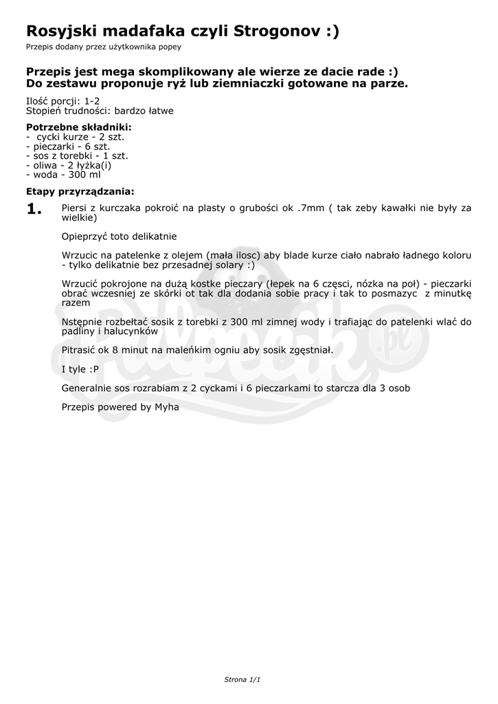 Rosyjski madafaka czyli Strogonov :) Przepis dodany przez użytkownika popey Przepis jest mega skomplikowany ale wierze ze dacie rade :) Do zestawu proponuje ryż lub ziemniaczki gotowane na parze. Ilość porcji: 1-2 Stopień trudności: bardzo łatwe Potrzebne składniki: - cycki kurze - 2 szt. - pieczarki - 6 szt. - sos z torebki - 1 szt. - oliwa - 2 łyżka(i) - woda - 300 ml Etapy przyrządzania: 1. Piersi z kurczaka pokroić na plasty o grubości ok .7mm ( tak zeby kawałki nie były za wielkie) Opieprzyć toto delikatnie Wrzucic na patelenke z olejem (mała ilosc) aby blade kurze ciało nabrało ładnego koloru - tylko delikatnie bez przesadnej solary :) Wrzucić pokrojone na dużą kostke pieczary (łepek na 6 częsci, nózka na poł) - pieczarki obrać wczesniej ze skórki ot tak dla dodania sobie pracy i tak to posmazyc z minutkę razem Nstępnie rozbełtać sosik z torebki z 300 ml zimnej wody i trafiając do patelenki wlać do padliny i halucynków Pitrasić ok 8 minut na maleńkim ogniu aby sosik zgęstniał. I tyle :P Generalnie sos rozrabiam z 2 cyckami i 6 pieczarkami to starcza dla 3 osob Przepis powered by Myha Strona 1/1