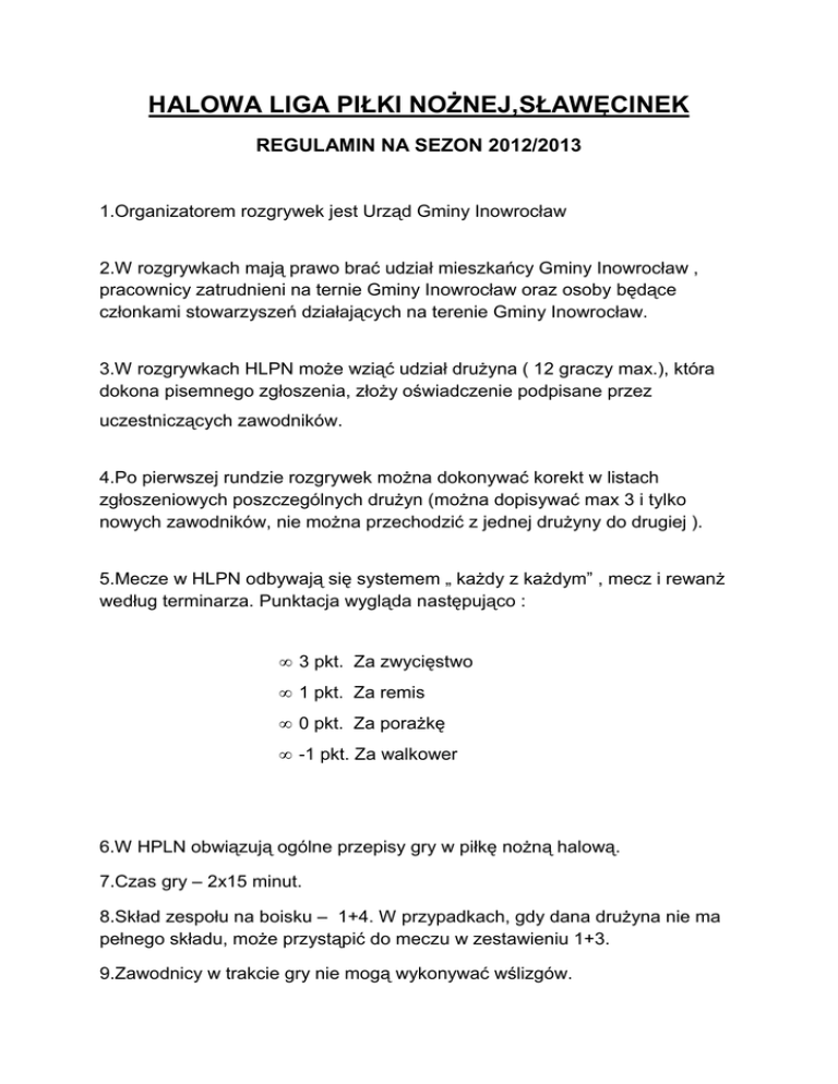 HALOWA LIGA PIŁKI NOŻNEJ,SŁAWĘCINEK REGULAMIN NA SEZON 2012/2013 1.Organizatorem rozgrywek jest Urząd Gminy Inowrocław 2.W rozgrywkach mają prawo brać udział mieszkańcy Gminy Inowrocław , pracownicy zatrudnieni na ternie Gminy Inowrocław oraz osoby będące członkami stowarzyszeń działających na terenie Gminy Inowrocław. 3.W rozgrywkach HLPN może wziąć udział drużyna ( 12 graczy max.), która dokona pisemnego zgłoszenia, złoży oświadczenie podpisane przez uczestniczących zawodników. 4.Po pierwszej rundzie rozgrywek można dokonywać korekt w listach zgłoszeniowych poszczególnych drużyn (można dopisywać max 3 i tylko nowych zawodników, nie można przechodzić z jednej drużyny do drugiej ). 5.Mecze w HLPN odbywają się systemem „ każdy z każdym” , mecz i rewanż według terminarza. Punktacja wygląda następująco : • 3 pkt. Za zwycięstwo • 1 pkt. Za remis • 0 pkt. Za porażkę • -1 pkt. Za walkower 6.W HPLN obwiązują ogólne przepisy gry w piłkę nożną halową. 7.Czas gry – 2x15 minut. 8.Skład zespołu na boisku – 1+4. W przypadkach, gdy dana drużyna nie ma pełnego składu, może przystąpić do meczu w zestawieniu 1+3. 9.Zawodnicy w trakcie gry nie mogą wykonywać wślizgów. 10.Rzuty wolne, rożne są rzutami pośrednimi 11.Zasada karania zawodników: 2 minuty: • Ostry faul, głośne przeklinanie • Celowa obrona ręką bramki przez zawodnika z pola. • Celowe zagranie ręką bramkarza poza polem karnym. • Faul zawodnika, który uniemożliwił przeciwnikowi realne zdobycie bramki. Kara meczu: • Za niesportowe zachowanie w zawodach, w stosunku do sędziego, przeciwnika, partnera, publiczności – zawodnik do końca meczu wykluczony z gry + 1 mecz pauzy 12.O zajętym miejscu w tabeli w pierwszej kolejności decyduje liczba zdobytych punktów, różnica bramek, liczba strzelonych bramek, bezpośrednie spotkania. 13.Uczestnikami HLPN są osoby, które mają ukończony 18 rok życia. W wyjątkowych sytuacjach są dopuszczone do rozgrywek osoby nie pełnoletnie ( minimum rocznik 1996 ), które muszą posiadać oświadczenie podpisane przez rodziców bądź opiekunów prawnych. 14.W całym obiekcie, hali sportowej, w której rozgrywane są mecze LHPN obowiązuje całkowity zakaz palenia i spożywania napojów alkoholowych. 15.Za wstawianie do gry zawodnika nieuprawnionego, zawieszonego, drużynie grozi walkower. 16.Czas oczekiwania na drużynę wynosi max. 5 minut. Drużyna która nie rozpocznie spotkania w ciągu tego czasu zostanie ukarana walkowerem w stosunku 0:3 oraz karą -1 pkt w ogólnej punktacji. 17.Dwukrotne nie stawienie się drużyny na mecz w określonym terminie spowoduje wykluczenie jej z rozgrywek. 18.W czasie trwania zawodów prawo do dyskusji z sędzią ma tylko i wyłącznie kapitan drużyny oznaczony opaską. 19.W uzasadnionych przypadkach kapitan lub kierownik drużyny może składać protest do organizatora, ale najpóźniej zaraz po odbytym meczu. 20.Wszystkie protesty rozpatruje organizator, a kar udziela organizator i sędzia zawodów. 21.Wszelka działalność drużyny na boisku lub na terenie Sali sprzeczna z etyką sportową będzie karana przez organizatora. 22.Organizator ma prawo podjąć decyzję o wykluczeniu danej drużyny z rozgrywek w przypadku łamania regulaminu. 23.Za usterki dokonane przez daną drużynę, stwierdzone w sali sportowej ponosi pełną odpowiedzialność jej kierownik 24.Przełożenie terminu spotkania jest możliwe tylko w wyjątkowych sytuacjach, jeden raz w sezonie przez każdą z drużyn, co najmniej 7 dni przed meczem. W takich sytuacjach drużyna przeciwna musi wyrazić zgodę, ale ona ustala termin przełożonego spotkania. 25.Każda drużyna uczestnicząca w rozgrywkach powinna być ubezpieczona we własnym zakresie od następstw nie szczęśliwych wypadków i kontuzji. Organizator nie ponosi za nie odpowiedzialności. 26.Wszyscy uczestnicy rozgrywek są zobowiązani do zapoznania się z niniejszym regulaminem i przestrzegania go podczas zawodów. Za dopełnienie tego punktu są odpowiedzialni kierownicy drużyn. 27.Organizator zastrzega sobie pełne i wyłączne prawo do interpretacji niniejszego regulaminu oraz jego zmiany po konsultacjach z uczestnikami rozgrywek. Regulamin opracował nauczyciel w-f : Piotr Nijak
