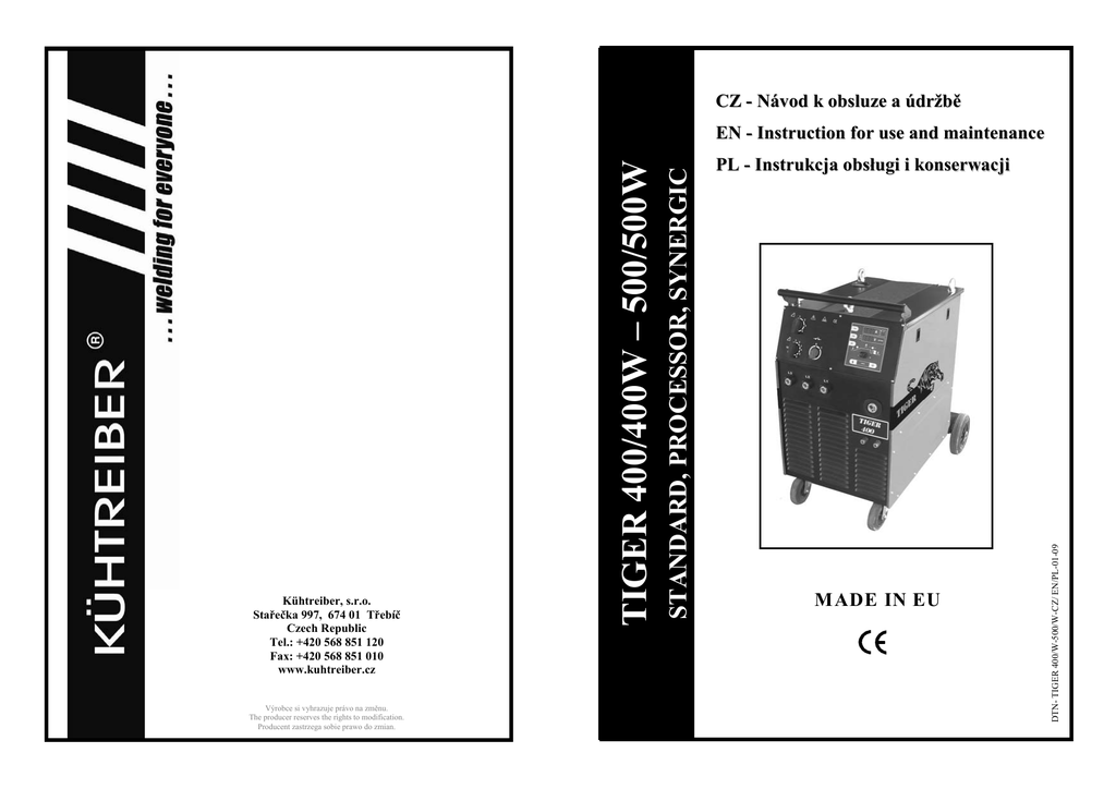 CZ - Návod k obsluze a údržbě PL - Instrukcja obsługi i konserwacji M ADE IN EU Výrobce si vyhrazuje právo na změnu. The producer reserves the rights to modification. Producent zastrzega sobie prawo do zmian. - 84 - -1- DTN- TIGER 400/W-500/W-CZ/ EN/PL-01-09 STANDARD, PROCESSOR, SYNERGIC Kühtreiber, s.r.o. Stařečka 997, 674 01 Třebíč Czech Republic Tel.: +420 568 851 120 Fax: +420 568 851 010 www.kuhtreiber.cz TIGER 400/400W – 500/500W EN - Instruction for use and maintenance Úvod Česky Poznámky / Notes / Uwagi Vážený zákazníku, děkujeme Vám za důvěru a zakoupení našeho výrobku. Před uvedením do provozu si prosím důkladně přečtěte všechny pokyny uvedené v tomto návodu. Pro nejoptimálnější a dlouhodobé použití musíte dodržovat instrukce pro použití a údržbu zde uvedené. Ve Vašem zájmu Vám doporučujeme, abyste údržbu a případné opravy svěřili naší servisní organizaci, neboť má k dispozici příslušné vybavení a speciálně vyškolený personál. Veškeré naše stroje a zařízení jsou předmětem dlouhodobého vývoje. Proto si vyhrazujeme právo upravit jejich výrobu a vybavení. Obsah Úvod ……………………………………… 2 Popis ……………………………………… 2 Provedení strojů ……………….…………. 3 Technická data ………..………………….. 4 Omezení použití ………………………….. 4 Bezpečnostní pokyny …………………….. 4 Instalace …………………………………... 6 Popis Vybavení strojů …………………………… 6 TIGER jsou svařovací stroje, určené ke svařování metodami MIG (Metal Inert Gas) a MAG (Metal Active Gas). Zdroje svařovacího proudu s plochou charakteristikou. Jedná se o svařování v ochranné atmosféře aktivních a netečných plynů, kdy přídavný materiál je v podobě „nekonečného“ drátu podáván do svarové lázně posuvem drátu. Tyto metody jsou velice produktivní, zvláště vhodné pro spoje konstrukčních ocelí, nízkolegovaných ocelí, hliníku a jeho slitin. Připojení do sítě …………………………... 7 Ovládací prvky …………………………….7 Připojení svařovacího hořáku …………….. 9 Zavedení drátu a nastavení průtoku plynu …………………………………….... 10 Nastavení svařovacích parametrů ………… 11 Svařovací režimy …………………………. 16 Stroje jsou řešené jako pojízdné soupravy, lišící se od sebe navzájem výkonem a výbavou. Zdroj svařovacího proudu, zásobník drátu a posuv drátu jsou v jedné kompaktní plechové skříni se dvěma pevnými a dvěma otočnými koly. Než začnete svařovat …………………….. 17 Údržba ……………………………………. 17 Upozornění na možné problémy a jejich odstranění …………………………………. 18 Stroje TIGER jsou určeny ke svařování tenkých, středních a větších tlouštěk materiálů při použití drátů od průměru 0,6 do 1,2 mm (TIGER 400) a od 0,6 do 1,6 mm (TIGER 500). Standardní vybavení strojů je uvedeno v kapitole „Vybavení strojů TIGER“. Svařovací stroje jsou v souladu se všemi normami a nařízeními Evropské Unie a České republiky. Objednání náhradních dílů ……………...… 18 Použité graf. symboly …………………….. 53 Graf. symboly na výrobním štítku ………...54 Doporučené nastavení svařovacích parametrů …………………………………. 55 Elektrotechnické schéma ………………… 64 Seznam náhradních dílů ………………….. 67 Náhradní díly posuvů a seznam kladek …... 71 Poskytnuté záruky ………………………… 72 Příručka pro odstraňování závad ….……… 73 Osvědčení JKV a záruční list ….………….. 80 Prohlášení o shodě ….…………………….. 81 -2- - 83 - ES PROHLÁŠENÍ O SHODĚ Provedení strojů Stroje TIGER 400/400W a 500/500W jsou sériově dodávány v následujících provedeních: Analogové provedení STANDARD Jednoduché a spolehlivé ovládání strojů TIGER. Ovládání je provedeno jedním potenciometrem posuvu drátu a dvěma dalšími potenciometry s vypínačem, kterými se zapínají a nastavují funkce bodování a pulzování. Tato varianta se standardně vybavuje digitálním voltampérmetrem My, firma KÜHTREIBER, s.r.o. Stařečka 997 674 01 Třebíč DIČ: CZ25544390 prohlašujeme na svou výlučnou odpovědnost, že výrobky níže uvedené splňují požadavky zákona č. 22/1997 Sb. v posledním znění a nařízení vlády č. 17/2003 Sb., č. 24/2003 Sb., č. 616/2006 Sb. Typy: STANDARD TIGER 400/400W TIGER 500/500W PROCESSOR TIGER 400/400W TIGER 500/500W SYNERGIC TIGER 400/400W TIGER 500/500W Popis elektrického zařízení: Svařovací MIG/MAG stroje Odkaz na harmonizované normy: ČSN EN 60974-1 ČSN EN 50199 a normy související Poslední dvojčíslí roku, v němž bylo na výrobky označení CE umístěno: 06 Místo vydání: Datum vydání: Jméno: Funkce: 20.7.2007 Třebíč Martin Keliar jednatel společnosti - 82 - Digitální provedení PROCESSOR Jednoduše řešené ovládání všech funkcí pro svařování metodami MIG/MAG. Jednoduché ovládání a nastavování všech hodnot se provádí jedním potenciometrem a dvěmi tlačítky. K jednoduchosti ovládání přispívá funkce LOGIC. Stroje s tímto ovládáním jsou vybaveny digitálním voltampérmetrem s pamětí. Jednoduše řešené ovládání umožňuje nastavení hodnot předfuku/dofuku plynu, funkce SOFT START, dohoření drátu, bodování a pulzování. Ovládání umožňuje nastavení dvoutaktního a čtyřtaktního režimu. Progresivní zavádění drátu umožňuje jeho bezproblémové zavádění. Elektronická regulace rychlosti posuvu drátu disponuje zpětnovazební regulací posuvu drátu, která zajišťuje konstantní nast