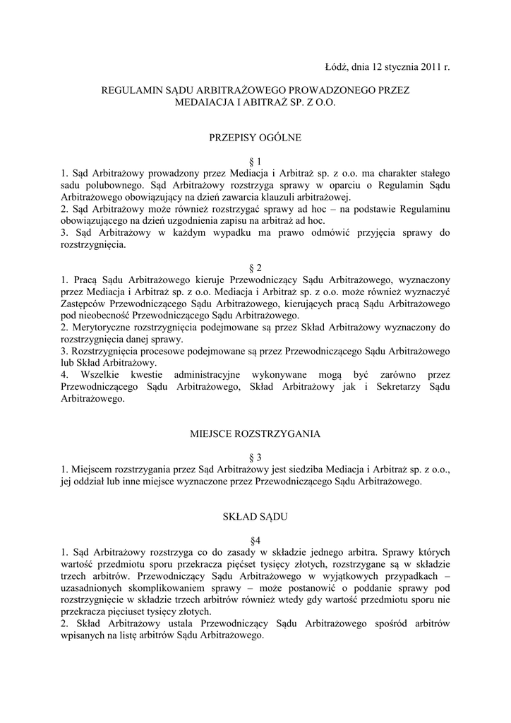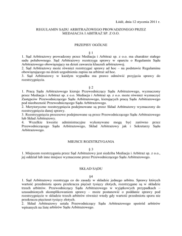 Łódź, dnia 12 stycznia 2011 r. REGULAMIN SĄDU ARBITRAŻOWEGO PROWADZONEGO PRZEZ MEDAIACJA I ABITRAŻ SP. Z O.O. PRZEPISY OGÓLNE §1 1. Sąd Arbitrażowy prowadzony przez Mediacja i Arbitraż sp. z o.o. ma charakter stałego sadu polubownego. Sąd Arbitrażowy rozstrzyga sprawy w oparciu o Regulamin Sądu Arbitrażowego obowiązujący na dzień zawarcia klauzuli arbitrażowej. 2. Sąd Arbitrażowy może również rozstrzygać sprawy ad hoc – na podstawie Regulaminu obowiązującego na dzień uzgodnienia zapisu na arbitraż ad hoc. 3. Sąd Arbitrażowy w każdym wypadku ma prawo odmówić przyjęcia sprawy do rozstrzygnięcia. §2 1. Pracą Sądu Arbitrażowego kieruje Przewodniczący Sądu Arbitrażowego, wyznaczony przez Mediacja i Arbitraż sp. z o.o. Mediacja i Arbitraż sp. z o.o. może również wyznaczyć Zastępców Przewodniczącego Sądu Arbitrażowego, kierujących pracą Sądu Arbitrażowego pod nieobecność Przewodniczącego Sądu Arbitrażowego. 2. Merytoryczne rozstrzygnięcia podejmowane są przez Skład Arbitrażowy wyznaczony do rozstrzygnięcia danej sprawy. 3. Rozstrzygnięcia procesowe podejmowane są przez Przewodniczącego Sądu Arbitrażowego lub Skład Arbitrażowy. 4. Wszelkie kwestie administracyjne wykonywane mogą być zarówno przez Przewodniczącego Sądu Arbitrażowego, Skład Arbitrażowy jak i Sekretarzy Sądu Arbitrażowego. MIEJSCE ROZSTRZYGANIA §3 1. Miejscem rozstrzygania przez Sąd Arbitrażowy jest siedziba Mediacja i Arbitraż sp. z o.o., jej oddział lub inne miejsce wyznaczone przez Przewodniczącego Sądu Arbitrażowego. SKŁAD SĄDU §4 1. Sąd Arbitrażowy rozstrzyga co do zasady w składzie jednego arbitra. Sprawy których wartość przedmiotu sporu przekracza pięćset tysięcy złotych, rozstrzygane są w składzie trzech arbitrów. Przewodniczący Sądu Arbitrażowego w wyjątkowych przypadkach – uzasadnionych skomplikowaniem sprawy – może postanowić o poddanie sprawy pod rozstrzygnięcie w składzie trzech arbitrów również wtedy gdy wartość przedmiotu sporu nie przekracza pięciuset tysięcy złotych. 2. Skład Arbitrażowy ustala Przewodniczący Sądu Arbitrażowego spośród arbitrów wpisanych na listę arbitrów Sądu Arbitrażowego. 3. Wskutek ujawnienia się okoliczności poddających w wątpliwość bezstronność arbitra wchodzącego w skład orzekający, na wniosek samego arbitra, na zgodny wniosek stron oraz czasowej niezdolności arbitra do pełnienia obowiązków powyżej dwóch tygodni, Przewodniczący Sądu Arbitrażowego wyłącza arbitra od orzekania danej sprawie i powołuje jego następcę. 4. Arbitrzy są niezawiśli. W zakresie rozstrzygnięć merytorycznych podlegają wyłącznie ustawom. POUFNOŚĆ §5 1. Postępowanie przed Sądem Arbitrażowym jawne jest wyłącznie dla stron postępowanie. 2. Akta udostępnia się wyłącznie stronom, ich przedstawicielom ustawowym i pełnomocnikom procesowym oraz organom uprawnionym zgodnie z art. 1204 kpc. 3. Przewodniczący Sadu Arbitrażowego, jego zastępcy, Arbitrzy i Sekretarze Sądu Arbitrażowego zobowiązani są do zachowania całkowitej tajemnicy o przebiegu postępowania przed Sądem oraz o wszystkich okolicznościach sprawy, o których dowiedzieli się w związku z postępowaniem. POSTEPOWANIE §6 1. Postępowanie przez Sądem Arbitrażowym jest jednoinstancyjne. §7 1. Sąd Arbitrażowy rozstrzyga sprawy na podstawie wniesionego doń powództwa. 2. Pozew zawierać winien wskazanie klauzuli arbitrażowej uzasadniającej właściwość Sądu Arbitrażowego. 3. Pozew powinien spełniać wymogi wskazane w 187 kpc (w postępowaniu przed Sądem Arbitrażowym nie stosuje się formularzy jak w postępowaniu uproszczonym). Ponadto pozew powinien wskazywać telefon i adres do korespondencji e-mail Powoda i jego pełnomocnika. 4. Pozew zawierać winien wskazanie wszelkich twierdzeń i dowodów na ich poparcie. 5. Do pozwu dołączony winien zostać dowód uiszczenia opłaty sądowej. 6. Do pozwu powinny zostać załączone odpisy, po jednym dla każdego z pozwanych. 7. W razie jakiegokolwiek braku, Sekretarz Sądu Arbitrażowego wzywa Powoda lub jego pełnomocnika do uzupełnienia braków w wyznaczonym terminie pod rygorem zwrotu pozwu. Postanowienie o zwrocie pozwu wydaje Przewodniczący Sądu Arbitrażowego. 8. Po stwierdzeniu prawidłowości pozwu, Sekretarz Sądu Arbitrażowego wysyła odpis pozwu Pozwanemu, wskazując mu jednocześnie termin (nie krótszy jednak niż siedem dni) do ustosunkowania się do powództwa poprzez podniesienie wszelkich twierdzeń i dowodów na ich poparcie – pod rygorem pominięcia ich w postępowaniu. 9. Jednocześnie z doręczeniem odpisu pozwu, Sekretarz Sądu Arbitrażowego zobowiązuje Pozwanego do wskazania telefonu i adresu do korespondencji e-mail Pozwanego i jego pełnomocnika. 10. Po otrzymaniu odpowiedzi na powództwo Sekretarz Sądu Arbitrażowego doręcza ją Powodowi, wskazując mu jednocześnie termin (nie krótszy jednak niż siedem dni) do ustosunkowania się do powództwa poprzez podniesienie wszelkich twierdzeń i dowodów na ich poparcie – pod rygorem pominięcia ich w postępowaniu. 11. Po otrzymaniu odpowiedzi na powództwo lub jej braku w wyznaczonym terminie oraz po otrzymaniu pisma procesowego – zawierającego ustosunkowanie się Powoda do odpowiedzi na powództwo lub jego braku w wyznaczonym terminie, Przewodniczący Sądu Arbitrażowego wyznacza Skład Arbitrażowy do rozstrzygnięcia danej sprawy. Przy wyznaczaniu Składu Arbitrażowego, Przewodniczący Sądu Arbitrażowego uwzględni ewentualne zastrzeżenia co do bezstronności osób figurujących na liście arbitrów wniesione przez powoda najpóźniej wraz z pozwem lub przez pozwanego najpóźniej z odpowiedzią na pozew – jeżeli uzna je za uzasadnione. Późniejsze wnioski stron o wyłączenie arbitra w oparciu o okoliczności znane we wskazanych powyżej terminach są niedopuszczalne. 12. Brak właściwości Sądu może być skutecznie