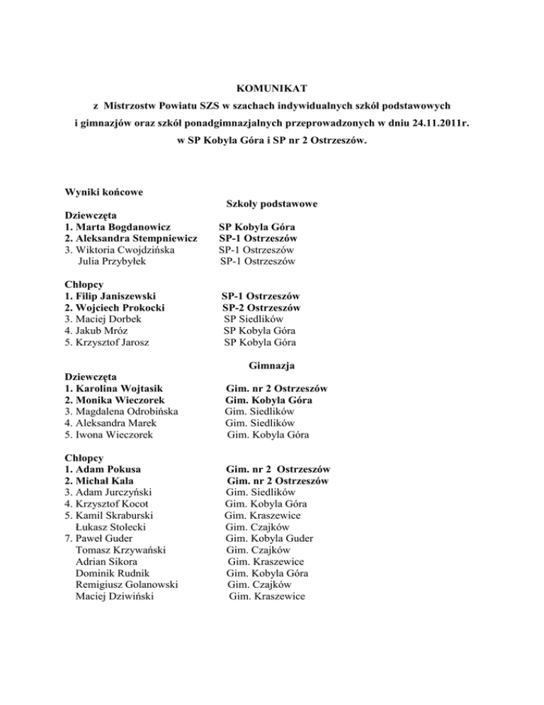 KOMUNIKAT z Mistrzostw Powiatu SZS w szachach indywidualnych szkół podstawowych i gimnazjów oraz szkół ponadgimnazjalnych przeprowadzonych w dniu 24.11.2011r. w SP Kobyla Góra i SP nr 2 Ostrzeszów. Wyniki końcowe Szkoły podstawowe Dziewczęta 1. Marta Bogdanowicz 2. Aleksandra Stempniewicz 3. Wiktoria Cwojdzińska Julia Przybyłek SP Kobyla Góra SP-1 Ostrzeszów SP-1 Ostrzeszów SP-1 Ostrzeszów Chłopcy 1. Filip Janiszewski 2. Wojciech Prokocki 3. Maciej Dorbek 4. Jakub Mróz 5. Krzysztof Jarosz SP-1 Ostrzeszów SP-2 Ostrzeszów SP Siedlików SP Kobyla Góra SP Kobyla Góra Gimnazja Dziewczęta 1. Karolina Wojtasik 2. Monika Wieczorek 3. Magdalena Odrobińska 4. Aleksandra Marek 5. Iwona Wieczorek Gim. nr 2 Ostrzeszów Gim. Kobyla Góra Gim. Siedlików Gim. Siedlików Gim. Kobyla Góra Chłopcy 1. Adam Pokusa 2. Michał Kala 3. Adam Jurczyński 4. Krzysztof Kocot 5. Kamil Skraburski Łukasz Stolecki 7. Paweł Guder Tomasz Krzywański Adrian Sikora Dominik Rudnik Remigiusz Golanowski Maciej Dziwiński Gim. nr 2 Ostrzeszów Gim. nr 2 Ostrzeszów Gim. Siedlików Gim. Kobyla Góra Gim. Kraszewice Gim. Czajków Gim. Kobyla Guder Gim. Czajków Gim. Kraszewice Gim. Kobyla Góra Gim. Czajków Gim. Kraszewice Szkoły ponadgimnazjalne Dziewczęta: 1. Anna Wieczorek 2. Benita Nolbert 3. Anita Calik I LO Ostrzeszów ZS nr 1 Ostrzeszów I LO Ostrzeszów Chłopcy: 1. Konrad Wojtasik 2. Daniel Dolata 3. Michał Gardyza 4. Mikołaj Masłowski Hubert Szkopek Maciej Piórek 7. Tomasz Borusewicz Kacper Bacik Kacper Bogdanowicz Dawid Owczarek Krzysztof Błażejczyk I LO Ostrzeszów ZS nr 1 Ostrzeszów I LO Ostrzeszów I LO Ostrzeszów I LO Ostrzeszów I LO Ostrzeszów I LO Ostrzeszów I LO Ostrzeszów I LO Ostrzeszów ZS nr 1 Ostrzeszów I LO Ostrzeszów Pierwszych dwóch zawodników/czek w każdej kategorii uzyskało awans do Finału Wojewódzkiego, które odbędą się dla szkół podstawowych i gimnazjów 10.12.2011r. o godz. 10.00 w Poznaniu (SP: Szkoła Podstawowa nr 46 ul. Inowrocławska 19; gimnazja: Zespół Szkół Łączności ul. Przełajowa 4), dla szkół ponadgimnazjalnych 17.12.2011r. o godz. 10.00 w Koninie (Szkoła Podstawowa nr 4, ul. Błaszaka 4). Godzina i miejsce wyjazdu podane zostaną w terminie późniejszym na naszej stronie (na finał każdy uczestnik zabiera obowiązkowo zegar szachowy i komplet szachów). . Sędzia główny: Renata Pokusa