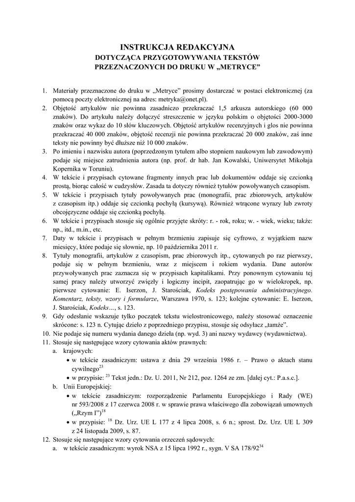 INSTRUKCJA REDAKCYJNA DOTYCZĄCA PRZYGOTOWYWANIA TEKSTÓW PRZEZNACZONYCH DO DRUKU W „METRYCE” 1. Materiały przeznaczone do druku w „Metryce” prosimy dostarczać w postaci elektronicznej (za pomocą poczty elektronicznej na adres: [email protected]). 2. Objętość artykułów nie powinna zasadniczo przekraczać 1,5 arkusza autorskiego (60 000 znaków). Do artykułu należy dołączyć streszczenie w języku polskim o objętości 2000-3000 znaków oraz wykaz do 10 słów kluczowych. Objętość artykułów recenzyjnych i glos nie powinna przekraczać 40 000 znaków, objętość recenzji nie powinna przekraczać 20 000 znaków, zaś inne teksty nie powinny być dłuższe niż 10 000 znaków. 3. Po imieniu i nazwisku autora (poprzedzonym tytułem albo stopniem naukowym lub zawodowym) podaje się miejsce zatrudnienia autora (np. prof. dr hab. Jan Kowalski, Uniwersytet Mikołaja Kopernika w Toruniu). 4. W tekście i przypisach cytowane fragmenty innych prac lub dokumentów oddaje się czcionką prostą, biorąc całość w cudzysłów. Zasada ta dotyczy również tytułów powoływanych czasopism. 5. W tekście i przypisach tytuły powoływanych prac (monografii, prac zbiorowych, artykułów z czasopism itp.) oddaje się czcionką pochyłą (kursywą). Również wtrącone wyrazy lub zwroty obcojęzyczne oddaje się czcionką pochyłą. 6. W tekście i przypisach stosuje się ogólnie przyjęte skróty: r. - rok, roku; w. - wiek, wieku; także: np., itd., m.in., etc. 7. Daty w tekście i przypisach w pełnym brzmieniu zapisuje się cyfrowo, z wyjątkiem nazw miesięcy, które podaje się słownie, np. 10 października 2011 r. 8. Tytuły monografii, artykułów z czasopism, prac zbiorowych itp., cytowanych po raz pierwszy, podaje się w pełnym brzmieniu, wraz z miejscem i rokiem wydania. Dane autorów przywoływanych prac zaznacza się w przypisach kapitalikami. Przy ponownym cytowaniu tej samej pracy należy utworzyć zwięzły i logiczny incipit, zaopatrując go w wielokropek, np. pierwsze cytowanie: E. Iserzon, J. Starościak, Kodeks postępowania administracyjnego. Komentarz, teksty, wzory i formularze, Warszawa 1970, s. 123; kolejne cytowanie: E. Iserzon, J. Starościak, Kodeks…, s. 123. 9. Gdy odesłanie wskazuje tylko początek tekstu wielostronicowego, należy stosować oznaczenie skrócone: s. 123 n. Cytując dzieło z poprzedniego przypisu, stosuje się odsyłacz „tamże”. 10. Nie podaje się numeru wydania danego dzieła (np. wyd. 3) ani nazwy wydawcy (wydawnictwa). 11. Stosuje się następujące wzory cytowania aktów prawnych: a. krajowych: w tekście zasadniczym: ustawa z dnia 29 września 1986 r. – Prawo o aktach stanu cywilnego23 w przypisie: 23 Tekst jedn.: Dz. U. 2011, Nr 212, poz. 1264 ze zm. [dalej cyt.: P.a.s.c.]. b. Unii Europejskiej: w tekście zasadniczym: rozporządzenie Parlamentu Europejskiego i Rady (WE) nr 593/2008 z 17 czerwca 2008 r. w sprawie prawa właściwego dla zobowiązań umownych („Rzym I”)18 w przypisie: 18 Dz. Urz. UE L 177 z 4 lipca 2008, s. 6 n.; sprost. Dz. Urz. UE L 309 z 24 listopada 2009, s. 87. 12. Stosuje się następujące wzory cytowania orzeczeń sądowych: a. w tekście zasadniczym: wyrok NSA z 15 lipca 1992 r., sygn. V SA 178/9234 b. w przypisie: 34 ONSA 1993, nr 1, poz. 20 z glosą aprobującą B. Adamiak, „Przegląd Sądowy” 1994, nr 11-12, s. 135 n. 13. Stosuje się następujące wzory przypisów z odesłaniami literaturowymi: a. W. Chróścielewski, Organ administracji publicznej w postępowaniu administracyjnym, Warszawa 2002, s. 98. b. J. Dobkowski, Kodeks dobrej administracji Rady Europy (geneza – charakter – treści), [w:] Kodyfikacja postępowania administracyjnego. Na 50-lecie K.p.a., red. J. Niczyporuk, Lublin 2010, s. 129-144. c. H. Knysiak-Molczyk [w:] H. Knysiak-Molczyk, A. Mudrecki, Czynności procesowe zawodowego pełnomocnika w sprawach administracyjnych i sądowoadministracyjnych, red. H. Knysiak-Molczyk, Warszawa 2011, s. 155. d. M. Gurdek, Status prawny kierownika urzędu stanu cywilnego, „Samorząd Terytorialny” 2008, nr 7-8, s. 113. e. J. Starościak, Na marginesie projektu Kodeksu postępowania administracyjnego, „Państwo i Prawo” 1959, z. 4, s. 684 n. f. W. Bar, Pochodzenie dziecka i władza rodzicielska w prawie rodzinnym państw islamskich, „Studia z Prawa Wyznaniowego” 2004, nr 7, s. 221-232. 14. Wszystkie powoływane po raz pierwszy akty prawne powinny mieć odesłanie wskazujące na ich adres publikacyjny (tekst jednolity – o ile posiadają). W przypadku aktów powoływanych wielokrotnie należy utworzyć skrót i stosować go konsekwentnie w dalszej części tekstu, np.: 21 Ustawa z dnia 25 lutego 1964 r. – Kodeks rodzinny i opiekuńczy (Dz. U. Nr 9, poz. 59 ze zm.) [dalej cyt.: K.r.o.]. 15. Odwołania do stron internetowych należy podawać w przypisach i tworzyć następująco: http://orzeczenia.nsa.gov.pl albo http://www.usc.pl/profesjonalisci/art_file/53.pdf – w miarę możliwości podając datę dostępu, w której taka informacja na wskazanej stronie się znajdowała, np. [dostęp on-line: 31 maja 2015 r.].