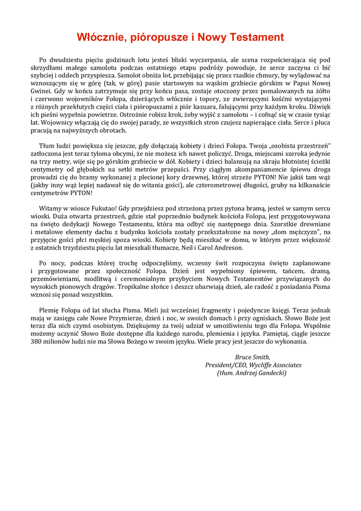 Włócznie, pióropusze i Nowy Testament Po dwudziestu pięciu godzinach lotu jesteś bliski wyczerpania, ale scena rozpościerająca się pod skrzydłami małego samolotu podczas ostatniego etapu podróży powoduje, że serce zaczyna ci bić szybciej i oddech przyspiesza. Samolot obniża lot, przebijając się przez rzadkie chmury, by wylądować na wznoszącym się w górę (tak, w górę) pasie startowym na wąskim grzbiecie górskim w Papui Nowej Gwinei. Gdy w końcu zatrzymuje się przy końcu pasa, zostaje otoczony przez pomalowanych na żółto i czerwono wojowników Folopa, dzierżących włócznie i topory, ze zwierzęcymi kośćmi wystającymi z różnych przekłutych części ciała i pióropuszami z piór kazuara, falującymi przy każdym kroku. Dźwięk ich pieśni wypełnia powietrze. Ostrożnie robisz krok, żeby wyjść z samolotu – i cofnąć się w czasie tysiąc lat. Wojownicy włączają cię do swojej parady, ze wszystkich stron czujesz napierające ciała. Serce i płuca pracują na najwyższych obrotach. Tłum ludzi powiększa się jeszcze, gdy dołączają kobiety i dzieci Folopa. Twoja „osobista przestrzeń” zatłoczona jest teraz tyloma obcymi, że nie możesz ich nawet policzyć. Droga, miejscami szeroka jedynie na trzy metry, wije się po górskim grzbiecie w dół. Kobiety i dzieci balansują na skraju błotnistej ścieżki centymetry od głębokich na setki metrów przepaści. Przy ciągłym akompaniamencie śpiewu droga prowadzi cię do bramy wykonanej z plecionej kory drzewnej, której strzeże PYTON! Nie jakiś tam wąż (jakby inny wąż lepiej nadawał się do witania gości), ale czterometrowej długości, gruby na kilkanaście centymetrów PYTON! Witamy w wiosce Fukutao! Gdy przejdziesz pod strzeżoną przez pytona bramą, jesteś w samym sercu wioski. Duża otwarta przestrzeń, gdzie stał poprzednio budynek kościoła Folopa, jest przygotowywana na święto dedykacji Nowego Testamentu, która ma odbyć się następnego dnia. Szorstkie drewniane i metalowe elementy dachu z budynku kościoła zostały przekształcone na nowy „dom mężczyzn”, na przyjęcie gości płci męskiej spoza wioski. Kobiety będą mieszkać w domu, w którym przez większość z ostatnich trzydziestu pięciu lat mieszkali tłumacze, Neil i Carol Andreson. Po nocy, podczas której trochę odpoczęliśmy, wczesny świt rozpoczyna święto zaplanowane i przygotowane przez społeczność Folopa. Dzień jest wypełniony śpiewem, tańcem, dramą, przemówieniami, modlitwą i ceremonialnym przybyciem Nowych Testamentów przywiązanych do wysokich pionowych drągów. Tropikalne słońce i deszcz ubarwiają dzień, ale radość z posiadania Pisma wznosi się ponad wszystkim. Plemię Folopa od lat słucha Pisma. Mieli już wcześniej fragmenty i pojedyncze księgi. Teraz jednak mają w zasięgu całe Nowe Przymierze, dzień i noc, w swoich domach i przy ogniskach. Słowo Boże jest teraz dla nich czymś osobistym. Dziękujemy za twój udział w umożliwieniu tego dla Folopa. Wspólnie możemy uczynić Słowo Boże dostępne dla każdego narodu, plemienia i języka. Pamiętaj, ciągle jeszcze 380 milionów ludzi nie ma Słowa Bożego w swoim języku. Wiele pracy jest jeszcze do wykonania. Bruce Smith, President/CEO, Wycliffe Associates (tłum. Andrzej Gandecki)