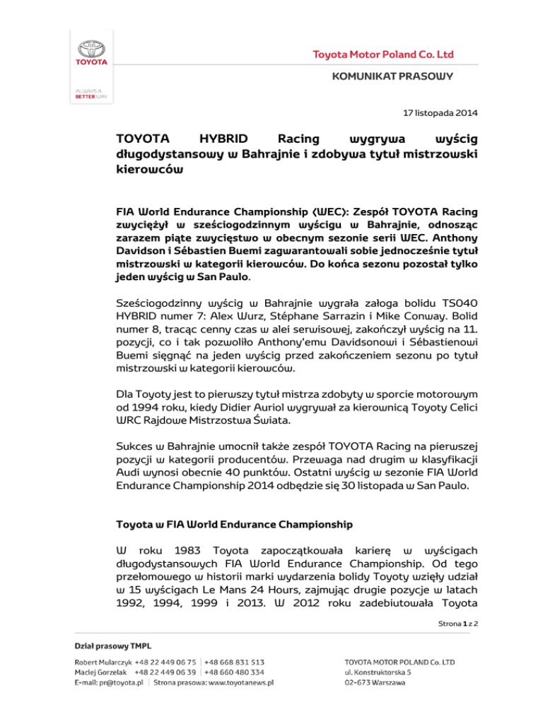 17 listopada 2014 TOYOTA HYBRID Racing wygrywa wyścig długodystansowy w Bahrajnie i zdobywa tytuł mistrzowski kierowców FIA World Endurance Championship (WEC): Zespół TOYOTA Racing zwyciężył w sześciogodzinnym wyścigu w Bahrajnie, odnosząc zarazem piąte zwycięstwo w obecnym sezonie serii WEC. Anthony Davidson i Sébastien Buemi zagwarantowali sobie jednocześnie tytuł mistrzowski w kategorii kierowców. Do końca sezonu pozostał tylko jeden wyścig w San Paulo. Sześciogodzinny wyścig w Bahrajnie wygrała załoga bolidu TS040 HYBRID numer 7: Alex Wurz, Stéphane Sarrazin i Mike Conway. Bolid numer 8, tracąc cenny czas w alei serwisowej, zakończył wyścig na 11. pozycji, co i tak pozwoliło Anthony’emu Davidsonowi i Sébastienowi Buemi sięgnąć na jeden wyścig przed zakończeniem sezonu po tytuł mistrzowski w kategorii kierowców. Dla Toyoty jest to pierwszy tytuł mistrza zdobyty w sporcie motorowym od 1994 roku, kiedy Didier Auriol wygrywał za kierownicą Toyoty Celici WRC Rajdowe Mistrzostwa Świata. Sukces w Bahrajnie umocnił także zespół TOYOTA Racing na pierwszej pozycji w kategorii producentów. Przewaga nad drugim w klasyfikacji Audi wynosi obecnie 40 punktów. Ostatni wyścig w sezonie FIA World Endurance Championship 2014 odbędzie się 30 listopada w San Paulo. Toyota w FIA World Endurance Championship W roku 1983 Toyota zapoczątkowała karierę w wyścigach długodystansowych FIA World Endurance Championship. Od tego przełomowego w historii marki wydarzenia bolidy Toyoty wzięły udział w 15 wyścigach Le Mans 24 Hours, zajmując drugie pozycje w latach 1992, 1994, 1999 i 2013. W 2012 roku zadebiutowała Toyota Strona 1 z 2 zadebiutowała w serii ponownie, z modelem TS030, w pełni hybrydowym bolidem startującym w klasie prototypów LMP1. Nowy samochód pierwsze zwycięstwo odniósł już podczas swojego trzeciego wyścigu. Łącznie po dwóch sezonach startów ma na koncie 5 zwycięstw. Bolid został zaprojektowany i zbudowany przez Toyota Motorsport GmbH (TMG) z Kolonii, gdzie siedzibę ma cały zespół wyścigowy. W przeszłości w TMG umiejscowiony był także zespół Toyota World Rally i fabryczny zespół Formuły 1. W roku 1998 TMG wydała na świat bolid TS020, który startował w wyścigach Le Mans 24 Hours w latach 1998-99. Obecnie TMG łączy uczestnictwo w motorsporcie z rozwojem zaawansowanej technologii, dostarczanej firmom zewnętrznym oraz rodzinie seryjnych modeli Toyoty. www.toyotahybridracing.com Strona 2 z 2
