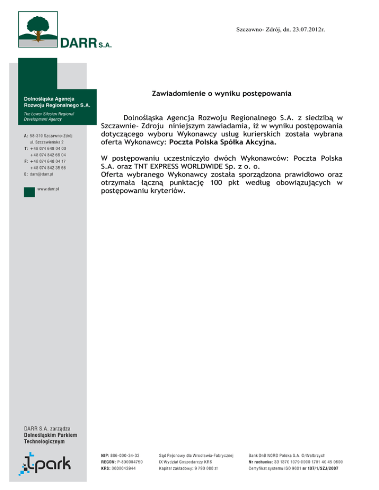 Szczawno- Zdrój, dn. 23.07.2012r. Zawiadomienie o wyniku postępowania Dolnośląska Agencja Rozwoju Regionalnego S.A. z siedzibą w Szczawnie- Zdroju niniejszym zawiadamia, iż w wyniku postępowania dotyczącego wyboru Wykonawcy usług kurierskich została wybrana oferta Wykonawcy: Poczta Polska Spółka Akcyjna. W postępowaniu uczestniczyło dwóch Wykonawców: Poczta Polska S.A. oraz TNT EXPRESS WORLDWIDE Sp. z o. o. Oferta wybranego Wykonawcy została sporządzona prawidłowo oraz otrzymała łączną punktację 100 pkt według obowiązujących w postępowaniu kryteriów.