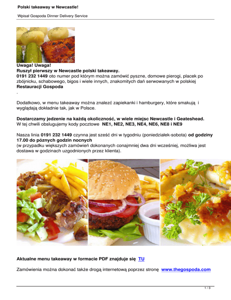 Polski takeaway w Newcastle! Wpisał Gospoda Dinner Delivery Service Uwaga! Uwaga! Ruszył pierwszy w Newcastle polski takeaway. 0191 232 1449 oto numer pod którym można zamówić pyszne, domowe pierogi, placek po zbójnicku, schabowego, bigos i wiele innych, znakomitych dań serwowanych w polskiej Restauracji Gospoda . Dodatkowo, w menu takeaway można znalezć zapiekanki i hamburgery, które smakują i wyglądają dokładnie tak, jak w Polsce. Dostarczamy jedzenie na każdą okoliczność, w wiele miejsc Newcastle i Geateshead. W tej chwili obslugujemy kody pocztowe NE1, NE2, NE3, NE4, NE6, NE8 i NE9 Nasza linia 0191 232 1449 czynna jest sześć dni w tygodniu (poniedziałek-sobota) od godziny 17.00 do póznych godzin nocnych (w przypadku większych zamówień dokonanych conajmniej dwa dni wcześniej, możliwa jest dostawa w godzinach uzgodnionych przez klienta). Aktualne menu takeaway w formacie PDF znajduje się TU Zamówienia można dokonać także drogą internetową poprzez stronę www.thegospoda.com 1/3 Polski takeaway w Newcastle! Wpisał Gospoda Dinner Delivery Service UWAGA PROMOCJA NA START! Tylko do końca czerwca do wszystkich zamówień przez telefon dołączamy kartę promocyjną z 5 Funtami upustu na zamówienia dokonane w jednym z wybranych miejsc: Restauracja Gospoda, Gospoda Dinner Delivery Service, Cloister Cafe. Zapraszamy! Uwaga! Uwaga! Ruszył pierwszy w Newcastle polski takeaway. 0191 232 1449 oto numer pod którym można zamówić pyszne, domowe pierogi, placek po zbójnicku, schabowego, bigos i wiele innych, znakomitych dań serwowanych w polskiej Restauracji Gospoda. Dodatkowo, w menu takeaway można znalezć zapiekanki i hamburgery, które smakują i wyglądają dokładnie tak, jak w Polsce. Dostarczamy jedzenie na każdą okoliczność, w wiele miejsc Newcastle i Geateshead. W tej chwili obslugujemy kody pocztowe NE1, NE2, NE3, NE4, NE6, NE8 i NE9 Nasza linia 0191 232 1449 czynna jest sześć dni w tygodniu (poniedziałek-sobota) od godziny 17.00 do póznych godzin nocnych (w przypadku większych zamówień dokonanych conajmniej dwa dni wcześniej, możliwa jest dostawa w godzinach uzgodnionych przez klienta). Aktualne menu takeaway w formacie PDF znajduje się TU Zamówienia można dokonać także drogą internetową poprzez stronę www.just-eat.co.uk 2/3 Polski takeaway w Newcastle! Wpisał Gospoda Dinner Delivery Service UWAGA PROMOCJA NA START! Tylko do końca czerwca do wszystkich zamówień przez telefon dołączamy kartę promocyjną z 5 Funtami upustu na zamówienia dokonane w jednym z wybranych miejsc: Restauracja Gospoda, Gospoda Dinner Delivery Service, Cloister Cafe. Zapraszamy! 3/3