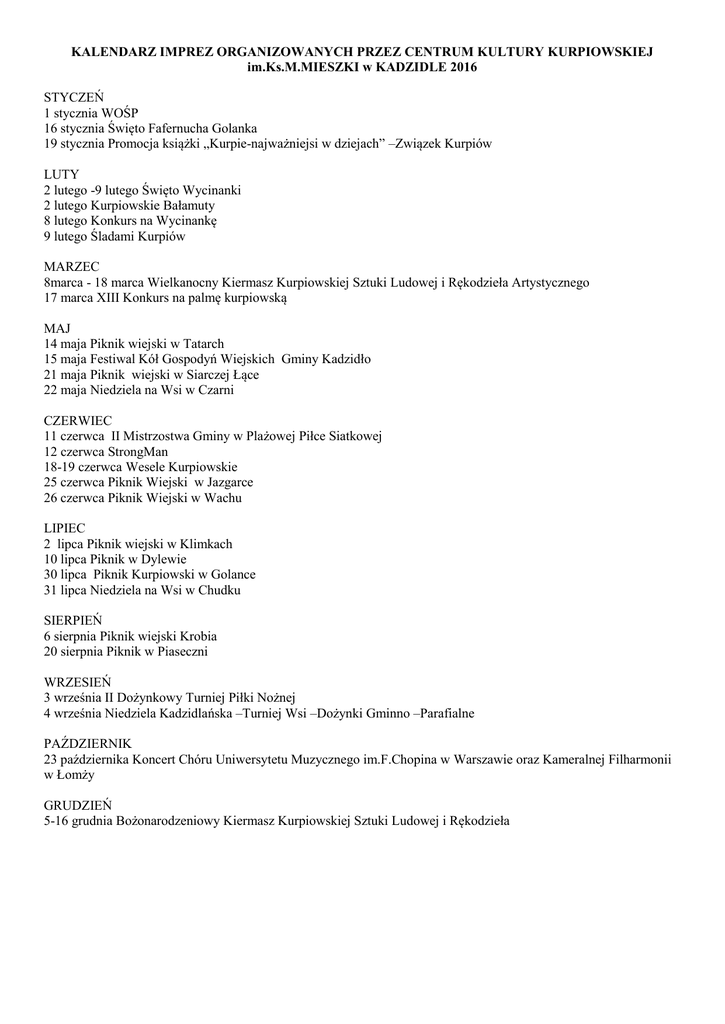 KALENDARZ IMPREZ ORGANIZOWANYCH PRZEZ CENTRUM KULTURY KURPIOWSKIEJ im.Ks.M.MIESZKI w KADZIDLE 2016 STYCZEŃ 1 stycznia WOŚP 16 stycznia Święto Fafernucha Golanka 19 stycznia Promocja książki „Kurpie-najważniejsi w dziejach” –Związek Kurpiów LUTY 2 lutego -9 lutego Święto Wycinanki 2 lutego Kurpiowskie Bałamuty 8 lutego Konkurs na Wycinankę 9 lutego Śladami Kurpiów MARZEC 8marca - 18 marca Wielkanocny Kiermasz Kurpiowskiej Sztuki Ludowej i Rękodzieła Artystycznego 17 marca XIII Konkurs na palmę kurpiowską MAJ 14 maja Piknik wiejski w Tatarch 15 maja Festiwal Kół Gospodyń Wiejskich Gminy Kadzidło 21 maja Piknik wiejski w Siarczej Łące 22 maja Niedziela na Wsi w Czarni CZERWIEC 11 czerwca II Mistrzostwa Gminy w Plażowej Piłce Siatkowej 12 czerwca StrongMan 18-19 czerwca Wesele Kurpiowskie 25 czerwca Piknik Wiejski w Jazgarce 26 czerwca Piknik Wiejski w Wachu LIPIEC 2 lipca Piknik wiejski w Klimkach 10 lipca Piknik w Dylewie 30 lipca Piknik Kurpiowski w Golance 31 lipca Niedziela na Wsi w Chudku SIERPIEŃ 6 sierpnia Piknik wiejski Krobia 20 sierpnia Piknik w Piaseczni WRZESIEŃ 3 września II Dożynkowy Turniej Piłki Nożnej 4 września Niedziela Kadzidlańska –Turniej Wsi –Dożynki Gminno –Parafialne PAŹDZIERNIK 23 października Koncert Chóru Uniwersytetu Muzycznego im.F.Chopina w Warszawie oraz Kameralnej Filharmonii w Łomży GRUDZIEŃ 5-16 grudnia Bożonarodzeniowy Kiermasz Kurpiowskiej Sztuki Ludowej i Rękodzieła