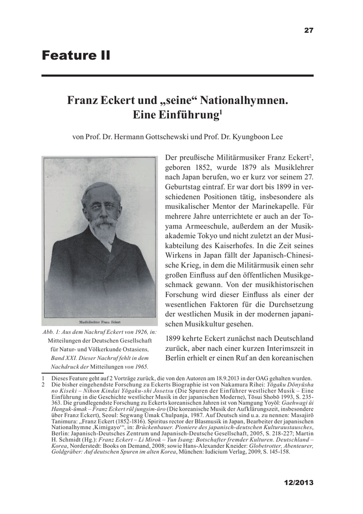 27 Feature II Franz Eckert und „seine“ Nationalhymnen. Eine Einführung1 von Prof. Dr. Hermann Gottschewski und Prof. Dr. Kyungboon Lee Abb. 1: Aus dem Nachruf Eckert von 1926, in: Mitteilungen der Deutschen Gesellschaft für Natur- und Völkerkunde Ostasiens, Band XXI. Dieser Nachruf fehlt in dem Nachdruck der Mitteilungen von 1965. Der preußische Militärmusiker Franz Eckert2, geboren 1852, wurde 1879 als Musiklehrer nach Japan berufen, wo er kurz vor seinem 27. Geburtstag eintraf. Er war dort bis 1899 in verschiedenen Positionen tätig, insbesondere als musikalischer Mentor der Marinekapelle. Für mehrere Jahre unterrichtete er auch an der Toyama Armeeschule, außerdem an der Musikakademie Tokyo und nicht zuletzt an der Musikabteilung des Kaiserhofes. In die Zeit seines Wirkens in Japan fällt der Japanisch-Chinesische Krieg, in dem die Militärmusik einen sehr großen Einfluss auf den öffentlichen Musikgeschmack gewann. Von der musikhistorischen Forschung wird dieser Einfluss als einer der wesentlichen Faktoren für die Durchsetzung der westlichen Musik in der modernen japanischen Musikkultur gesehen. 1899 kehrte Eckert zunächst nach Deutschland zurück, aber nach einer kurzen Interimszeit in Berlin erhielt er einen Ruf an den koreanischen 1 Dieses Feature geht auf 2 Vorträge zurück, die von den Autoren am 18.9.2013 in der OAG gehalten wurden. 2 Die bisher eingehendste Forschung zu Eckerts Biographie ist von Nakamura Rihei: Yōgaku Dōnyūsha no Kiseki ‒ Nihon Kindai Yōgaku-shi Josetsu (Die Spuren der Einführer westlicher Musik ‒ Eine Einführung in die Geschichte westlicher Musik in der japanischen Moderne), Tōsui Shobō 1993, S. 235363. Die grundlegendste Forschung zu Eckerts koreanischen Jahren ist von Namgung Yoyŏl: Gaehwagi ŭi Hanguk-ŭmak ‒ Franz Eckert rŭl jungsim-ŭro (Die koreanische Musik der Aufklärungszeit, insbesondere über Franz Eckert), Seoul: Segwang Ŭmak Chulpanja, 1987. Auf Deutsch sind u.a. zu nennen: Masajirō Tanimura: „Franz Eckert (1852-1816). Spiritus rector der Blasmusik in Japan, Bearbeiter der japanischen Nationalhymne ,Kimigayo‘“, in: Brückenbauer. Pioniere des japanisch-deutschen Kulturaustausches, Berlin: Japanisch-Deutsches Zentrum und Japanisch-Deutsche Gesellschaft, 2005, S. 218-227; Martin H. Schmidt (Hg.): Franz Eckert ‒ Li Mirok ‒ Yun Isang: Botschafter fremder Kulturen. Deutschland ‒ Korea, Norderstedt: Books on Demand, 2008; sowie Hans-Alexander Kneider: Globetrotter, Abenteurer, Goldgräber: Auf deutschen Spuren im alten Korea, München: Iudicium Verlag, 2009, S. 145-158. 12/2013 28 Hof als Lehrer für Militärmusik. Korea war zu dieser Zeit ‒ mindestens nominell ‒ ein eigenständiges Kaiserreich. So wirkte Eckert ab 1901 in Seoul. Dort erlebte er 1905 die Errichtung des japanischen Protektorates, 1910 die endgültige Annexion Koreas durch Japan und 1914 den Beginn des Ersten Weltkrieges, in dem Deutschland zur Feindesmacht wurde. Jedes dieser Ereignisse muss Eckert auch als Gefahr für seine Existenzgrundlage erlebt haben. Dennoch konnte er seine Tätigkeit in Seoul, wenngleich unter erschwerten Bedingungen, so lange fortsetzen, bis ihm seine Krebserkrankung, an der er 1916 starb, es nicht mehr erlaubte. Eckerts Grab in Seoul kann auch heute noch besichtigt werden. Insgesamt waren es also 35 Jahre, die Eckert in Asien gewirkt hat, davon 20 in Japan und 15 in Korea. In dieser gesamten Zeit ist Eckert auch Mitglied der OAG gewesen. Erst mit zehn Jahren Verspätung erschien 1926 in den OAG-Nachrichten ein Nachruf Eckerts3, da die OAG um 1916 wegen ihrer Situation im Feindesland zu Zeiten des Ersten Weltkrieges kaum handlungsfähig war und nicht publizieren konnte. Sowohl in Japan als auch in Korea war Eckert maßgeblich an der Schaffung von Nationalhymnen beteiligt. In Japan wurde Eckert 1880, also ein Jahr nach seinem Dienstantritt, in eine Kommission berufen, die eine neue Melodie für die damals von der Marinekapelle gespielte Nationalhymne Kimigayo bestimmen sollte. Eckerts Votum war entscheidend für die Auswahl der Abb. 2: Grabinschrift: auch heute noch als japanische National„Hier ruht in Gott Herr Franz Eckert hymne gesungenen Melodie. Eckert harKgl. preuss. Musikdirektor, monisierte diese Melodie und arrangierte geb. den 5. April 1852, gest. den 6. August 1916 sie für Militärkapelle (siehe Abb. 3).4 Seine R I P“ Bearbeitung wird bis heute standardmäßig von Militär- und anderen Blaskapellen gespielt. Die Melodie selbst war von zeitgenössischen japanischen Hofmusikern in einem Stil komponiert worden, der Elemente der japanischen Hofmusik Gagaku mit Elementen westlicher Musik verband. 3 Siehe Bildlegende zu Abbildung 1 4 Eckerts Darstellung der Ereignisse wird im Wesentlichen durch die auf japanischen Quellen beruhenden Forschungen japanischer Historiker bestätigt. Siehe z.B. Yamada Yoshio: Kimigayo no rekishi, Tokyo: Hōbunkan, 1956 (reprint 1995), S. 143–148. Dort sind auch die anderen an dem Auswahlprozess beteiligten Personen namentlich genannt. Vereinfachende Darstellungen für die japanische Öffentlichkeit neigen dazu, die Rolle Eckerts zu marginalisieren (vgl. Tanimura, a.a.O. S. 226–27). OAG Notizen 29 Abb. 3: Franz Eckert über die Entstehung der japanischen Nationalhymne in Mittheilungen der Deutschen Gesellschaft für Natur- und Völkerkunde Ostasiens, Band III, Heft 23 (1881), S. 131. In Korea wurde Eckert bald nach seiner Ankunft ein ähnlicher Auftrag zuteil. Als Ergebnis entstand 1901-02 die überhaupt allererste offizielle koreanische Nationalhymne. Über deren Entstehungsprozess ist allerdings weniger Genaues bekannt als im Fall der japanischen Nationalhymne. Bis vor kurzem hatte man als sicher angenommen, dass Eckert die Melodie der koreanischen Hymne nicht nur ausgewählt, sondern selbst komponiert habe. Durch einen Zufallsfund Gottschewskis entdeckten wir jedoch bei unseren gemeinsamen Forschungen, dass es sich auch bei dieser Melodie nicht um eine Neukomposition Ec