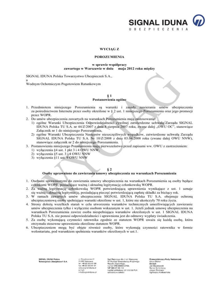 WYCIĄG Z POROZUMIENIA w sprawie współpracy zawartego w Warszawie w dniu maja 2012 roku między SIGNAL IDUNA Polska Towarzystwo Ubezpieczeń S.A., a Wodnym Ochotniczym Pogotowiem Ratunkowym §1 Postanowienia ogólne 1. Przedmiotem niniejszego Porozumienia są warunki i zasady zawierania umów ubezpieczenia za pośrednictwem Internetu przez osoby określone w § 2 ust. 1 niniejszego Porozumienia oraz jego promocji przez WOPR. 2. Do umów ubezpieczenia zawartych na warunkach Porozumienia mają zastosowanie: 1) ogólne Warunki Ubezpieczenia Odpowiedzialności cywilnej zatwierdzone uchwałą Zarządu SIGNAL IDUNA Polska TU S.A. nr 44/Z/2007 z dnia 8 sierpnia 2007 roku, zwane dalej „OWU OC”, stanowiące Załącznik nr 1 do niniejszego Porozumienia, 2) ogólne Warunki Ubezpieczenia Następstw nieszczęśliwych wypadków, zatwierdzone uchwałą Zarządu SIGNAL IDUNA Polska TU S.A. Nr 10/Z/2008 z dnia 03.04.2008 roku (zwane dalej OWU NNW), stanowiące załącznik nr 2 do niniejszego Porozumienia. 3. Postanowienia niniejszego Porozumienia mają pierwszeństwo przed zapisami ww. OWU z zastrzeżeniem: 1) wyłączenia §4 ust. 1 pkt 3 i 4 OWU NNW, 2) wyłączenia §5 ust. 3 i 4 OWU NNW 3) wyłączenia §11 ust. 9 OWU NNW §2 Osoby uprawnione do zawierania umowy ubezpieczenia na warunkach Porozumienia 1. Osobami uprawnionymi do zawierania umowy ubezpieczenia na warunkach Porozumienia są osoby będące członkami WOPR, posiadające ważną i aktualną legitymację członkowską WOPR. 2. Za ważną legitymację członkowską WOPR potwierdzającą uprawnienia wynikające z ust. 1 uznaje się ważną i aktualną legitymację, posiadającą pieczęć potwierdzającą zapłatę składki za bieżący rok. 3. W ramach zawartych umów ubezpieczenia SIGNAL IDUNA Polska TU S.A. obejmuje ochroną ubezpieczeniową osoby spełniające warunki określone w ust. 1, które nie ukończyły 70 roku życia. 4. Strony dołożą wszelkich starań w celu utworzenia warunków technicznych umożliwiających zawieranie umów ubezpieczenia tylko i wyłącznie osobom wskazanym w ust. 1. Jeżeli jednak umowę ubezpieczenia na warunkach Porozumienia zawrze osoba niespełniająca warunków określonych w ust. 1 SIGNAL IDUNA Polska TU S.A. nie ponosi odpowiedzialności i uprawniona jest do odmowy wypłaty świadczenia. 5. Za osobę wykonującą czynności ratownika zgodnie ze statutem WOPR uważa się każdą osobę, która otrzymała stosowne uprawnienia określone statutem WOPR. 6. Ubezpieczeniem mogą być objęte również osoby, które wykonują czynności ratownika w formie wolontariatu, pod warunkiem spełnienia warunków określonych w ust.1. §3 Zawieranie umowy ubezpieczenia 1. Zawieranie umowy ubezpieczenia przez osobę uprawnioną na warunkach Porozumienia następuje za pośrednictwem Internetu i przy użyciu odpowiedniej aplikacji informatycznej. 2. Korzystanie z aplikacji informatycznej możliwe będzie za pośrednictwem strony internetowej www.wopr.pl. 3. Użytkownik – Ubezpieczający, po uruchomieniu aplikacji będzie mógł dokonać porównania wariantów ubezpieczenia, zapoznać się z postanowieniami OWU oraz części Porozumienia dotyczącej przedmiotu i zakresu ubezpieczenia, sum ubezpieczenia oraz wysokości składek (zawartych w § 5, 6, 7 Porozumienia) dotyczącego zakresu ubezpieczenia, a następnie po wypełnieniu wymaganych pól przejść do etapu zawarcia umowy ubezpieczenia (uzyskać ochronę ubezpieczeniową). Jednym z wymaganych pól będzie złożenie przez osobę przystępującą do ubezpieczenia oświadczenia o spełnianiu warunków określonych w § 2 i o poprawności przedstawionych danych osobowych, którego zakres określony został w załączniku nr 2 do niniejszej umowy. Proces zawierania umowy ubezpieczenia na warunkach Porozumienia zamyka etap opłacenia składki ubezpieczeniowej. Po opłaceniu składki ubezpieczeniowej osoba uprawniona otrzyma na podany adres e-mail potwierdzenie udzielenia ochrony ubezpieczeniowej przez SIGNAL IDUNA Polska TU S.A., w którym zawarte zostaną wszystkie istotne informacje (ww. potwierdzenie wg wzoru określonego w Załączniku nr 3). §5 Przedmiot i zakres ubezpieczenia 1. Przedmiotem ubezpieczenia są: 1) następstwa nieszczęśliwych wypadków w związku z wykonywaniem czynności ratownika, 2) odpowiedzialność cywilna z tytułu wykonywania czynności ratownika. 2. Zakres ubezpieczenia odpowiedzialności cywilnej obejmuje szkody osobowe i rzeczowe wynikające z popełnienia czynu niedozwolonego przez osoby wykonujące czynności ratownika. Ochrona ubezpieczeniowa nie obejmuje szkód: 1) wyrządzonych wskutek rażącego niedbalstwa, 2) OC za produkt, 3) spowodowanych nieprzestrzeganiem przepisów BHP 4) powstałych pod wpływem alkoholu lub środków odurzających. 3. Zakres ubezpieczenia następstw nieszczęśliwych wypadków obejmuje śmierć lub trwały uszczerbek na zdrowiu powstały wskutek nieszczęśliwego wypadku w związku z wykonywaniem czynności ratownika (ochrona ubezpieczeniowa jest ograniczona czasowo do wypadków powstałych podczas wykonywania czynności ratownika). 4. Zakres terytorialny odpowiedzialności ubezpieczyciela obejmuje: 1) dla ubezpieczenia odpowiedzialności cywilnej (Wariant I, IIA i III) - teren Rzeczpospolitej Polskiej, 2) dla ubezpieczenia odpowiedzialności cywilnej (Wariant IIB) - teren Rzeczpospolitej Polskiej i Europy, 3) dla ubezpieczenia następstw nieszczęśliwych wypadków - teren całego świata. 1. Do umów ubezpieczenia zawartych na warunkach Porozumienia będą miały zastosowanie wyłączenia wskazane w OWU OC oraz OWU NNW. §6 Sumy ubezpieczenia (warianty ubezpieczenia) 1. Na warunkach niniejszego Porozumienia mogą być zawierane umowy z następującymi sumami i limitami ubezpieczenia: WARIANT Suma ubezpieczenia NNW (trwały uszczerbek) Suma ubezpieczenia NNW (śmierć) Suma gwarancyjna OC I 10 000,00 zł 5 000,00 zł 30 000,00 zł IIA 25 000,00 zł 12 500,00 zł 100 000,00 zł IIB 25 000,00 zł 