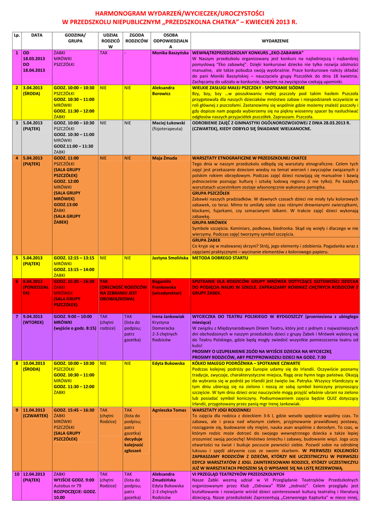HARMONOGRAM WYDARZEŃ/WYCIECZEK/UROCZYSTOŚCI W PRZEDSZKOLU NIEPUBLICZNYM „PRZEDSZKOLNA CHATKA” – KWIECIEŃ 2013 R. Lp. DATA GODZINA/ GRUPA UDZIAŁ ZGODA OSOBA RODZICÓ RODZICÓW ODPOWIEDZIALN WYDARZENIE W A TAK Monika Baszyńska WEWNĄTRZPRZEDSZKOLNY KONKURS „EKO-ZABAWKA” W Naszym przedszkolu organizowany jest konkurs na najładniejszą i najbardziej pomysłową “Eko zabawkę”. Dzięki konkursowi dziecko nie tylko rozwija zdolności manualne, ale także pobudza swoją wyobraźnie. Prace konkursowe należy składać do pani Moniki Baszyńskiej – nauczyciela grupy Pszczółek do dnia 18 kwietnia. Zachęcamy do udziału w konkursie, bowiem na zwycięzców czekają upominki. NIE NIE Aleksandra WIELKIE ZASŁUGI MAŁEJ PSZCZOŁY - SPOTKANIE SIÓDME Borowicz Bzy, bzy, bzy …w poszukiwaniu małej pszczoły pod takim hasłem Pszczoła przygotowała dla naszych dzieciaków mnóstwo zabaw i niespodzianek oczywiście w roli głównej z pszczołami. Zastanowimy się wspólnie gdzie możemy znaleźć pszczoły i gdy dopisze nam pogoda wybierzemy się na piękny wiosenny spacer by nasłuchiwać odgłosów naszych przyjaciółek pszczółek. Zapraszam. Pszczoła. NIE NIE Maciej Łukowski ODROBIENIE ZAJĘĆ Z GIMNASTYKI OGÓLNOROZWOJOWEJ Z DNIA 28.03.2013 R. (fizjoterapeuta) (CZWARTEK), KIEDY ODBYŁO SIĘ ŚNIADANIE WIELKANOCNE. 1 OD 18.03.2013 DO 18.04.2013 ŻABKI MRÓWKI PSZCZÓŁKI 2 3.04.2013 (ŚRODA) 3 5.04.2013 (PIĄTEK) 4 5.04.2013 (PIĄTEK) GODZ. 10:00 – 10:30 PSZCZÓŁKI GODZ. 10:30 – 11:00 MRÓWKI GODZ. 11:30 – 12:00 ŻABKI GODZ. 10:00 – 10:30 PSZCZÓŁKI GODZ. 10:30 – 11:00 MRÓWKI GODZ.11:00 – 11:30 ŻABKI GODZ. 11:00 PSZCZÓŁKI (SALA GRUPY PSZCZÓŁEK) GODZ. 12:00 MRÓWKI (SALA GRUPY MRÓWEK) GODZ.13:00 ŻABKI (SALA GRUPY ŻABEK) 5 5.04.2013 (PIĄTEK) 6 8.04.2013 (PONIEDZIAŁ EK) 7 9.04.2013 (WTOREK) GODZ. 9:00 – 10:00 TAK MRÓWKI (chętni (wyjście o godz. 8:15) rodzice) 8 10.04.2013 (ŚRODA) GODZ. 10:00 – 10:30 PSZCZÓŁKI GODZ. 10:30 – 11:00 MRÓWKI GODZ. 11:30 – 12:00 ŻABKI 9 11.04.2013 (CZWARTEK) GODZ. 15:45 – 16:30 ŻABKI MRÓWKI PSZCZÓŁKI (SALA GRUPY PSZCZÓŁEK) 10 12.04.2013 (PIĄTEK) GODZ. 12:15 – 13:15 MRÓWKI GODZ. 13:15 – 14:00 ŻABKI GODZ. 15:30 – 16:30 ŻABKI MRÓWEK (SALA GRUPY PSZCZÓŁEK) NIE NIE NIE NIE TAK (OBECNOŚĆ RODZICÓW NA ZEBRANIU JEST OBOWIĄZKOWA) Maja Żmuda WARSZTATY ETNOGRAFICZNE W PRZEDSZKOLNEJ CHATCE Tego dnia w naszym przedszkolu odbędą się warsztaty etnograficzne. Celem tych zajęć jest przekazanie dzieciom wiedzy na temat wierzeń i zwyczajów związanych z polskim rokiem obrzędowym. Podczas zajęć dzieci rozwijają się manualnie i bawią jednocześnie poznając kulturę i sztukę ludową regionu (i nie tylko). Po każdych warsztatach uczestnikom zostaje własnoręcznie wykonana pamiątka. GRUPA PSZCZÓŁEK Zabawki naszych pradziadków. W dawnych czasach dzieci nie miały tylu kolorowych zabawek, co teraz. Mimo to umilały sobie czas różnymi drewnianymi zwierzątkami, klockami, fujarkami, czy szmacianymi lalkami. W trakcie zajęć dzieci wykonają zabawkę. GRUPA MRÓWEK Symbole szczęścia. Kominiarz, podkowa, biedronka. Skąd się wzięły i dlaczego w nie wierzymy. Podczas zajęć tworzymy symbol szczęścia. GRUPA ŻABEK Co kryje się w malowanej skrzyni? Strój, jego elementy i zdobienia. Pogadanka wraz z zajęciami praktycznymi – wycinanie elementów z kolorowego papieru. Justyna Smolińska METODA DOBREGO STARTU Bogumiła Frankowska (wicedyrektor) SPOTKANIE DLA RODZICÓW GRUPY MRÓWEK DOTYCZĄCE GOTOWOŚCI DZIECKA DO PODJĘCIA NAUKI W SZKOLE. ZAPRASZAMY RÓWNIEŻ CHĘTNYCH RODZICÓW Z GRUPY ŻABEK. TAK (lista do podpisu; patrz gazetka) Irena Jankowiak Krystyna Domeracka 2-3 chętnych Rodziców NIE NIE Edyta Bukowska TAK (chętni Rodzice) TAK (lista do podpisu; patrz gazetka) decyduje kolejność zgłoszeń Agnieszka Tomas TAK (lista do podpisu; patrz gazetka) Aleksandra Zmudzińska Edyta Bukowska 2-3 chętnych Rodziców WYCIECZKA DO TEATRU POLSKIEGO W BYDGOSZCZY (przeniesiona z ubiegłego miesiąca) W związku z Międzynarodowym Dniem Teatru, który jest z jednym z najważniejszych dni obchodzonych w naszym przedszkolu dzieci z grupy Żabek i Mrówek wybiorą się do Teatru Polskiego, gdzie będą mogły zwiedzić wszystkie pomieszczenia teatru od kulis! PROSIMY O UZUPEŁNIENIE ZGÓD NA WYJŚCIE DZIECKA NA WYCIECZKĘ PROSIMY RODZICÓW, ABY PRZYPROWADZILI DZIECI NA GODZ. 7:30 KÓŁKO MAŁEGO PODRÓŻNIKA – SPOTKANIE CZWARTE Podczas kolejnej podróży po Europie udamy się do Irlandii. Oczywiście poznamy tradycje, zwyczaje, charakterystyczne miejsca, flagę oraz hymn tego państwa. Okazją do wybrania się w podróż po Irlandii jest święto św. Patryka. Wszyscy Irlandczycy w tym dniu ubierają się na zielono i noszą ze sobą symbol koniczyny przynoszący szczęście. W tym dniu dzieci oraz nauczyciele mogą przyjść właśnie ubrani na zielono lub posiadać symbol koniczyny. Podsumowaniem zajęcia będzie QUIZ dotyczący Irlandii, przygotowany przez panią mgr Irenę Jankowiak. WARSZTATY JOGI RODZINNEJ To zajęcia dla rodzica z dzieckiem 3-6 l, gdzie wesoło spędzicie wspólny czas. To zabawa, ale i praca nad własnym ciałem, przyjmowanie prawidłowej postawy, rozciąganie się, budowanie siły mięśni, nauka asan wspólnie z dorosłym. To czas, w którym rodzic może dotrzeć do swojego wewnętrznego dziecka a także lepiej zrozumieć swoją pociechę! Mnóstwo śmiechu i zabawy, budowanie więzi. Joga uczy otwartości na świat i buduje poczucie pewności siebie. Pozwól sobie na odrobinę luksusu i spędź aktywnie czas ze swoim skarbem. W PIERWSZEJ KOLEJNOŚCI ZAPRASZAMY RODZICÓW Z DZIEĆMI, KTÓRZY NIE UCZESTNICZYLI W PIERWSZEJ EDYCJI WARSZTATÓW Z JOGI. ZAINTERESOWANI RODZICE, KTÓRZY UCZESTNICZYLI JUŻ W WARSZTATACH PROSZENI SĄ O WPISANIE SIĘ NA LISTĘ REZERWOWĄ. VI PRZEGLĄD TEATRZYKÓW PRZEDSZKOLNYCH Nasze Żabki wezmą udział w VI Przeglądanie Teatrzyków Przeds
