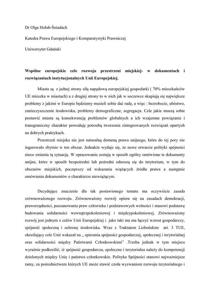 Dr Olga Hołub-Śniadach Katedra Prawa Europejskiego i Komparatystyki Prawniczej Uniwersytet Gdański Wspólne europejskie cele rozwoju przestrzeni miejskiej- w dokumentach i rozwiązaniach instytucjonalnych Unii Europejskiej. Miasta są z jednej strony siłą napędową europejskiej gospodarki ( 70% mieszkańców UE mieszka w miastach) a z drugiej strony to w nich jak w soczewce skupiają się największe problemy z jakimi w Europie będziemy musieli sobie dać radę, a więc : bezrobocie, ubóstwo, zanieczyszczenie środowiska, problemy demograficzne, segregacja. Cele jakie muszą sobie postawić miasta są konsekwencją problemów globalnych a ich wzajemne powiązanie i transgraniczny charakter powoduję potrzebą tworzenia zintegrowanych rozwiązań opartych na dobrych praktykach. Przestrzeń miejska nie jest naturalną domeną prawa unijnego, które do tej pory nie ingerowało zbytnio w ten obszar. Jednakże wydaje się, że nowe otwarcie polityki spójności nieco zmienia tą sytuację. W opracowaniu zostają w sposób ogólny omówione te dokumenty unijne, które w sposób bezpośredni lub pośredni odnoszą się do terytorium, w tym do obszarów miejskich, począwszy od wskazania wiążących źródła prawa a następnie omówieniu dokumentów o charakterze niewiążącym. Decydujące znaczenie dla tak postawionego tematu ma oczywiście zasada zrównoważonego rozwoju. Zrównoważony rozwój opiera się na zasadach demokracji, praworządności, poszanowania praw człowieka i podstawowych wolności i stanowi podstawę budowania solidarności wewnątrzpokoleniowej i międzypokoleniowej. Zrównoważony rozwój jest jednym z celów Unii Europejskiej i jako taki ma ma łączyć wzrost gospodarczy, spójność społeczną i ochronę środowiska. Wraz z Traktatem Lizbońskim art. 3 TUE, określający cele Unii wskazał na „ spierania spójności gospodarczej, społecznej i terytorialnej oraz solidarności między Państwami Członkowskimi” .Trzeba jednak w tym miejscu wyraźnie podkreślić, iż spójność gospodarcza, społeczne i terytorialna należy do kompetencji dzielonych między Unię i państwa członkowskie. Polityka Spójności stanowi najważniejsze ramy, za pośrednictwem których UE może stawić czoła wyzwaniom rozwoju terytorialnego i pomóc wyzwolić potencjał terytorialny na szczeblu lokalnym, regionalnym, krajowym i ponadnarodowym. Sposób definiowania tego celu, wskazuje również jego powiązanie z innym celem czyli wspierania harmonijnego rozwoju całej Unii. Spójność jest tu rozumiana jako dążenie do zmniejszenia dysproporcji w poziomach rozwoju różnych regionów. Głównym narzędziem instytucjonalnym Unii w zakresie realizowania tego celu są fundusze strukturalne. Europejski Fundusz Społeczny – jest najstarszym funduszem strukturalnym UE i służy rozwiązywaniu problemów społecznych. Ogólne ramy funkcjonowania EFS znajdują się w TFUE (art. 162-164 TFUE). Europejski Fundusz Rozwoju Regionalnego (EFRR) jest podstawowym instrumentem finansowym polityki spójności. Aktualnie ogólne ramy funkcjonowania EFRR wyznacza art. 176 TFUE, zgodnie z którym celem funduszu jest „przyczynianie się do korygowania podstawowych dysproporcji regionalnych w Unii poprzez udział w rozwoju i dostosowaniu strukturalnym regionów opóźnionych w rozwoju oraz w przekształceniu upadających regionów przemysłowych”. Obecnie EFRR finansuje przedsięwzięcia inwestycyjne: inwestycje produkcyjne, inwestycje w infrastrukturę, działania wspierające rozwój regionalny i lokalny, obejmujący wsparcie i usługi dla przedsiębiorstw oraz pomoc techniczną. . Cele zakreślone w art. 3 TUE zostały również potwierdzone w dokumencie stanowiącym aktualny drogowskaz rozwoju Unii w strategii Europa 2020. Strategia Europa 2020 jest programem rozwoju społeczno-gospodarczego Unii Europejskiej (Europa 2020 – Strategia na rzecz inteligentnego i zrównoważonego rozwoju sprzyjającego włączeniu społecznemu), który zastąpił Strategię Lizbońską realizowaną od 2000 r. W strategii Europa 2020 wskazano na potrzebę wspólnego działania państw członkowskich Unii Europejskiej na rzecz wychodzenia z kryzysu oraz wprowadzania reform umożliwiających sprostanie wyzwaniom wynikającym z globalizacji, starzenia się społeczeństw oraz racjonalnego wykorzystywania zasobów. Strategia opiera się na trzech współzależnych priorytetach: inteligentny wzrost, zrównoważony wzrost, polegający na transformacji w kierunku gospodarki niskoemisyjnej, efektywnie korzystającej z zasobów i konkurencyjnej; wzrost sprzyjający włączeniu społecznemu mający na celu wspieranie gospodarki o wysokim poziomie zatrudnienia, która będzie zapewniać spójność gospodarczą, społeczną oraz terytorialną. W systemie konwencyjnym Rady Europy funkcjonuje również : Europejska Konwencja Krajobrazowa- 2000 r- Konwencja Rady Europy ( nie jest to więc prawo unijne sensu stricto). Jest to pierwszy dokument międzynarodowy , który koncentruje się na krajobrazie i podkreśla jego istotny wkład w jakość życia. Konwencja stosuje się do całego terytorium – w tym do obszarów miejskich a jej celem jest promowanie ochrony, gospodarki i planowania krajobrazu. Prawo unijne , jak już zostało wskazane nie obejmuje swoim zakresem regulacji dotyczących miast, ponieważ jest to domena prawa krajowego. Jednak współcześnie można zaobserwować zjawisko rozlewania się prawa unijnego na nowe obszary prawa. Proces ten w dużej mierze wynika, z faktu , iż jesteśmy świadkami „ kurczenia się „ świata oraz natężenia problemów o charakterze ponadnarodowym. Dlatego też kiedy przyjrzeć się bliżej problemom współczesnej przestrzeni miejskiej, z perspektywy unijnej, widać iż pewne działania o charakterze transgranicznym już zostały podjęte. EPRP- Europejska Perspektywa Rozwoju Przestrzennego- pierwszy dokument ramowy, przyjęty w 1999r. w Poczdamie, obejmujący swoim z