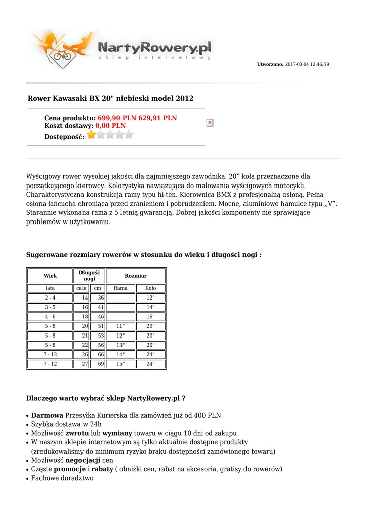 Utworzono: 2017-03-04 12:46:39 Rower Kawasaki BX 20" niebieski model 2012 Cena produktu: 699,90 PLN 629,91 PLN Koszt dostawy: 0,00 PLN Dostępność: Wyścigowy rower wysokiej jakości dla najmniejszego zawodnika. 20” koła przeznaczone dla początkującego kierowcy. Kolorystyka nawiązująca do malowania wyścigowych motocykli. Charakterystyczna konstrukcja ramy typu hi-ten. Kierownica BMX z profesjonalną osłoną. Pełna osłona łańcucha chroniąca przed zranieniem i pobrudzeniem. Mocne, aluminiowe hamulce typu „V”. Starannie wykonana rama z 5 letnią gwarancją. Dobrej jakości komponenty nie sprawiające problemów w użytkowaniu. Sugerowane rozmiary rowerów w stosunku do wieku i długości nogi : Wiek lata Długość nogi cale cm Rozmiar Rama Koło 2-4 14 36 12" 3-5 16 41 14" 4-6 18 46 16" 5-8 20 51 11" 20" 5-8 21 53 12" 20" 5-8 22 56 13" 20" 7 - 12 26 66 14" 24" 7 - 12 27 69 15" 24" Dlaczego warto wybrać sklep NartyRowery.pl ? ● ● ● ● ● ● ● Darmowa Przesyłka Kurierska dla zamówień już od 400 PLN Szybka dostawa w 24h Możliwość zwrotu lub wymiany towaru w ciągu 10 dni od zakupu W naszym sklepie internetowym są tylko aktualnie dostępne produkty (zredukowaliśmy do minimum ryzyko braku dostępności zamówionego towaru) Możliwość negocjacji cen Częste promocje i rabaty ( obniżki cen, rabat na akcesoria, gratisy do rowerów) Fachowe doradztwo ● ● ● ● ● ● Pozytywne opinie w niezależnych serwisach m.in. Opineo, Allegro i porównywarkach cen Możliwość zakupu na raty - obsługujemy systemy Żagiel i Cetelem Sprzedajemy rowery wyregulowane i przesmarowane Do każdego zamówienia otrzymasz paragon lub fakturę stanowiący podstawę gwarancji Szczegółowe informacje o statusie zamówienia i wysyłce na adres e-mail podany w zamówieniu Obsługujemy płatności internetowe i Paypal Dołożono wszelkich starań, aby opisy i zdjęcia produktów były dokładne i aktualne. Specyfikacje i ceny mogą ulec zmianie bez uprzedzenia Płeć Dziecięcy Przeznaczenie Dla dzieci Widelec/ amortyzator - Manetki - Przerzutka przód - Przerzutka tył - Kaseta/ wolnobieg - Korbowód - Pedały - Hamulce - Piasta przód - Piasta tył - Obręcze - Szprychy - Kolekcja 2012 Opony - Stery - Mostek - Kierownica - Chwyty - Siodło - Sztyca - Waga - Rama - Hamulce - Damper - Pegi - Ilość biegów - Łańcuch - Gwarancja - Adres: http://nartyrowery.pl/ Telefon: 34 365 66 09, 793 61 04 29 Email: [email protected] Gadu-Gadu: Skype: