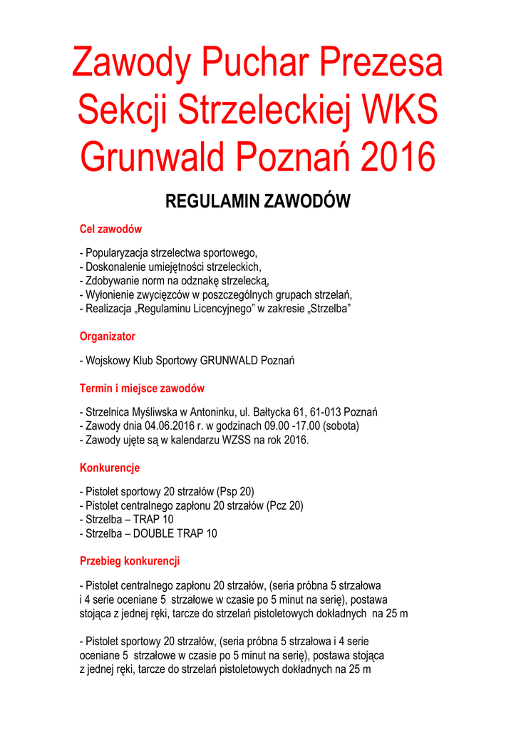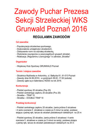 Zawody Puchar Prezesa Sekcji Strzeleckiej WKS Grunwald Poznań 2016 REGULAMIN ZAWODÓW Cel zawodów - Popularyzacja strzelectwa sportowego, - Doskonalenie umiejętności strzeleckich, - Zdobywanie norm na odznakę strzelecką, - Wyłonienie zwycięzców w poszczególnych grupach strzelań, - Realizacja „Regulaminu Licencyjnego” w zakresie „Strzelba” Organizator - Wojskowy Klub Sportowy GRUNWALD Poznań Termin i miejsce zawodów - Strzelnica Myśliwska w Antoninku, ul. Bałtycka 61, 61-013 Poznań - Zawody dnia 04.06.2016 r. w godzinach 09.00 -17.00 (sobota) - Zawody ujęte są w kalendarzu WZSS na rok 2016. Konkurencje - Pistolet sportowy 20 strzałów (Psp 20) - Pistolet centralnego zapłonu 20 strzałów (Pcz 20) - Strzelba – TRAP 10 - Strzelba – DOUBLE TRAP 10 Przebieg konkurencji - Pistolet centralnego zapłonu 20 strzałów, (seria próbna 5 strzałowa i 4 serie oceniane 5 strzałowe w czasie po 5 minut na serię), postawa stojąca z jednej ręki, tarcze do strzelań pistoletowych dokładnych na 25 m - Pistolet sportowy 20 strzałów, (seria próbna 5 strzałowa i 4 serie oceniane 5 strzałowe w czasie po 5 minut na serię), postawa stojąca z jednej ręki, tarcze do strzelań pistoletowych dokładnych na 25 m - Strzelba TRAP-10 Broń z lufami gładkimi której kaliber nie przekracza 12, odległość dolotu rzutków zgodnie z przepisami ISSF dla konkurencji TRAP, naboje zgodne z przepisami technicznymi ISSF dla konkurencji TRAP, rzutek prawidłowych 10 ( 10 pojedynczych ), czas: po sygnale START wydanym przez sędziego zawodnik musi w czasie 10 sekund przyjąć postawę strzelecką, załadować broń i dać sygnał do wyrzucenia rzutka, do każdego pojedynczego rzutka można oddać dwa strzały - Strzelba DOUBLE TRAP-10 Broń z lufami gładkimi której kaliber nie przekracza 12, odległość dolotu rzutków zgodnie z przepisami ISSF dla konkurencji D.TRAP, naboje zgodne z przepisami technicznymi ISSF dla konkurencji D.TRAP, rzutek prawidłowych 10 ( 5 dubletów ), czas: po sygnale START wydanym przez sędziego zawodnik musi w czasie 10 sekund przyjąć postawę strzelecką, załadować broń i dać sygnał do wyrzucenia rzutka, do każdego dubletu można oddać dwa strzały. Uczestnictwo Zawodnicy posiadający aktualne licencje PZSS . Klasyfikacja Klasyfikacja indywidualna w każdej konkurencji. Zgłoszenia Zgłoszenia indywidualne na strzelnicy podczas treningów w godz. 14:00 – 18:00 u trenerów lub telefonicznie. Zawodnicy, którzy nie będą zapisani na odpowiednią zmianę będą mogli odbyć strzelanie w zmianie wyznaczonej przez Sędziego Głównego (jeśli będą wolne stanowiska). Koszty uczestnictwa Startowe w konkurencjach kulowych 30 zł za osobostart, Startowe w konkurencjach śrutowych 30 zł za osobostart Broń i amunicja Broń i amunicja własna lub klubowa po wcześniejszym uzgodnieniu. Koszty amunicji przy użyczeniu: amunicja śrutowa 10 sztuk 15 zł., amunicji kulowa: 0,22 LR 25 sztuk 10 zł , 9mm Para – 25 sztuk- 35 zł. Postanowienia końcowe Zawody zostaną przeprowadzone zgodnie z powyższym regulaminem w oparciu o przepisy PZSS i ISSF O R G A N I Z A TO R