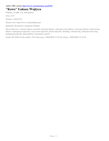 Adres URL strony http://www.motokatalog.org/8946 "Kowe" Łukasz Wojtyca Polanka, 32-400, woj. małopolskie Ulica: 219 Telefon: 510192732 Strona www: http://www.ochronalakieru.pl Kategorie: Kosmetyki i preparaty Polanka Słowa kluczowe: ochrona lakieru, powłoki ochronne lakieru, zabezpieczenie lakieru, renowacja lakieru, polerowanie lakieru, impregnacja tapicerki, czyszczenie tapicerki, pranie tapicerki, detailing, ochrona felg, zabezpieczenie felg, pielęgnacja pojazdu, diamondbrite, kosmetyka samoch Numer ID: 8946, liczba odsłon: 239, aktywacja: 19/03/2010 13:52:28, edycja: 19/03/2010 13:52:28 Strona 1 / 1
