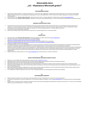 REGULAMIN AKCJI „LG – Klawiatura Microsoft gratis!” §1 POSTANOWIENIA OGÓLNE 1. 2. 3. Organizatorem Akcji jest TERG S.A. z siedzibą w Złotowie przy ul. Za Dworcem 1D, 77-400 Złotów, zarejestrowaną w Sądzie Rejonowym w Poznaniu Poznań Nowe Miasto i Wilda, IX Wydział Gospodarczy Krajowego Rejestru Sądowego pod numerem KRS 0000427063, nr NIP 767-10-04-218, o kapitale zakładowym w wysokości 37.875.000 PLN,(Organizator). Akcja pod hasłem „LG – Klawiatura Microsoft gratis!” organizowana jest w oparciu o niniejszy regulamin i prowadzona jest na stronie www.mediaexpert.pl Akcja pod hasłem „LG – Klawiatura Microsoft gratis!” obowiązuje na terytorium Rzeczpospolitej Polskiej w terminie od 06.04.2016 do 30.04.2016 lub wyczerpania zapasów. §2 WARUNKI UCZESTNICTWA W AKCJI 1. 2. 3. Uczestnikiem Akcji może być osoba, która posiada pełną zdolność do czynności prawnych (osoba, która ukończyła 18 lat i nie jest ubezwłasnowolniona częściowo lub całkowicie w rozumieniu kodeksu cywilnego. Osoby które nie posiadają pełnej zdolności do czynności prawnych mogą brać udział w akcji przy współudziale swojego przedstawiciela ustawowego/opiekuna prawnego) oraz zapoznała się z treścią niniejszego regulaminu i akceptuje jego postanowienia; Uczestnictwo w Akcji promocyjnej jest dobrowolne. Każdy Uczestnik biorący udział w Akcji potwierdza, że zapoznał się z niniejszym Regulaminem i w pełni go akceptuje. §3 ZASADY AKCJI 1. 2. 3. 4. 5. 6. Akcja pod hasłem „LG – Klawiatura Microsoft gratis!” obowiązuje wyłącznie w sklepie internetowym www. mediaexpert.pl Warunkiem skorzystania z promocji jest zakup telewizora LG LED 60UF695V: http://www.mediaexpert.pl/telewizory/telewizor-lg-led-60uf695v,id-387769 Kupujący przy zakupie produktu z pkt 2 par 3 otrzyma w prezencie klawiaturę MICROSOFT All-In-One Media: http://www.mediaexpert.pl/klawiatury/klawiatura-microsoft-all-in-one-media-keyboard-n9z-00022,id-235987 Promocje na produkt z pkt 2 par 3 nie sumują się. W przypadku zakupu na raty w okresie obowiązywania akcji warunkiem skorzystania z aktualnych promocji ratalnych jest indywidualna ocena zdolności kredytowej Klienta przez bank. W przypadku negatywnej odpowiedzi banku na wniosek kredytowy Klienta zostaną zaproponowane inne alternatywne formy płatności. (Wysokość rat zaprezentowanych w akcji nie zawiera ubezpieczenia. RRSO dla kredytu w opcji bez ubezpieczenia wynosi 0%. Minimalna wartość brutto towaru nabywanego w systemie ratalnym wynosi 100zł. Ubezpieczenie spłaty kredytu ma charakter dobrowolny i stanowi zabezpieczenie pożyczki/kredytu w momencie zgody Klienta na zawarcie umowy ubezpieczenia kredytu. Stopa procentowa dla kredytu 0% w zakresie od 3 do 40 miesięcy wynosi od 0% do 32,6% w zależności od wybranego banku i rodzaju ubezpieczenia.) Materiały reklamowe zaprezentowane na stronie www.mediaexpert.pl nie stanowią oferty w rozumieniu art.66§ 1K.C §4 ZASADY POSTĘPOWANIA REKLAMACJI ZAKUPU W AKCJI 1. 2. 3. 4. 5. 6. 7. Reklamacje co do przebiegu Akcji mogą być zgłaszane mailowo na adres [email protected]. Reklamacja powinna zawierać imię, nazwisko i adres do korespondencji składającego reklamację, jak również opis podstawy reklamacji. Reklamacja powinna zawierać żądanie określonego zachowania się przez Organizatora. Reklamujący zobowiązany jest wraz z reklamacją doręczyć wszelkie dokumenty oraz przytoczyć wszystkie okoliczności faktyczne bądź prawne uzasadniające żądanie. Reklamacje mogą być składane przez cały czas trwania Akcjii, jednak nie później niż w terminie 21 dni od dnia jej zakończenia. Reklamacje, które otrzyma Organizator po tej dacie nie będą rozpatrywane. Reklamacje rozpatrywane będą przez Organizatora w terminie 14 dni od dnia otrzymania reklamacji. O wyniku rozpatrzenia reklamacji Uczestnik zostanie poinformowany listem zwykłym lub drogą mailową w terminie 7 dni od daty rozpatrzenia reklamacji. Przy rozpatrywaniu reklamacji Organizator opiera się na treści niniejszego regulaminu oraz obowiązujących przepisach prawa polskiego. §5 POSTANOWIENIA KOŃCOWE 1. 2. 3. Niniejszy regulamin wchodzi w życie z dniem startu promocji podanym w §1 pkt.3 i dostępny jest na stronie internetowej Organizatora. W sprawach nieuregulowanych niniejszym Regulaminem ma zastosowanie Regulamin dostępny na stronie www.mediaexpert.pl oraz przepisy powszechnie obowiązującego prawa. Niniejsza Akcja nie jest grą losową ani zakładem wzajemnym, których wynik zależy od przypadku (przeprowadzenie losowania) w rozumieniu art. 2 ustawy z dnia 19 listopada 2009 roku o grach hazardowych (Dz. U. Nr 201 poz. 1540).