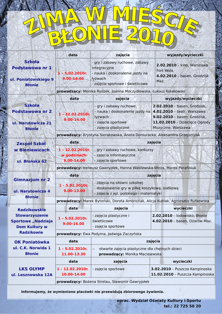 data Szkoła wyjazdy/wycieczki - gry i zabawy ruchowe, zabawy Podstawowa nr 1 2.02.2010 – kino, Warszawa integracyjne 1 – 5.02.2010r. ul. Poniatowskiego 9 zajęcia 9.00-14.00 Fort Wola, - nauka i doskonalenie jazdy na 4.02.2010 – basen, Grodzisk łyżwach Maz. - zajęcia sportowe i świetlicowe Błonie prowadzący: Monika Rydzek, Joanna Moczydłowska, Łukasz Kołakowski data zajęcia Szkoła Podstawowa nr 2 ul. Narutowicza 21 wyjazdy/wycieczki - gry i zabawy ruchowe, 2.02.2010 – basen, Grodzisk, - nauka i doskonalenie jazdy na 4.02.2010 – teatr, Warszawa 1 – 12.02.2010r. 9.00-14.00 Błonie łyżwach 9.02.2010 – basen, Grodzisk, - zajęcia sportowe 11.02.2010 – Dziecięce Ogrody - zajęcia plastyczne Muzyczne, Warszawa prowadzący: Krystyna Sierakowska, Aneta Domuracka, Aleksandra Grzejszczak Zespół Szkół data w Bieniewicach 1 – 12.02.2010r. w godzinach: ul. Błońska 62 9.00-14.00 zajęcia - gry i zabawy ruchowe, konkursy - zajęcia informatyczne - zajęcia sportowe prowadzący: Ireneusz Gawryołek, Hanna Wasilewska-Weiss, Marek Parafiniuk Gimnazjum nr 2 data 1 – 5.02.2010r. ul. Narutowicza 4 Błonie Radzikowskie Stowarzyszenie Sportowe „Nadzieja Dom Kultury w Radzikowie 9.00-13.00 zajęcia - zajęcia na siłowni szkolnej - doskonalenie gry w piłkę koszykową, siatkową - zajęcia z jęz. polskiego i matematyki prowadzący: Marek Bytoński, Dorota Ambroziak, Alicja Kubiak, Agnieszka Rutkowska data 1 – 5.02.2010r. 9.00-14.00 zajęcia wycieczki - zajęcia plastyczne i 2.02.2010 – lodowisko, Błonie świetlicowe 4.02.2010 – basen, Ożarów Maz. - zajęcia sportowe prowadzący: Ewa Podyma, Jadwiga Zaczyńska OK Poniatówka data ul. C.K. Norwida 1 1 – 5.02.2010r. Błonie 11.00-13.30 data LKS OLYMP 1 – 12.02.2010r. ul. Lesznowska 12A 10.00-14.00 zajęcia – otwarte zajęcia plastyczne dla chętnych dzieci prowadzący: Monika Maciejewska zajęcia - zajęcia sportowe wycieczki 3.02.2010 – Puszcza Kampinoska 11.02.2010 – Puszcza Kampinoska prowadzący: Bożena Strelau, Sławomir Gawryjołek Informujemy, że wymienione placówki nie przewidują zbiorowego żywienia. oprac. Wydział Oświaty Kultury i Sportu tel.: 22 725 50 20
