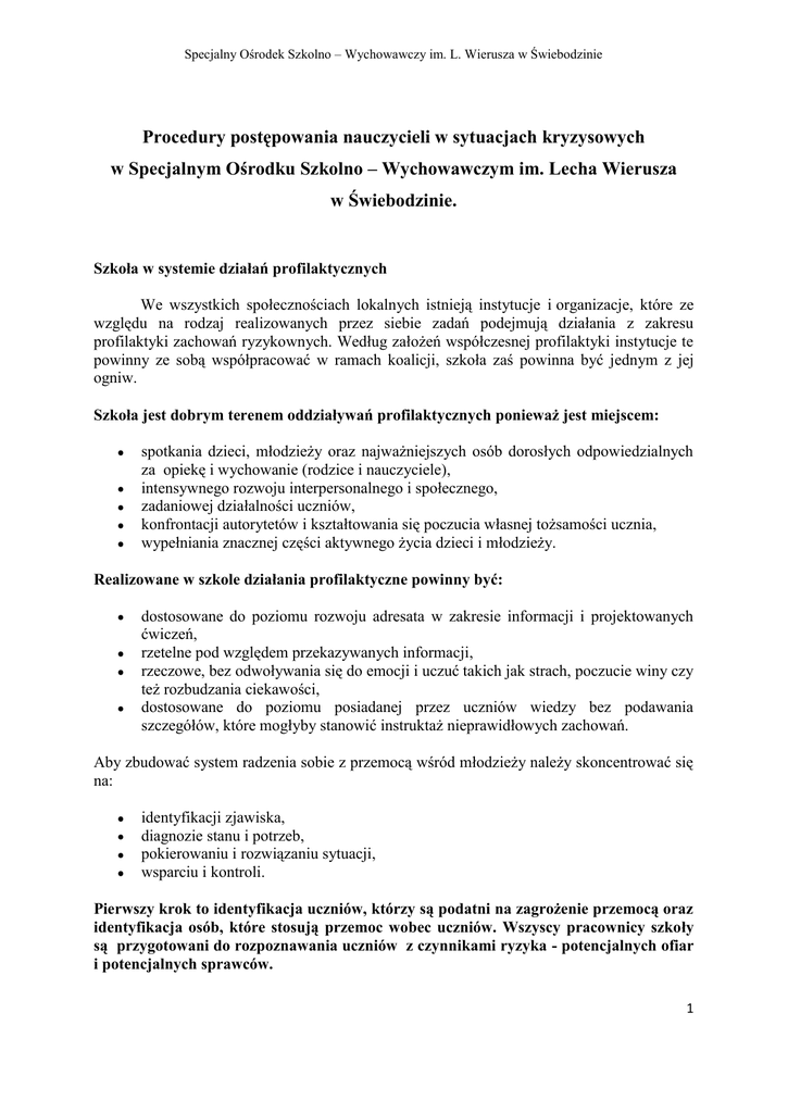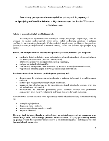 Specjalny Ośrodek Szkolno – Wychowawczy im. L. Wierusza w Świebodzinie Procedury postępowania nauczycieli w sytuacjach kryzysowych w Specjalnym Ośrodku Szkolno – Wychowawczym im. Lecha Wierusza w Świebodzinie. Szkoła w systemie działań profilaktycznych We wszystkich społecznościach lokalnych istnieją instytucje i organizacje, które ze względu na rodzaj realizowanych przez siebie zadań podejmują działania z zakresu profilaktyki zachowań ryzykownych. Według założeń współczesnej profilaktyki instytucje te powinny ze sobą współpracować w ramach koalicji, szkoła zaś powinna być jednym z jej ogniw. Szkoła jest dobrym terenem oddziaływań profilaktycznych ponieważ jest miejscem: spotkania dzieci, młodzieży oraz najważniejszych osób dorosłych odpowiedzialnych za opiekę i wychowanie (rodzice i nauczyciele), intensywnego rozwoju interpersonalnego i społecznego, zadaniowej działalności uczniów, konfrontacji autorytetów i kształtowania się poczucia własnej tożsamości ucznia, wypełniania znacznej części aktywnego życia dzieci i młodzieży. Realizowane w szkole działania profilaktyczne powinny być: dostosowane do poziomu rozwoju adresata w zakresie informacji i projektowanych ćwiczeń, rzetelne pod względem przekazywanych informacji, rzeczowe, bez odwoływania się do emocji i uczuć takich jak strach, poczucie winy czy też rozbudzania ciekawości, dostosowane do poziomu posiadanej przez uczniów wiedzy bez podawania szczegółów, które mogłyby stanowić instruktaż nieprawidłowych zachowań. Aby zbudować system radzenia sobie z przemocą wśród młodzieży należy skoncentrować się na: identyfikacji zjawiska, diagnozie stanu i potrzeb, pokierowaniu i rozwiązaniu sytuacji, wsparciu i kontroli. Pierwszy krok to identyfikacja uczniów, którzy są podatni na zagrożenie przemocą oraz identyfikacja osób, które stosują przemoc wobec uczniów. Wszyscy pracownicy szkoły są przygotowani do rozpoznawania uczniów z czynnikami ryzyka - potencjalnych ofiar i potencjalnych sprawców. 1 Specjalny Ośrodek Szkolno – Wychowawczy im. L. Wierusza w Świebodzinie Metody identyfikacji problemu 1. 2. 3. 4. 5. Rozmowy z uczniami poruszające ważne dla uczniów sprawy dotyczące ich społeczności - ankieta. Dyskusje na temat poczucia bezpieczeństwa dzieci w szkole, grupie rówieśniczej, środowisku pozaszkolnym, postaw wobec brutalizacji życia, przemocy w mediach itp. (na poziomie dostosowanym do wieku uczniów). Mitingi, apele, lekcje wychowawcze. Konkursy plastyczne lub inne formy przekazu przez sztukę. Wypracowania na dany temat, itp. Szkolne procedury postępowania w sprawach nieletnich Zadaniem opisanych poniżej procedur jest usprawnienie podejmowania przez szkołę działań w sytuacjach zagrożenia uczniów przestępczością i demoralizacją. Szkoła jako instytucja zwraca się do Policji o pomoc przede wszystkim w przypadkach określonych negatywnych zachowań uczniów. Ma to najczęściej miejsce, gdy akt agresji czy przemocy przyjmuje taki stopień nasilenia, że wykazuje znamiona przestępstwa. Takie okoliczności zachodzą w szczególności, gdy negatywne zachowania mają charakter utrwalony, powtarzający się, o znacznym zagrożeniu społecznym, a u ich podłoża leży demoralizacja, odrzucenie obowiązujących norm, społeczne niedostosowanie. Do podejmowania działań interwencyjnych w sytuacjach kryzysowych w szkole zobowiązuje Rozporządzenie Ministra Edukacji Narodowej i Sportu z dnia 31 stycznia 2003 r. w sprawie szczegółowych form działalności wychowawczej i zapobiegawczej wśród dzieci i młodzieży zagrożonych uzależnieniem. W myśl tego dokumentu szkoły i placówki podejmują działania interwencyjne polegające na powiadomieniu rodziców i Policji w sytuacjach kryzysowych, w szczególności, gdy dzieci i młodzież używają, posiadają lub rozprowadzają środki odurzające. Demoralizacja- naruszanie zasad współżycia społecznego, popełnienie czynu zabronionego, systematyczne uchylanie się od obowiązku szkolnego lub obowiązku nauki, włóczęgostwo, udział w działalności grup przestępczych – art.4 § 1ustawy o postępowaniu w sprawach nieletnich. Bójka (art. 158 kk) w rozumieniu prawa karnego jest to starcie fizyczne pomiędzy co najmniej trzema osobami, z których każda jednocześnie atakuje i broni się, zawierające poważny ładunek przemocy stwarzający niebezpieczeństwo utraty życia człowieka lub wystąpienia ciężkiego bądź średniego uszczerbku na zdrowiu. Nie jest bójką starcie dwóch osób. Ich zachowanie może natomiast stanowić inne przestępstwo, jak np. naruszenie nietykalności cielesnej, spowodowanie uszczerbku na zdrowiu, narażenie człowieka na niebezpieczeństwo, a nawet zabójstwo. Sąd Najwyższy bardzo szeroko interpretuje pojęcie udziału w bójce przyjmując, że sprawcą jest nie tylko osoba, która zadaje ciosy drugiej stronie, lecz także ten, kto w trakcie bójki zachęca innych do walki, ale sam czynnie w niej nie uczestniczy. Z uwagi na dynamiczny charakter bójki, może się ona po pewnym czasie przekształcić w pobicie. 2 Specjalny Ośrodek Szkolno – Wychowawczy im. L. Wierusza w Świebodzinie Okoliczności zaostrzające odpowiedzialność karną (typy kwalifikowane) skutek w postaci nieumyślnego spowodowania średniego lub ciężkiego uszczerbku na zdrowiu bądź śmierci (art. 158 § 2 i 3 kk), użycie broni palnej, noża lub innego podobnie niebezpiecznego przedmiotu (art. 159 kk). Bójka –ciężar gatunkowy -występek, przepis karny art. 158 § 1. K.k. grożąca kara -pozbawienia wolności do lat 3, forma winy- umyślna w zamiarze bezpośrednim, odpowiedzialność nieletnich –tak. Pobicie (art. 158 kk) w rozumieniu prawa karnego jest to napaść fizyczna co najmniej dwóch osób na jedną, przy czym strona atakująca zawsze posiada przewagę liczebną. Podobnie jak bójka, pobicie również zawiera poważny ładunek przemocy stwarza