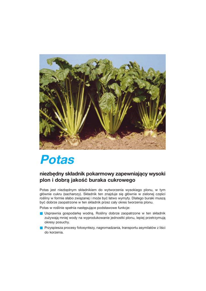 Potas niezbędny składnik pokarmowy zapewniający wysoki plon i dobrą jakość buraka cukrowego Potas jest niezbędnym składnikiem do wytworzenia wysokiego plonu, w tym głównie cukru (sacharozy). Składnik ten znajduje się głównie w zielonej części rośliny w formie słabo związanej i może być łatwo wymyty. Dlatego buraki muszą być dobrze zaopatrzone w ten składnik przez cały okres tworzenia plonu. Potas w roślinie spełnia następujące podstawowe funkcje: ■ Usprawnia gospodarkę wodną. Rośliny dobrze zaopatrzone w ten składnik zużywają mniej wody na wyprodukowanie jednostki plonu, lepiej przetrzymują okresy posuchy. ■ Przyspiesza procesy fotosyntezy, nagromadzania, transportu asymilatów z liści do korzenia. 1. Znaczenie potasu dla buraka cukrowego Spośród wszystkich składników pokarmowych burak cukrowy pobiera najwięcej potasu (rys. 1). 27,5 % AZOT (N) 41,2 % POTAS (K) 8,6 % SÓD (Na) 8,0 % WAPŃ (Ca) 4,6 % MAGNEZ (Mg) 4,0 % FOSFOR (P) 3,4 % SIARKA (S) 2,3 % CHLOR (Cl) 0,4 % MIKROELEMENTY ● ŻELAZO (Fe) ● MANGAN (Mn) ● BOR (B) ● CYNK (Zn) ● MIEDŹ (Cu) ● MOLIBDEN (Mo) Rysunek 1. Zawartość składników pokarmowych w plonie buraka cukrowego (50t korzeni i 40t liści) ■ Zwiększa jędrność roślin, odporność na niskie temperatury, choroby a także na mszyce. ■ Zwiększa zawartość cukru w buraku oraz jego wydatek w cukrowni na skutek zmniejszania zawartości azotu aminowego (szkodliwego). Podobną rolę w roślinie jak potas spełnia sód. Najwyższe plony cukru osiąga się gdy proporcje potasu do sodu w nawożeniu buraka wynoszą jak 1,7 do 1 (120 kg K2O i 80 kg Na2O na 1 ha). Nadmiar potasu lub sodu w buraku cukrowym utrudnia wydobycie cukru z korzeni i zwiększa jego straty w melasie. 2. Potas w glebie Całkowita zawartość potasu w glebach wynosi od 0,8 do 2,5 %. Jednak dla rolnika najważniejsza jest zawartość w warstwie uprawnej potasu w formie przyswajalnej dla roślin. Zawartość ta zależy od kategorii agronomicznej gleby, intensywności jej użytkowania, nawożenia, zmianowania roślin opadów itp. Najuboższe w potas, podobnie jak w sód, magnez i wapń są gleby lekkie, mało próchniczne, słabo nawożone, zalewane. Wieloletnia uprawa na tym samym polu roślin o dużych wymaganiach w stosunku do potasu, bez systematycznego wzbogacania gleby nawozami organicznymi i potasowymi może spowodować duże jej zubożenie nie tylko z potasu, ale i z innych składników. Taki stan grozi długotrwałym spadkiem plonów. Uszkodzone liście buraka w następstwie suszy oraz niewystarczającego zaopatrzenia roślin w potas Aby utrzymać stałą, wysoką produktywność gleby i wysoką efektywność nawożenia potasowego pod buraki, odczyn gleby należy utrzymywać w granicach pH 6,0 - 7,2. Kwaśny odczyn gleby (pH poniżej 6), jak i alkaliczny (pH powyżej 7,2) utrudnia roślinom pobieranie składników pokarmowych. Przy nadmiarze wapnia w glebie potas może być w nadmiernych, luksusowych ilościach pobierany przez rośliny lub wymywany przez wody opadowe w głębsze warstwy, do cieków i zbiorników wodnych. Gleby kwaśne najczęściej wykazują Rysunek 2. Wpływ odczynu gleby na zawartość składników pokarduży niedobór potasu. mowych roślin Siewki buraka cukrowego na polu, na którym zaniechano od wielu lat nawożenie potasem Buraki cukrowe na polu systematycznie i optymalnie nawożonym Badania IHAR wykonane w ponad 1000 próbach pobranych z gleb średnich, kompleksów pszennego bardzo dobrego i pszennego dobrego, pól przeznaczonych pod buraki, wykazały, że gleb o zawartości potasu poniżej średniej było 36 %, o średniej 32 %, wysokiej 13 % i bardzo wysokiej 19 %, sodu odpowiednio: 14 %, 44 %, 31 % i 11 %, magnezu odpowiednio: 31 %, 20 %, 12 % i 37 %. Badania te wykazały, że istnieje wyraźna zależność między odczynem gleb a zawartością w nich potasu (K), sodu (Na), magnezu (Mg) i fosforu (P). Świadczy to, że rolnik dbający o właściwy odczyn gleby, dla buraka dba również o dobrą jej zasobność w składniki pokarmowe roślin (rys. 2). Gleby przeznaczane pod buraki powinny wykazywać co najmniej średnią zawartość tych składników. Badania odczynu i zasobności gleb prowadzą Wojewódzkie Stacje Chemiczno-Rolnicze. Tabela 1. Pobranie potasu w plonie buraka cukrowego Część rośliny Plon korzeni (t) i pobranie K2O (kg) z ha 30 40 50 60 70 Liście 180 210 250 280 300 Korzenie 60 80 100 130 150 Ogółem 240 290 350 410 450 3. Potrzeby pokarmowe Ilość pobieranego potasu przez buraki cukrowe zależy od zasobności gleby, od wysokości plonu i ulistnienia odmian. Dwu do trzykrotnie więcej potasu znajduje się w plonie liści niż w plonie korzeni. Liście są więc dobrym źródłem potasu dla zbóż uprawianych po burakach (tab. 1). W przeliczeniu na jednostkę plonu (tona korzeni z odpowiednią masą liści), buraki mogą pobrać od 6 do ponad 8 kg, średnio 7 kg K2O. Luksusowe odżywianie buraków potasem prowadzi do pogorszenia jakości przemysłowej korzeni i paszowej liści. Pobieranie potasu ograniczają: susza, wysokie dawki magnezu lub azotu amonowego (siarczan amonu). Wapnowanie sprzyja pobieraniu potasu przez buraki. Niedobory potasu w burakach początkowo są mało dostrzegalne, ukryte. Upewnić się można poddając młode liście (po 50 - 60 dniach od wschodów), analizie chemicznej. Zawartość potasu może się wahać od 3,5 do 9 % K2O w suchej masie liści. Przy dużym niedoborze potasu buraki wykazują liście o wąskich blaszkach liściowych o, ciemnoniebieskozielonym, później żółtozielonym zabarwieniu, wcześniejsze więdnięcie i zasychanie najstarszych liści, wyraźnie osłabiony przyrost roślin. 4. Potrzeby nawozowe Przy ustalaniu ekonomicznie uzasadnionej dawki nawozowej potasu trzeba dokonać bilansu zawartości i pobrania składnika biorąc pod uwagę następujące czynniki: Po stronie zapotrzebowania ■ pobranie składnika w plonie ■ naddatek składnika na z