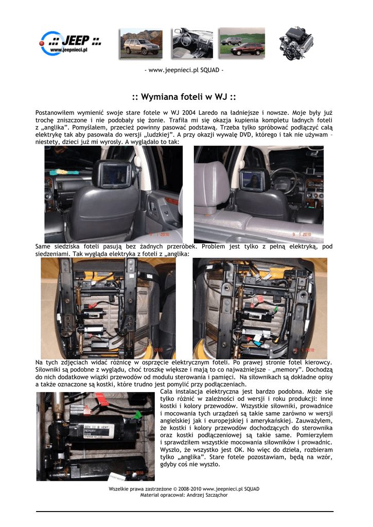 - www.jeepnieci.pl SQUAD - :: Wymiana foteli w WJ :: Postanowiłem wymienić swoje stare fotele w WJ 2004 Laredo na ładniejsze i nowsze. Moje były już trochę zniszczone i nie podobały się żonie. Trafiła mi się okazja kupienia kompletu ładnych foteli z „anglika”. Pomyślałem, przecież powinny pasować podstawą. Trzeba tylko spróbować podłączyć całą elektrykę tak aby pasowała do wersji „ludzkiej”. A przy okazji wywalę DVD, którego i tak nie używam – niestety, dzieci już mi wyrosły. A wyglądało to tak: Same siedziska foteli pasują bez żadnych przeróbek. Problem jest tylko z pełną elektryką, pod siedzeniami. Tak wygląda elektryka z foteli z „anglika: Na tych zdjęciach widać różnicę w osprzęcie elektrycznym foteli. Po prawej stronie fotel kierowcy. Siłowniki są podobne z wyglądu, choć troszkę większe i mają to co najważniejsze – „memory”. Dochodzą do nich dodatkowe wiązki przewodów od modułu sterowania i pamięci. Na siłownikach są dokładne opisy a także oznaczone są kostki, które trudno jest pomylić przy podłączeniach. Cała instalacja elektryczna jest bardzo podobna. Może się tylko różnić w zależności od wersji i roku produkcji: inne kostki i kolory przewodów. Wszystkie siłowniki, prowadnice i mocowania tych urządzeń są takie same zarówno w wersji angielskiej jak i europejskiej i amerykańskiej. Zauważyłem, że kostki i kolory przewodów dochodzących do sterownika oraz kostki podłączeniowej są takie same. Pomierzyłem i sprawdziłem wszystkie mocowania siłowników i prowadnic. Wyszło, że wszystko jest OK. No więc do dzieła, rozbieram tylko „anglika”. Stare fotele pozostawiam, będą na wzór, gdyby coś nie wyszło. Wszelkie prawa zastrzeżone © 2008-2010 www.jeepnieci.pl SQUAD Materiał opracował: Andrzej Szcząchor - www.jeepnieci.pl SQUAD - Zaczynamy od rozłączenia wszystkich kostek i wyjęciu wiązek instalacji elektrycznych. Po kilku minutach oba fotele wyglądają tak a obok wiązki elektryczne (zdjęcie fotela kierowcy): Teraz pozostała najtrudniejsza część rozbiórki foteli, rozłączenie mechanizmów silniczków. Ale przedtem musimy wymontować panel pamięci silniczek napędzający prowadnice. Obie te części znajdują się na dole zdjęcia po lewej stronie a po wyjęciu wyglądają tak: Należy także odkręcić blaszaną podstawę, mocującą panel pamięci i sterowania. Podstawę przenosimy do fotela lewego – wszystko pasuje. W silniczku napędzającym prowadnice są dwa wałki, po obu stronach. Nie należy zmieniać ich położenia. Ja tylko sprawdziłem stan zużycia i uzupełniłem smar. Panel sterowania i pamięci jest taki sam w każdym Jeep-ie – oczywiście w pełnej wersji. Sprawdzamy tylko styki, jeżeli są zaśniedziałe można je oczyścić (trochę znajomości z elektroniki). Jeżeli ktoś nie wie jak to zrobić to lepiej polecić to jakiemuś elektronikowi. Nie można styków w gniazdach lub wtyczkach oczyszczać śrubokrętem, nawet bardzo cienkim. Bardzo łatwo można uszkodzić gniazdo a wtedy pozostaje tylko wymiana całego panela. Pozostaje teraz wymontować pozostałe dwa silniki sterowania fotelami. Po kolei wybijamy (z wyczuciem) ośki, które mocują silnik do ramy fotela oraz nit mocujący ramię ślimaka: Wszelkie prawa zastrzeżone © 2008-2010 www.jeepnieci.pl SQUAD Materiał opracował: Andrzej Szcząchor - www.jeepnieci.pl SQUAD - I fotele nasze wyglądają tak: Kabelek, który widać na zdjęciu to podłączenie kontrolki zapięcia pasów. W niektórych wersjach zapięcie pasa mocowane jest do fotela a w innych do tunela podłogi. Którą wersję wybieramy? Jest to obojętne i zależy od zaczepów pasów. Siłowniki do foteli powinny zostać wymontowane w całości. Nie należy ich bez potrzeby rozbierać. Sprawdzamy tylko stan gniazd, w których mocowane są przeguby, w miarę potrzeby uzupełniamy smar i to wszystko. Ja dodatkowo wykonałem konserwację części metalowych. Tu gdzie zawitała rdza, oczyściłem i pomalowałem farbą antykoryjną. Przy okazji można też sprawdzić stan mat grzewczych. Teraz pozostaje nam tylko zmontować fotele. Wszystkie wymontowane wcześniej elementy z prawego fotela montujemy w lewym i odwrotnie z lewego w prawym. Wszystkie elementy pasują i nie ma potrzeby wykonywania innych czynności adaptacyjnych. Montażu dokonujemy w odwrotnej kolejności. I jeszcze jedna uwaga. Nie ma potrzeby zamiany silnika regulującego nachylenia oparcia fotela. Oba silniki, w lewym i prawym fotelu działają tak samo. Po zamontowaniu elementów mechanicznych pozostaje tylko podłączenie wiązek przewodów instalacji elektrycznych. Jeżeli będą pasowały kostki to można przełożyć wiązkę ze starego fotela. Ja położyłem – w fotelu kierowcy wiązkę z „anglika”, która nie pasowała do otworów montażowych i przymocowałem tę wiązkę taśmami do ramy fotela. I to by było na tyle. Wszystko działa OK. Materiał opracował: Andrzej Szcząchor Wszelkie prawa zastrzeżone © 2008-2010 www.jeepnieci.pl SQUAD Materiał opracował: Andrzej Szcząchor