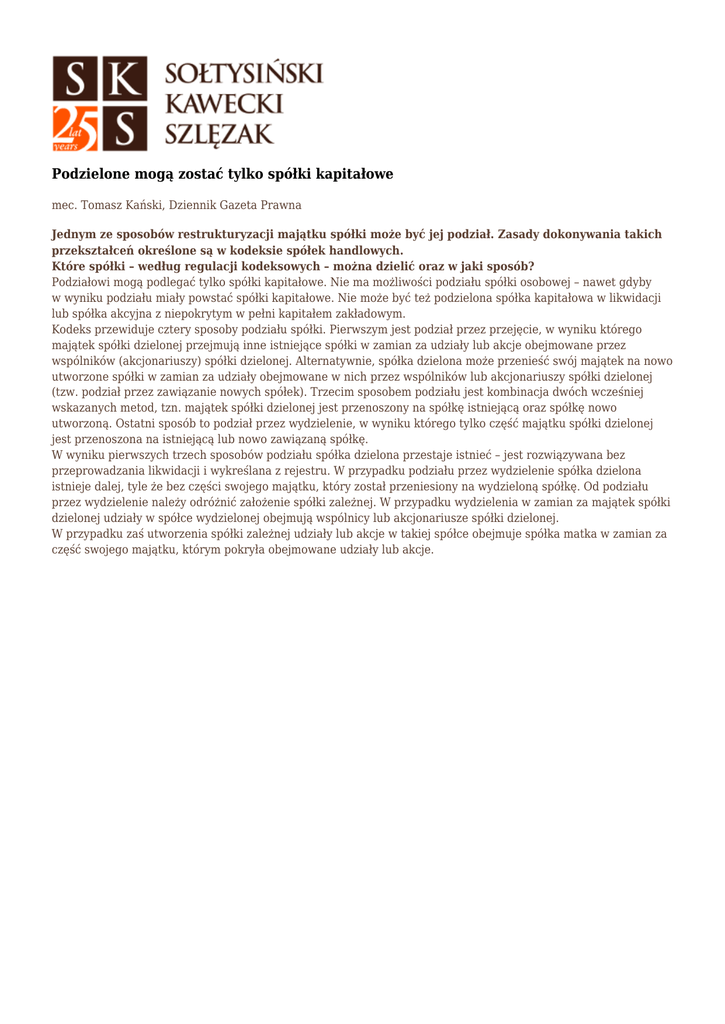 Podzielone mogą zostać tylko spółki kapitałowe mec. Tomasz Kański, Dziennik Gazeta Prawna Jednym ze sposobów restrukturyzacji majątku spółki może być jej podział. Zasady dokonywania takich przekształceń określone są w kodeksie spółek handlowych. Które spółki – według regulacji kodeksowych – można dzielić oraz w jaki sposób? Podziałowi mogą podlegać tylko spółki kapitałowe. Nie ma możliwości podziału spółki osobowej – nawet gdyby w wyniku podziału miały powstać spółki kapitałowe. Nie może być też podzielona spółka kapitałowa w likwidacji lub spółka akcyjna z niepokrytym w pełni kapitałem zakładowym. Kodeks przewiduje cztery sposoby podziału spółki. Pierwszym jest podział przez przejęcie, w wyniku którego majątek spółki dzielonej przejmują inne istniejące spółki w zamian za udziały lub akcje obejmowane przez wspólników (akcjonariuszy) spółki dzielonej. Alternatywnie, spółka dzielona może przenieść swój majątek na nowo utworzone spółki w zamian za udziały obejmowane w nich przez wspólników lub akcjonariuszy spółki dzielonej (tzw. podział przez zawiązanie nowych spółek). Trzecim sposobem podziału jest kombinacja dwóch wcześniej wskazanych metod, tzn. majątek spółki dzielonej jest przenoszony na spółkę istniejącą oraz spółkę nowo utworzoną. Ostatni sposób to podział przez wydzielenie, w wyniku którego tylko część majątku spółki dzielonej jest przenoszona na istniejącą lub nowo zawiązaną spółkę. W wyniku pierwszych trzech sposobów podziału spółka dzielona przestaje istnieć – jest rozwiązywana bez przeprowadzania likwidacji i wykreślana z rejestru. W przypadku podziału przez wydzielenie spółka dzielona istnieje dalej, tyle że bez części swojego majątku, który został przeniesiony na wydzieloną spółkę. Od podziału przez wydzielenie należy odróżnić założenie spółki zależnej. W przypadku wydzielenia w zamian za majątek spółki dzielonej udziały w spółce wydzielonej obejmują wspólnicy lub akcjonariusze spółki dzielonej. W przypadku zaś utworzenia spółki zależnej udziały lub akcje w takiej spółce obejmuje spółka matka w zamian za część swojego majątku, którym pokryła obejmowane udziały lub akcje.