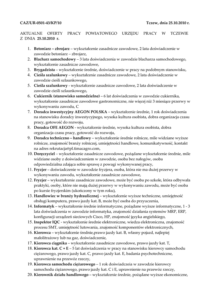 CAZ/UR-0501-43/KP/10 AKTUALNE OFERTY Z DNIA 25.10.2010 r. Tczew, dnia 25.10.2010 r. PRACY POWIATOWEGO URZĘDU PRACY W TCZEWIE 1. Betoniarz – zbrojarz – wykształcenie zasadnicze zawodowe, 2 lata doświadczenie w zawodzie betoniarz – zbrojarz, 2. Blacharz samochodowy – 3 lata doświadczenia w zawodzie blacharza samochodowego, wykształcenie zasadnicze zawodowe, 3. Brygadzista – wykształcenie średnie, doświadczenie w pracy na podobnym stanowisku, 4. Cieśla szalunkowy – wykształcenie zasadnicze zawodowe, 2 lata doświadczenie w zawodzie cieśli szlaunkowego, 5. Cieśla szalunkowy - wykształcenie zasadnicze zawodowe, 2 lata doświadczenie w zawodzie cieśli szlaunkowego, 6. Cukiernik (stanowisko samodzielne) – 6 lat doświadczenia w zawodzie cukiernika, wykształcenie zasadnicze zawodowe gastronomiczne, nie więcej niż 3 miesiące przerwy w wykonywaniu zawodu, C 7. Doradca inwestycyjny AEGON POLSKA – wykształcenie średnie, 1 rok doświadczenia na stanowisku doradcy inwestycyjnego, wysoka kultura osobista, dobra organizacja czasu pracy, gotowość do rozwoju, 8. Doradca OFE AEGON - wykształcenie średnie, wysoka kultura osobista, dobra organizacja czasu pracy, gotowość do rozwoju, 9. Doradca techniczno – handlowy – wykształcenie średnie rolnicze, mile widziane wyższe rolnicze, znajomość branży rolniczej, umiejętności handlowe, komunikatywność, kontakt na adres [email protected], 10. Doręczyciel – wykształcenie zasadnicze zawodowe, pożądane wykształcenie średnie, mile widziane osoby z doświadczeniem w zawodzie, osoba bez nałogów, osoba odpowiedzialna zdająca sobie sprawę z powagi wykonywanej pracy, 11. Fryzjer – doświadczenie w zawodzie fryzjera, osoba, która nie ma dużej przerwy w wykonywaniu zawodu, wykształcenie zasadnicze zawodowe, 12. Fryzjer – wykształcenie zasadnicze zawodowe, może być osoba po szkole, która odbywała praktyki, osoby, które nie mają dużej przerwy w wykonywaniu zawodu, może być osoba po kursie fryzjerskim (ukończony w tym roku), 13. Handlowiec w branży hydraulicznej – wykształcenie wyższe techniczne, umiejętność obsługi komputera, prawo jazdy kat. B, może być osoba do przyuczenia, 14. Informatyk – wykształcenie średnie informatyczne, pożądane wyższe informatyczne, 1 - 3 lata doświadczenia w zawodzie informatyka, znajomość działania systemów MRP, ERP, konfiguracji urządzeń sieciowych Cisco, HP, znajomość języka angielskiego, 15. Inspektor IQC - wykształcenie średnie elektroniczne, wiedza elektroniczna, znajomość procesu SMT, umiejętność lutowania, znajomość komponentów elektronicznych, 16. Kierowca – wykształcenie średnie,prawo jazdy kat. B, własny pojazd, najlepiej małolitrażowy lub na gaz, doświadczenie, 17. Kierowca ciągnika – wykształcenie zasadnicze zawodowe, prawo jazdy kat. T, 18. Kierowca kat. C + E – 5 lat doświadczenia w pracy na stanowisku kierowcy samochodu ciężarowego, prawo jazdy kat. C, prawo jazdy kat. E, badania psychotechniczne, uprawnienie na przewóz rzeczy, 19. Kierowca samochodu ciężarowego – 1 rok doświadczeia w zawodzie kierowcy samochodu ciężarowego, prawo jazdy kat. C i E, uprawnienie na przewóz rzeczy, 20. Kierownik działu handlowego – wykształcenie średnie, pożądane wyższe ekonomiczne, prawo jazdy kat. B, umiejętność obsługi komputera, kontakt telefoniczny 723-684-656, email: [email protected], doświadczenie w kierowaniu zespołem, doświadczenie w branzy drzewnej – mile widziane, 21. Konsultant szkód osobowych – wykształcenie średnie, doświadczenie w obsłudze klienta, doświadczenie w handlu, dostęp do Internetu, 22. Kontroler biletów – osoba niekarana, odporna na stres, miła prezencja, 23. Lakiernik przy produkcji drzwi – 5 lat doświadczenia w zawodzie lakiernika 24. Lakiernik samochodowy – wykształcenie zasadnicze zawodowe, 3 lata doświadczenia w zawodzie lakiernika samochodowego, 25. Lakiernik samochodowy z doświadczeniem – 3 lata doświadczenia lakiernika samochodowego, wykształcenie zasadnicze zawodowe, 26. Magazynier – wykształcenie średnie zawodowe, doświadczenie w zawodzie magazyniera, uprawnienie na wózki widłowe, pracowitość, sumienność, preferowane osoby z Tczewa, zaangażowanie w powierzoną pracę, 27. Magazynier – Serwisant – wykształcenie średnie, prawo jazdy kat. B, doświadczenie w zawodzie magazyniera, samodzielność, umiejętność usuwania awarii, znajomość zagadnień z zakresu elektryki, 28. Majster budowlany – wykształcenie średnie budowlane, 5 lat doświadczenia w pracy na stanowisku majstra, umiejętność czytania rysunku technicznego, 29. Malarz lakiernik – 1 rok dświadczenia w zawodzie malarza lakiernika wyrobów metalowych, 30. Malarz proszkowy – 1 rok doświadczenia w pracy na podobnym stanowisku, dokładność, spostrzegawczość, zdolności manualne, 31. Mechanik maszyn rolniczych – doświadczenie mile widziane, umiejętność samodzielnego diagnozowania problemów, znajomość budowy maszyn szwlaniczych, 32. Mechanik samochodów osobowych z doświadczeniem – 3 lata doświadczenia w zawodzie mechanika samochodów osobowych, wykształcenie zasadnicze zawodowe mechaniczne, 33. Monter podzespołów elektronicznych - wykształcenie średnie elektroniczne, wiedza elektroniczna, znajomość procesu SMT, umiejętność lutowania, znajomość komponentów elektronicznych, 34. Murarz – wykształcenie zasadnicze zawodowe, 2 lata doświadczenia w zawodzie murarza, 35. Nauczyciel przedszkola – wykształcenie wyższe kierunkowe, 1 rok doświadczenia w zawodzie nauczyciela przedszkola, 36. Operator malarni - dokładność, spostrzegawczość, zdolności manualne, 37. Operator malarni (maskowanie) – dokładność, spostrzegawczość, zdolności manualne, 38. Operator maszyn – umiejętność czytania rysunku technicznego, umiejętność stosowania urządzeń pomiarowych (suwmiarka, mikrometr), 39. Operator maszyn SMT 