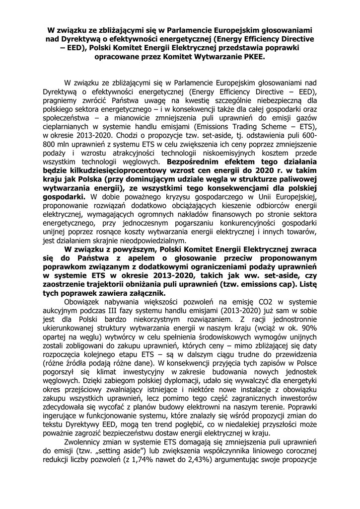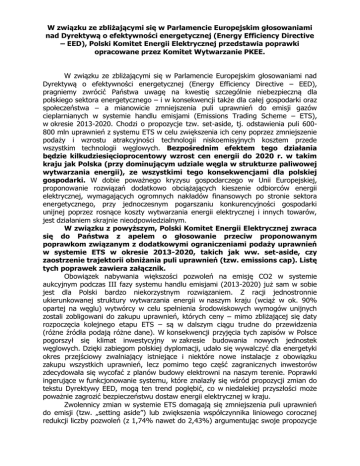 W związku ze zbliżającymi się w Parlamencie Europejskim głosowaniami nad Dyrektywą o efektywności energetycznej (Energy Efficiency Directive – EED), Polski Komitet Energii Elektrycznej przedstawia poprawki opracowane przez Komitet Wytwarzanie PKEE. W związku ze zbliżającymi się w Parlamencie Europejskim głosowaniami nad Dyrektywą o efektywności energetycznej (Energy Efficiency Directive – EED), pragniemy zwrócić Państwa uwagę na kwestię szczególnie niebezpieczną dla polskiego sektora energetycznego – i w konsekwencji także dla całej gospodarki oraz społeczeństwa – a mianowicie zmniejszenia puli uprawnień do emisji gazów cieplarnianych w systemie handlu emisjami (Emissions Trading Scheme – ETS), w okresie 2013-2020. Chodzi o propozycje tzw. set-aside, tj. odstawienia puli 600800 mln uprawnień z systemu ETS w celu zwiększenia ich ceny poprzez zmniejszenie podaży i wzrostu atrakcyjności technologii niskoemisyjnych kosztem przede wszystkim technologii węglowych. Bezpośrednim efektem tego działania będzie kilkudziesięcioprocentowy wzrost cen energii do 2020 r. w takim kraju jak Polska (przy dominującym udziale węgla w strukturze paliwowej wytwarzania energii), ze wszystkimi tego konsekwencjami dla polskiej gospodarki. W dobie poważnego kryzysu gospodarczego w Unii Europejskiej, proponowanie rozwiązań dodatkowo obciążających kieszenie odbiorców energii elektrycznej, wymagających ogromnych nakładów finansowych po stronie sektora energetycznego, przy jednoczesnym pogarszaniu konkurencyjności gospodarki unijnej poprzez rosnące koszty wytwarzania energii elektrycznej i innych towarów, jest działaniem skrajnie nieodpowiedzialnym. W związku z powyższym, Polski Komitet Energii Elektrycznej zwraca się do Państwa z apelem o głosowanie przeciw proponowanym poprawkom związanym z dodatkowymi ograniczeniami podaży uprawnień w systemie ETS w okresie 2013-2020, takich jak ww. set-aside, czy zaostrzenie trajektorii obniżania puli uprawnień (tzw. emissions cap). Listę tych poprawek zawiera załącznik. Obowiązek nabywania większości pozwoleń na emisję CO2 w systemie aukcyjnym podczas III fazy systemu handlu emisjami (2013-2020) już sam w sobie jest dla Polski bardzo niekorzystnym rozwiązaniem. Z racji jednostronnie ukierunkowanej struktury wytwarzania energii w naszym kraju (wciąż w ok. 90% opartej na węglu) wytwórcy w celu spełnienia środowiskowych wymogów unijnych zostali zobligowani do zakupu uprawnień, których ceny – mimo zbliżającej się daty rozpoczęcia kolejnego etapu ETS – są w dalszym ciągu trudne do przewidzenia (różne źródła podają różne dane). W konsekwencji przyjęcia tych zapisów w Polsce pogorszył się klimat inwestycyjny w zakresie budowania nowych jednostek węglowych. Dzięki zabiegom polskiej dyplomacji, udało się wywalczyć dla energetyki okres przejściowy zwalniający istniejące i niektóre nowe instalacje z obowiązku zakupu wszystkich uprawnień, lecz pomimo tego część zagranicznych inwestorów zdecydowała się wycofać z planów budowy elektrowni na naszym terenie. Poprawki ingerujące w funkcjonowanie systemu, które znalazły się wśród propozycji zmian do tekstu Dyrektywy EED, mogą ten trend pogłębić, co w niedalekiej przyszłości może poważnie zagrozić bezpieczeństwu dostaw energii elektrycznej w kraju. Zwolennicy zmian w systemie ETS domagają się zmniejszenia puli uprawnień do emisji (tzw. „setting aside”) lub zwiększenia współczynnika liniowego corocznej redukcji liczby pozwoleń (z 1,74% nawet do 2,43%) argumentując swoje propozycje koniecznością stworzenia zachęt dla inwestycji w energetykę niskoemisyjną. Twierdzą, że Dyrektywa EED spowoduje, iż ceny uprawnień do emisji CO2 spadną do poziomu, przy którym technologie konwencjonalne uzyskają przewagę konkurencyjną, co w efekcie zagrozi przyjętym celom klimatycznym. Równocześnie zapominają jednak, że jednym z głównych filarów polityki energetycznej Unii Europejskiej (obok konkurencyjności i zrównoważonego rozwoju) jest zapewnienie bezpieczeństwa energetycznego, a zmniejszenie puli uprawnień mocno zagraża funkcjonowaniu istniejących jednostek węglowych, tym samym pozbawiając Polskę zasilania w energię. Ponadto zabieg zredukowania liczby pozwoleń w aukcjoningu spowoduje wzrost cen uprawnień do emisji, ostatecznie zniechęcając do inwestowania w te technologie, co stawia energetykę konwencjonalną na z góry przegranej pozycji na rynku (zaburzenie konkurencyjności). Trzeba jednocześnie pamiętać, że na chwilę obecną nie ma żadnej dostępnej alternatywy, a ewentualne stosowanie w przyszłości metody wychwytywania i składowania CO2 (Carbon Capture and Storage – CCS), nieodłącznie wiąże się ze znacznym spadkiem (nawet do 25%) sprawności całej instalacji, co kłóci się z nadrzędnym celem Dyrektywy EED. Skutki ograniczenia liczby uprawnień dla polskiej energetyki bardzo mocno odczuje także krajowy przemysł, ponieważ wyższa cena ich zakupu spowoduje wzrost cen energii elektrycznej. Będzie to zatem kolejny cios wymierzony w polskie sektory energochłonne, czyli m.in. hutnictwo żelaza i stali, cementownie, czy przemysł papierniczy. W rezultacie, mimo tego, że zostały one wyłączone z obowiązku zakupu uprawnień do emisji do poziomu wskaźnika najlepszych dostępnych technologii produkcji (sektory narażone na „wyciek emisji”), będą zmuszone wydawać znacznie więcej środków na zakup energii, co spowoduje drastyczny spadek ich – już i tak ich mocno osłabionej – konkurencyjności. Wreszcie zmiana „zasad gry” w trakcie jej trwania wprowadza brak przejrzystości i przewidywalności dla inwestorów w zakresie funkcjonowania całego unijnego rynku. Stabilność regulacji w zakresie długoterminowym jest wszak kluczowym czynnikiem determinującym decyzje inwestycyjne w energetyce. Skoro administracja Unii rozważa ingerencję w