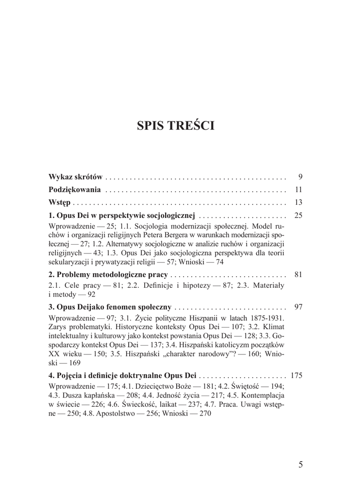 Spis treści Wykaz skrótów . . . . . . . . . . . . . . . . . . . . . . . . . . . . . . . . . . . . . . . . . . . . . 9 Podziękowania . . . . . . . . . . . . . . . . . . . . . . . . . . . . . . . . . . . . . . . . . . . . . . 11 Wstęp . . . . . . . . . . . . . . . . . . . . . . . . . . . . . . . . . . . . . . . . . . . . . . . . . . . . . 13 1. Opus Dei w perspektywie socjologicznej . . . . . . . . . . . . . . . . . . . . . . 25 Wprowadzenie — 25; 1.1. Socjologia modernizacji społecznej. Model ruchów i organizacji religijnych Petera Bergera w warunkach modernizacji społecznej — 27; 1.2. Alternatywy socjologiczne w analizie ruchów i organizacji religijnych — 43; 1.3. Opus Dei jako socjologiczna perspektywa dla teorii sekularyzacji i prywatyzacji religii — 57; Wnioski — 74 2. Problemy metodologiczne pracy . . . . . . . . . . . . . . . . . . . . . . . . . . . . . 81 2.1. Cele pracy — 81; 2.2. Definicje i hipotezy — 87; 2.3. Materiały i metody — 92 3. Opus Deijako fenomen społeczny . . . . . . . . . . . . . . . . . . . . . . . . . . . . 97 Wprowadzenie — 97; 3.1. Życie polityczne Hiszpanii w latach 1875-1931. Zarys problematyki. Historyczne konteksty Opus Dei — 107; 3.2. Klimat intelektualny i kulturowy jako kontekst powstania Opus Dei — 128; 3.3. Gospodarczy kontekst Opus Dei — 137; 3.4. Hiszpański katolicyzm początków XX wieku — 150; 3.5. Hiszpański „charakter narodowy”? — 160; Wnioski — 169 4. Pojęcia i definicje doktrynalne Opus Dei . . . . . . . . . . . . . . . . . . . . . . 175 Wprowadzenie — 175; 4.1. Dziecięctwo Boże — 181; 4.2. Świętość — 194; 4.3. Dusza kapłańska — 208; 4.4. Jedność życia — 217; 4.5. Kontemplacja w świecie — 226; 4.6. Świeckość, laikat — 237; 4.7. Praca. Uwagi wstępne — 250; 4.8. Apostolstwo — 256; Wnioski — 270 5. Idea uświęcania poprzez codzienną pracę jako element ethosu Opus Dei . . . . . . . . . . . . . . . . . . . . . . . . . . . . . . . . . . . . . . . . . . 275 Wprowadzenie — 275; 5.1. Ethos pracy Opus Dei w perspektywie typu idealnego — 277; 5.2. Uświęcać pracę. Sakralizacja i sanktyfikacja pracy — 290; 5.3. Uświęcać się w pracy. Sanktyfikacja i tożsamość — 299; 5.4. Uświęcać poprzez pracę. Sanktyfikacja i apostolstwo. — 308; Wnioski — 315 6. Opus Dei jako organizacja . . . . . . . . . . . . . . . . . . . . . . . . . . . . . . . . . . 323 Wprowadzenie — 323; 6.1. Proces legalizacji kanonicznej Opus Dei — 328; 6.1.1. Instytucjonalizacja na poziomie lokalnym: Opus Dei jako związek pobożny (1941) i Stowarzyszenie Kapłańskie Świętego Krzyża (1943) — 329; 6.1.2. Instytucjonalizacja na poziomie centralnym (1947 i 1950) i rozwój międzynarodowy – Opus Dei jako Instytut Świecki — 333; 6.2. Opus Dei jako prałatura personalna: ostateczne rozwiązanie problemu instytucjonalnego — 340; 6.2.1. Opus Dei a Sobór Watykański II — 341; 6.2.2. Podstawy prawne prałatur personalnych w prawodawstwie posoborowym — 347; 6.2.3. Kongres Generalny Opus Dei (1969-1970) — 348; 6.2.4. Opus Dei w świetle konstytucji apostolskiej Ut sit — 350; 6.2.5. Prałatury personalne w świetle Kodeksu Prawa Kanonicznego 1983 — 352; 6.3. Prałatura personalna Świętego Krzyża i Opus Dei w świetle dokumentów wewnętrznych — 355; 6.3.1. Natura i cel Prałatury — 356; 6.3.2. Struktura i układ pozycji — 357; 6.3.3. Życie wewnętrzne — 372; 6.3.4. Formy działania — 376; 6.4. Święty Josemaría Escrivá de Balaguer – założyciel Opus Dei — 379; Wnioski — 387 7. Opus Dei jako czynnik zmiany społecznej. Dzieła apostolskie Opus Dei . . . . . . . . . . . . . . . . . . . . . . . . . . . . . . . . 395 Wprowadzenie — 395; 7.1. Dzieła apostolskie Opus Dei — 398; 7.2. Uniwersytet w nauczaniu św. Josemaríi Escrivy de Balaguera — 404; 7.3. Uniwersytet Nawarry i jego wpływ na zmianę społeczną — 412; 7.3.1. Klinika Uniwersytecka — 418; 7.3.2. Escuela Universitaria de Enfermería — 420; 7.3.3. Instituto de Estudios Superiores de la Empresa (IESE) — 422; Wnioski — 426 Zakończenie . . . . . . . . . . . . . . . . . . . . . . . . . . . . . . . . . . . . . . . . . . . . . . . . 431 Bibliografia . . . . . . . . . . . . . . . . . . . . . . . . . . . . . . . . . . . . . . . . . . . . . . . . 439 Spis wykresów . . . . . . . . . . . . . . . . . . . . . . . . . . . . . . . . . . . . . . . . . . . . . . 465 Indeks osób . . . . . . . . . . . . . . . . . . . . . . . . . . . . . . . . . . . . . . . . . . . . . . . . 467 Wykaz pierwodruków . . . . . . . . . . . . . . . . . . . . . . . . . . . . . . . . . . . . . . . . 473 Summary: The Work Ethos in the Doctrine and Practice of Opus Dei . . . . . . . 475