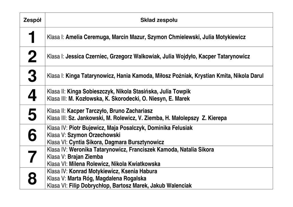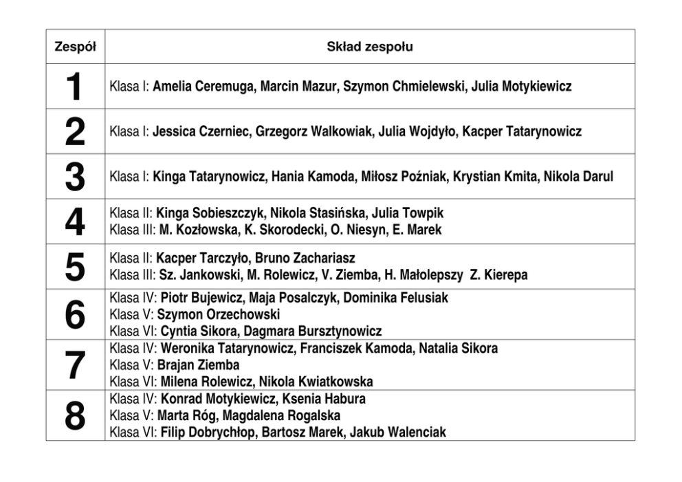 Zespół 1 2 3 4 5 6 7 8 Skład zespołu Klasa I: Amelia Ceremuga, Marcin Mazur, Szymon Chmielewski, Julia Motykiewicz Klasa I: Jessica Czerniec, Grzegorz Walkowiak, Julia Wojdyło, Kacper Tatarynowicz Klasa I: Kinga Tatarynowicz, Hania Kamoda, Miłosz Poźniak, Krystian Kmita, Nikola Darul Klasa II: Kinga Sobieszczyk, Nikola Stasińska, Julia Towpik Klasa III: M. Kozłowska, K. Skorodecki, O. Niesyn, E. Marek Klasa II: Kacper Tarczyło, Bruno Zachariasz Klasa III: Sz. Jankowski, M. Rolewicz, V. Ziemba, H. Małolepszy Z. Kierepa Klasa IV: Piotr Bujewicz, Maja Posalczyk, Dominika Felusiak Klasa V: Szymon Orzechowski Klasa VI: Cyntia Sikora, Dagmara Bursztynowicz Klasa IV: Weronika Tatarynowicz, Franciszek Kamoda, Natalia Sikora Klasa V: Brajan Ziemba Klasa VI: Milena Rolewicz, Nikola Kwiatkowska Klasa IV: Konrad Motykiewicz, Ksenia Habura Klasa V: Marta Róg, Magdalena Rogalska Klasa VI: Filip Dobrychłop, Bartosz Marek, Jakub Walenciak