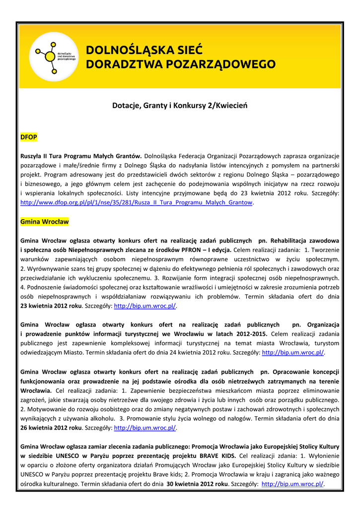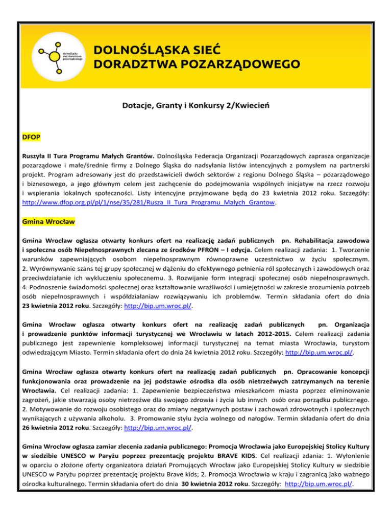 Dotacje, Granty i Konkursy 2/Kwiecień DFOP Ruszyła II Tura Programu Małych Grantów. Dolnośląska Federacja Organizacji Pozarządowych zaprasza organizacje pozarządowe i małe/średnie firmy z Dolnego Śląska do nadsyłania listów intencyjnych z pomysłem na partnerski projekt. Program adresowany jest do przedstawicieli dwóch sektorów z regionu Dolnego Śląska – pozarządowego i biznesowego, a jego głównym celem jest zachęcenie do podejmowania wspólnych inicjatyw na rzecz rozwoju i wspierania lokalnych społeczności. Listy intencyjne przyjmowane będą do 23 kwietnia 2012 roku. Szczegóły: http://www.dfop.org.pl/pl/1/nse/35/281/Rusza_II_Tura_Programu_Malych_Grantow. Gmina Wrocław Gmina Wrocław ogłasza otwarty konkurs ofert na realizację zadań publicznych pn. Rehabilitacja zawodowa i społeczna osób Niepełnosprawnych zlecana ze środków PFRON – I edycja. Celem realizacji zadania: 1. Tworzenie warunków zapewniających osobom niepełnosprawnym równoprawne uczestnictwo w życiu społecznym. 2. Wyrównywanie szans tej grupy społecznej w dążeniu do efektywnego pełnienia ról społecznych i zawodowych oraz przeciwdziałanie ich wykluczeniu społecznemu. 3. Rozwijanie form integracji społecznej osób niepełnosprawnych. 4. Podnoszenie świadomości społecznej oraz kształtowanie wrażliwości i umiejętności w zakresie zrozumienia potrzeb osób niepełnosprawnych i współdziałaniaw rozwiązywaniu ich problemów. Termin składania ofert do dnia 23 kwietnia 2012 roku. Szczegóły: http://bip.um.wroc.pl/. Gmina Wrocław ogłasza otwarty konkurs ofert na realizację zadań publicznych pn. Organizacja i prowadzenie punktów informacji turystycznej we Wrocławiu w latach 2012-2015. Celem realizacji zadania publicznego jest zapewnienie kompleksowej informacji turystycznej na temat miasta Wrocławia, turystom odwiedzającym Miasto. Termin składania ofert do dnia 24 kwietnia 2012 roku. Szczegóły: http://bip.um.wroc.pl/. Gmina Wrocław ogłasza otwarty konkurs ofert na realizację zadań publicznych pn. Opracowanie koncepcji funkcjonowania oraz prowadzenie na jej podstawie ośrodka dla osób nietrzeźwych zatrzymanych na terenie Wrocławia. Cel realizacji zadania: 1. Zapewnienie bezpieczeństwa mieszkańcom miasta poprzez eliminowanie zagrożeń, jakie stwarzają osoby nietrzeźwe dla swojego zdrowia i życia lub innych osób oraz porządku publicznego. 2. Motywowanie do rozwoju osobistego oraz do zmiany negatywnych postaw i zachowań zdrowotnych i społecznych wynikających z używania alkoholu. 3. Promowanie stylu życia wolnego od nałogów. Termin składania ofert do dnia 26 kwietnia 2012 roku. Szczegóły: http://bip.um.wroc.pl/. Gmina Wrocław ogłasza zamiar zlecenia zadania publicznego: Promocja Wrocławia jako Europejskiej Stolicy Kultury w siedzibie UNESCO w Paryżu poprzez prezentację projektu BRAVE KIDS. Cel realizacji zdania: 1. Wyłonienie w oparciu o złożone oferty organizatora działań Promujących Wrocław jako Europejskiej Stolicy Kultury w siedzibie UNESCO w Paryżu poprzez prezentację projektu Brave kids; 2. Promocja Wrocławia w kraju i zagranicą jako ważnego ośrodka kulturalnego. Termin składania ofert do dnia 30 kwietnia 2012 roku. Szczegóły: http://bip.um.wroc.pl/. Gmina Wrocław ogłasza z otwarty konkurs ofert na realizację zadań publicznych pn. Szkolenie sportowe w zakresie piłki nożnej kobiet w 2012 r. Celem realizacji zadania jest podniesienie poziomu wyszkolenia i uzyskanie lepszych wyników umożliwiających przejście do grup o wyższym poziomie sportowym. Termin składania ofert do dnia 4 maja 2012 roku. Szczegóły: http://bip.um.wroc.pl/. Gmina Wrocław ogłasza otwarty konkurs ofert na realizację zadań publicznych pn. Udział Zespołów Młodziczek i Kadetek w turniejach półfinałowych i finałowych o Mistrzostwo Polski w piłce siatkowej w 2012 roku. Celem realizacji zadania jest współzawodnictwo i weryfikacja dotychczasowych umiejętności . Termin składania ofert do dnia 4 maja 2012 roku. Szczegóły: http://bip.um.wroc.pl/. Gmina Wrocław ogłasza otwarty konkurs ofert na realizację zadań publicznych pn. Wsparcie edukacji w zakresie przedsiębiorczości poprzez popularyzację metod profesjonalnego zarządzania projektami uczniów i nauczycieli wrocławskich gimnazjów. Celem realizacji zadania jest: 1. wsparcie systemu edukacji pod kątem wdrożenia narzędzia realizacji projektu edukacyjnego w gimnazjum; 2. nabycie wiedzy przez uczniów wrocławskich gimnazjów w zakresie wybranych narzędzi zarządzania projektami oraz pracy zespołowej jako kluczowych umiejętności na rynku pracy; 3. nabycie wiedzy przez nauczycieli wrocławskich gimnazjów w zakresie wybranych narzędzi zarządzania projektami oraz kierowania i motywowania zespołu projektowego. Termin składania ofert do dnia 7 maja 2012 roku. Szczegóły: http://bip.um.wroc.pl/. Gmina Wrocław ogłasza otwarty konkurs ofert na realizację zadań publicznych pn. Organizacja i zapewnienie opieki nad dziećmi z terenu Wrocławia w wieku do lat 3, w tym nad dziećmi niepełnosprawnymi lub dziećmi wymagającymi szczególnej opieki, sprawowanej w żłobku o charakterze integracyjnym, zlokalizowanym w obrębie Grabiszyn. Cel realizacji zadania: Zapewnienie opieki nad dziećmi w wieku do lat 3 dla co najmniej 100 dzieci, sprawowanej w żłobku o charakterze integracyjnym, w tym dla co najmniej dla 25 % dzieci Niepełnosprawnych lub dzieci wymagających szczególnej opieki, spełniających warunki: - ukończone 20 tygodni życia, posiadających stałe zamieszkania na terenie Wrocławia, przyjętych do żłobka na zasadach rekrutacji analogicznych jak dla żłobków publicznych (zamieszczonych w BIP na stronie www.wroclaw.pl), z zastrzeżeniem pierwszeństwa przyjęcia dziecka niepełnosprawnego lub dziecka wymagającego szczególnej opieki. Termin składania ofert do dnia 10 maja 2012 roku. Szczegóły: http://bip.um.wroc.pl/. Gmina Wrocław ogłasza o