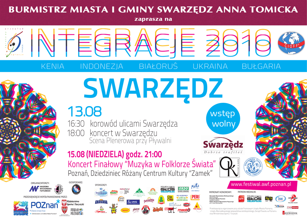 0 1 0 2 E J C A R G E NT IIINTE 0 1 0 2010 2 E JE J C A R GRAC G E NT INTEGRACJE 2010 KENIA INDONEZJA BIAŁORUŚ UKRAINA BUŁGARIA SWARZĘDZ 13.08 16:30 korowód ulicami Swarzędza 18:00 koncert w Swarzędzu wstęp wolny Scena Plenerowa przy Pływalni 15.08 (NIEDZIELA) godz. 21:00 Koncert Finałowy “Muzyka w Folklorze Świata” Poznań, Dziedziniec Różany Centrum Kultury “Zamek” ORGANIZATORZY: GOSPODARZ: SPONSORZY: www.festiwal.awf.poznan.pl PATRONAT HONOROWY: PATRONI MEDIALNI: PRZEDSIĘWZIĘCIE WSPÓŁFINANSOWANE PRZEZ: Przedsięwzięcia organizowane przy udziale finansowym Urzędu Miasta Poznania, Urzędu Marszałkowskiego Województwa Wielkopolskiego, Zarząd Powiatu w Poznaniu oraz Ministerstwa Sportu i Turystyki.