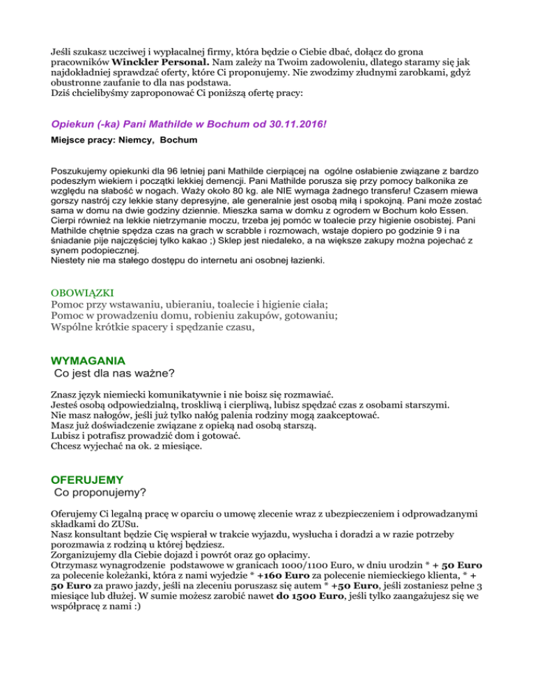 Jeśli szukasz uczciwej i wypłacalnej firmy, która będzie o Ciebie dbać, dołącz do grona pracowników Winckler Personal. Nam zależy na Twoim zadowoleniu, dlatego staramy się jak najdokładniej sprawdzać oferty, które Ci proponujemy. Nie zwodzimy złudnymi zarobkami, gdyż obustronne zaufanie to dla nas podstawa. Dziś chcielibyśmy zaproponować Ci poniższą ofertę pracy: Opiekun (-ka) Pani Mathilde w Bochum od 30.11.2016! Miejsce pracy: Niemcy, Bochum Poszukujemy opiekunki dla 96 letniej pani Mathilde cierpiącej na ogólne osłabienie związane z bardzo podeszłym wiekiem i początki lekkiej demencji. Pani Mathilde porusza się przy pomocy balkonika ze względu na słabość w nogach. Waży około 80 kg. ale NIE wymaga żadnego transferu! Czasem miewa gorszy nastrój czy lekkie stany depresyjne, ale generalnie jest osobą miłą i spokojną. Pani może zostać sama w domu na dwie godziny dziennie. Mieszka sama w domku z ogrodem w Bochum koło Essen. Cierpi również na lekkie nietrzymanie moczu, trzeba jej pomóc w toalecie przy higienie osobistej. Pani Mathilde chętnie spędza czas na grach w scrabble i rozmowach, wstaje dopiero po godzinie 9 i na śniadanie pije najczęściej tylko kakao ;) Sklep jest niedaleko, a na większe zakupy można pojechać z synem podopiecznej. Niestety nie ma stałego dostępu do internetu ani osobnej łazienki. OBOWIĄZKI Pomoc przy wstawaniu, ubieraniu, toalecie i higienie ciała; Pomoc w prowadzeniu domu, robieniu zakupów, gotowaniu; Wspólne krótkie spacery i spędzanie czasu, WYMAGANIA Co jest dla nas ważne? Znasz język niemiecki komunikatywnie i nie boisz się rozmawiać. Jesteś osobą odpowiedzialną, troskliwą i cierpliwą, lubisz spędzać czas z osobami starszymi. Nie masz nałogów, jeśli już tylko nałóg palenia rodziny mogą zaakceptować. Masz już doświadczenie związane z opieką nad osobą starszą. Lubisz i potrafisz prowadzić dom i gotować. Chcesz wyjechać na ok. 2 miesiące. OFERUJEMY Co proponujemy? Oferujemy Ci legalną pracę w oparciu o umowę zlecenie wraz z ubezpieczeniem i odprowadzanymi składkami do ZUSu. Nasz konsultant będzie Cię wspierał w trakcie wyjazdu, wysłucha i doradzi a w razie potrzeby porozmawia z rodziną u której będziesz. Zorganizujemy dla Ciebie dojazd i powrót oraz go opłacimy. Otrzymasz wynagrodzenie podstawowe w granicach 1o00/1100 Euro, w dniu urodzin * + 50 Euro za polecenie koleżanki, która z nami wyjedzie * +160 Euro za polecenie niemieckiego klienta, * + 50 Euro za prawo jazdy, jeśli na zleceniu poruszasz się autem * +50 Euro, jeśli zostaniesz pełne 3 miesiące lub dłużej. W sumie możesz zarobić nawet do 1500 Euro, jeśli tylko zaangażujesz się we współpracę z nami :) KONTAKT Z BIUREM: Skontaktuj się z nami! Możesz zgłosić się poprzez formularz w linku poniżej: https://system.erecruiter.pl/FormTemplates/RecruitmentForm.aspx?WebID=0be67 788c9294541bb76e1b29bf4c9cf Winckler Personal Sp. z o.o. Sp. k. , ul. Twarda 18, 00-105 Warszawa Zadzwoń: Opieka seniorów – Niemcy, tel.: (22) 631 11 10 Inżynieria, przemysł i produkcja – Niemcy, tel.: (22) 631 11 70 Rekrutacje stałe – Polska, tel. (22) 652 27 72 Napisz E-mail: [email protected] Więcej ofert pracy na terenie Niemiec znajdziesz na naszej stronie internetowej www.wincklerpersonal.pl Dziękujemy za złożone aplikacje i poświęcony nam czas.