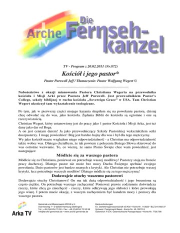 TV - Program z 20.02.2011 (Nr.872) Kościół i jego pastor* Pastor Purswell Jeff / Tłumaczenie: Pastor Wolfgang Wegert © Nabożeństwo z okazji mianowania Pastora Christiana Wegerta na przewodnika kościoła i Misji Arki przez Pastora Jeff Purswell. Jest przewodnikiem Pastor’s College, szkoły biblijnej w ruchu kościoła „Sovereign Grace” w USA. Tam Christian Wegert ukończył tam wykształcenie teologiczne. Po tym, jak w pierwszej części mojego kazania skupiłem się na powołaniu pastora, dzisiaj chcę odwołać się do was, jako kościoła. Żądania Biblii do kościoła są ogromne i one są rzeczywistością. Christian Wegert, który ustanowiony jest do pracy jako 1 pastor Kościoła i Misji Arka, jest też dany jako dar od Boga. A on jest cennym darem! Ja jako przewodniczący Szkoły Pastorskiej wykształciłem setki duszpasterzy. I mogę powiedzieć: Bóg jest bardzo hojny dla was i był dla tego mężczyzny. Wy jako kościół macie względem niego odpowiedzialność - a Christian ma odpowiedzialność także wobec was. Dlatego chciałbym, że tak powiem z polecenia Bożego Słowa skierować do was ostrożne wezwanie. To, co wierzę, że samo Pismo Święte chce wam powiedzieć, jest następujące: Módlcie się za waszego pastora Módlcie się za Christiana, ponieważ on potrzebuje waszej modlitwy! Pastorzy stoją na froncie pracy duchowej. Dlatego pastor nie może bez mocy Ducha Świętego spełniać swojego powołania. Dużo pastorów jest bardzo znanych z krytyki. Ale Christian nie potrzebuje waszej krytyki, lecz potrzebuje waszych modlitw! Dlatego módlcie się za tego mężczyznę! Dodawajcie otuchy waszemu pastorowi Dodawajcie otuchy Christianowi! On ma tak dużą odpowiedzialność i jego brzemiona są często ciężkie. On potrzebuje waszego zachęcenia! Ponieważ prawie codziennie doświadcza rzeczy, które chcą go zniechęcić - rzeczy, które odkrywają jego słabości i które prowokują jego wiarę. I potem macie okazję, z waszym zachęceniem być kanałem mocy i pomocy dla waszego pastora. Arka TV Gemeinde und Missionswerk ARCHE e.V. Doerriesweg 7 • D-22525 Hamburg (Stellingen) Tel.: +49 (0)40/54 70 50 • Fax: +49 (0)40/54 70 52 99 [email protected] • www.arche-gemeinde.de Bankverbindungen Ev. Darlehensgenossenschaft eG Kiel • Konto-Nr. 113522 • BLZ 210 602 37 Schweiz: Postgiroamt Basel • Konto-Nr. 40-10270-9 Österreich: P.S.K. Österreichische Postsparkasse • Konto-Nr. 7726.796 Strona 2 - TV-Program 872 / „Kościół i jego pastor“ Nikt nie może mu dodawać takiej otuchy jak siostry i bracia w kościele! I chociaż Christian może wyrzec się negatywnej krytyki, to jestem pewien, że złapał konstruktywne spostrzeżenia, które w życzliwy sposób zostały uzewnętrznione. Ponieważ wasze spostrzeżenia pomogą mu urosnąć. Chroń swojego pastora Z Pisma Świętego wiemy też, że pastorowie są oczerniani. W celu uniknięcia obelg i oszczerstw, Ap Paweł ostrzega, że: „Przeciwko starszemu skargi nie przyjmuj, chyba, że jest ona oparta na zeznaniu dwu lub trzech świadków” (Tymoteusz 5, 19). Pastor jest narażony na publiczną kontrolę i krytykę, bardziej niż ktokolwiek inny w kościele. Dlatego wzbraniajcie się słuchać oszczerstw i zniesławień o tym mężczyźnie. Wskazujcie ludziom, którzy przedstawili skargę, aby udali się do niego samego. I proszę nie pozwólcie w waszych sercach na żadne oskarżenia lub wrogość lub sądzenie. Służcie z waszym pastorem To jest zadanie Christiana jako pastora, służyć wam jako kościołowi. Ale on nie jest tutaj żeby dla was służyć! Bądźcie po jego stronie i innych duszpasterzy i oddajcie siebie osobiście, przez to zobaczycie, jak Ewangelia przez posługę Arki w Hamburgu i poza nią coraz bardziej i bardziej będzie głoszona i przyniesie owoc. Być może jesteś członkiem kościoła i uświadomiłeś sobie, podczas słuchania, że jesteś tak naprawdę bardziej konsumentem niż sługą. Zawsze bierzesz, ale nie jesteś gotów by dawać. Chcesz, żeby tobie służyli, ale ty sam nie chcesz służyć. Wtedy chcę ciebie wezwać: Niech ten dzień przez łaskę Bożą będzie dniem, w którym postanowisz, przyłączyć się do spraw kościoła! Mało rzeczy sprawia pastorowi tyle radości, jak kiedy ktoś przychodzi do niego i mówi: „Chcę służyć. Jak mogę to zrobić?” Szanujcie waszego pastora I ostatnie: Zważajcie na waszego pastora, zważajcie na jego kazania i przedstawcie sobie jego kierownictwo. Pójdźcie za nim, tak jak on idzie za Chrystusem. Znacie przecież te słowa: „Bądźcie posłuszni przewodnikom waszym i bądźcie im ulegli; oni to bowiem czuwają nad duszami waszymi i zdadzą z tego sprawę; niechże to czynią z radością, a nie ze wzdychaniem, gdyż to wyszłoby wam na szkodę!” (Hebrajczyków 13, 17). Chcę was zachęcić i wiem, że to przecież dla waszego własnego serca jest odpowiednie: bądźcie dla niego radością a nie ciężarem, w byciu waszym pastorem. Tak chciałbym jeszcze raz umieścić to w waszym sercu: Módlcie się za Christiana! Zachęcajcie go! Chrońcie go! Służcie z nim! I zważajcie na niego! Amen. To nabożeństwo nie jest po prostu tylko nabożeństwem, które zaraz przeminie i potem będzie szybko zapomniane. Ono jest czymś więcej, kamieniem milowym w tym kościele. I kamień milowy stoi przecież za dwiema rzeczami: On mówi tobie skąd jesteś i jak daleko jesteś już w podroży i on powie też tobie, gdzie należy iść. Taki kamień milowy, to dzień przełomowego wydarzenia w którym powinno się pamiętać Bożą wierność w stosunku do kościoła przez czas dziesięcioleci. Bóg był dla was bardzo dobry, prawda? „Dzisiaj” jest możliwe tylko z powodu wierności Boga w przeszłości. Dlatego moją modlitwą jest, żeby wam historia wierności Boga do Arki - kościoła całkiem na nowo została uświadomiona. Kamień milowy pokazuje też przyszłość. Taki dzień jak dziś świadczy