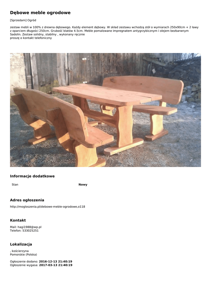 Dębowe meble ogrodowe [Sprzedam] Ogród zestaw mebli w 100% z drewna dębowego. Każdy element dębowy. W skład zestawu wchodzą stół o wymiarach 250x90cm + 2 ławy z oparciem długości 250cm. Grubość blatów 4.5cm. Meble pomalowane impregnatem antygrzybicznym i olejem bezbarwnym Sadolin. Zestaw solidny, stabilny , wykonany ręcznie proszę o kontakt telefoniczny Informacje dodatkowe Stan Nowy Adres ogłoszenia http://mogloszenia.pl/debowe-meble-ogrodowe,o118 Kontakt Mail: [email protected] Telefon: 533025251 Lokalizacja , kościerzyna Pomorskie (Polska) Ogłoszenie dodano: 2016-12-13 21:40:19 Ogłoszenie wygasa: 2017-03-13 21:40:19 Powered by TCPDF (www.tcpdf.org)