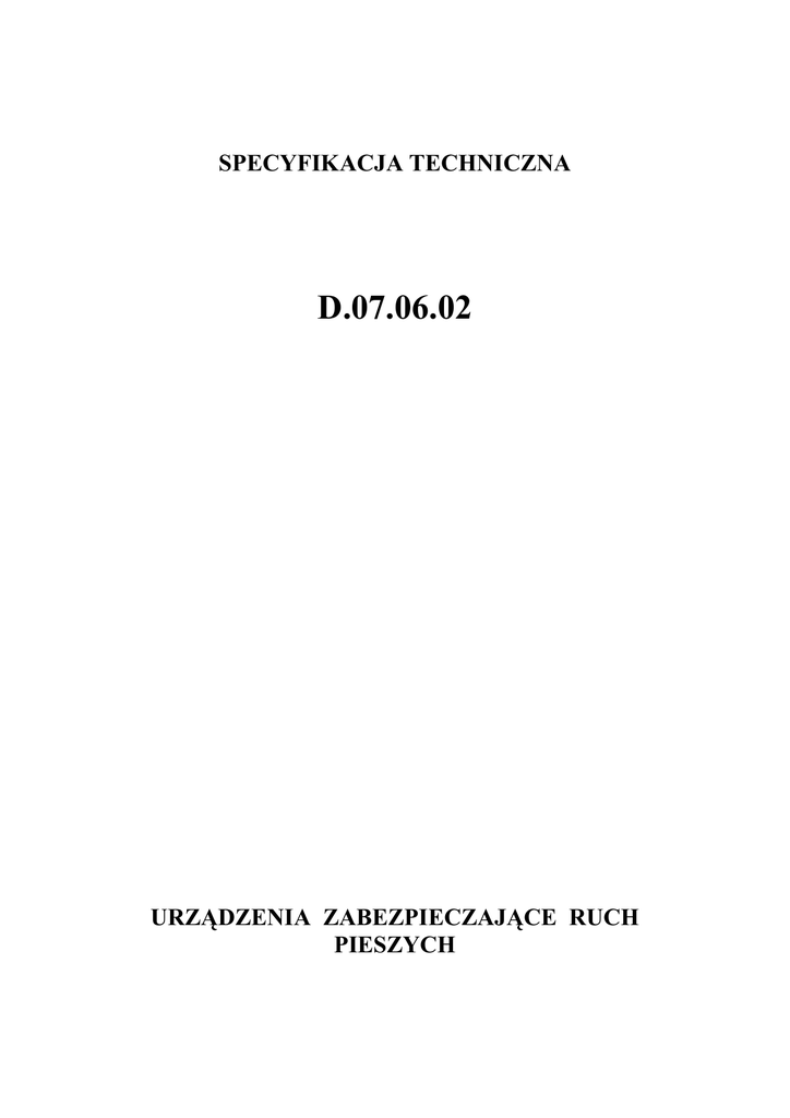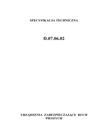 SPECYFIKACJA TECHNICZNA D.07.06.02 URZĄDZENIA ZABEZPIECZAJĄCE RUCH PIESZYCH SPECYFIKACJA TECHNICZNA D.07.06.02 1. Wstęp 1.1. Przedmiot stosowania ST Przedmiotem niniejszej Specyfikacji Technicznej są wymagania dotyczące wykonania i odbioru robót związanych z urządzeniami zabezpieczającymi ruch pieszych w związku z przebudową drogi wojewódzkiej polegającej na budowie chodnika w miejscowości Laskowice Pomorskie. 1.2. Zakres stosowania ST Specyfikacja Techniczna jest stosowana jako dokument przetargowy i kontraktowy przy zlecaniu i realizacji robot wymienionych w punkcie 1.1. 1.3. Zakres robót objętych ST Ustalenia zawarte w niniejszej specyfikacji dotyczą zasad prowadzenia robót związanych z wykonaniem urządzeń zabezpieczających ruch pieszy zgodnie z Dokumentacją Projektową, i obejmują: • wykonanie mat dla niewidomych z płytek chodnikowych 35x35x5cm z wypustkami ułoŜonych na podsypce cementowo-piaskowej grubości 3cm (przed przejściami dla pieszych). 1.4. Określenia podstawowe 1.4.1. Płyty chodnikowe betonowe - prefabrykowane płyty betonowe przeznaczone do budowy chodników dla pieszych. 1.4.2. Pozostałe określenia podstawowe są zgodne z obowiązującymi, odpowiednimi polskimi normami i z definicjami podanymi w ST D.00.00.00 „Wymagania ogólne” pkt 1.4. 1.5. Ogólne wymagania dotyczące robót Wykonawca robót jest odpowiedzialny za jakość wykonania robót oraz za zgodność robót z Dokumentacją Projektową, ST i poleceniami Inspektora Nadzoru. Ogólne wymagania dotyczące robót podano w ST D.00.00.00 „Wymagania ogólne”. 2. Materiały 2.1. Ogólne wymagania dotyczące materiałów Ogólne wymagania dotyczące materiałów i ich składowania, podano w ST D.00.00.00 „Wymagania ogólne” punkt 2. 2.2. Płyty chodnikowe betonowe - klasyfikacja 2.2.1. Rodzaje W zaleŜności od wymiarów i kształtu, naleŜy uŜyć rodzaj płyt chodnikowych betonowych: A - płyta normalna kwadratowa. 172 SPECYFIKACJA TECHNICZNA D.07.06.02 2.2.2. Odmiany W zaleŜności od technologii naleŜy uŜyć odmiany: płyta jednowarstwowa – 1. 2.2.3. Gatunki W zaleŜności od dopuszczalnych wielkości i liczby uszkodzeń oraz odchyłek wymiarowych naleŜy uŜyć: - gatunek I - G1, Płyty chodnikowe betonowe powinny odpowiadać wymaganiom BN-80/6775-03/01 [7] i BN-80/6775-03/03 [8] i ST. Przykład oznaczenia płyty chodnikowej normalnej połówkowej (B) jednowarstwowej (1) o wymiarach 35 x 17,5 cm gat. I: Płyta chodnikowa B-1 35/17,5 BN-80/6775-03/03 [8]. Co najmniej co 50-ta płyta na stronie nie naraŜonej na ścieranie powinna mieć podany w sposób trwały: znak wytwórni, symbole elementu, datę produkcji i znak kontroli odbiorczej. 2.3. Płyty chodnikowe betonowe - wymagania techniczne 2.3.1. Kształt i wymiary W projekcie zastosowano do wbudowania płyty kwadratowe 35×35×5cm z wypustkami. Dopuszczalne odchyłki wymiarów płyt chodnikowych betonowych dla gatunku I wynoszą ± 2 2.3.2. Dopuszczalne wady i uszkodzenia Dopuszczalne wady i uszkodzenia powierzchni i krawędzi płyt chodnikowych betonowych podano w tablicy 3. Tablica 3. Dopuszczalne wady i uszkodzenia Dopuszczalna wielkość wad i uszkodzeń Gatunek 1 Rodzaj wad i uszkodzeń płyt chodnikowych betonowych Wklęsłość lub wypukłość powierzchni i krawędzi, mm Szczerby i uszkodzenia ograniczających powierzchnie górne krawędzi i naroŜy (ścieralne), mm 2 niedopuszczalne ograniczających pozostałe powierzchnie: - liczba max 2 - długość, mm, max 20 - głębokość, mm, max 6 2.3.3. Składowanie Płyty chodnikowe betonowe powinny być składowane rębem, płaszczyznami górnymi ku sobie, na podłoŜu wyrównanym i odwodnionym. Płyty powinny być posegregowane we- 173 SPECYFIKACJA TECHNICZNA D.07.06.02 dług rodzajów, odmian i gatunków. Płyty naleŜy ustawiać na podkładkach drewnianych oraz zabezpieczać krawędzie przed uszkodzeniem przekładkami drewnianymi. 2.3.4. Beton i jego składniki 2.3.4.1. Beton do produkcji płyt chodnikowych Do produkcji płyt chodnikowych betonowych jednowarstwowych naleŜy stosować beton klasy B 30. Płyty chodnikowe powinny charakteryzować się: − nasiąkliwością poniŜej 4 %, − mrozoodpornością F150 i wodoszczelnością W8, zgodnie z normą PN-B-06250 [10], − ścieralnością na tarczy Boehmego ≤ 3mm 2.3.4.2. Cement Do produkcji płyt chodnikowych betonowych naleŜy stosować cement portlandzki klasy nie niŜszej niŜ „32,5” wg PN-EN 197-1 [4]. Przechowywanie cementu powinno być zgodne z BN-88/6731-08 [6]. 2.3.4.3. Kruszywo do betonu Kruszywo do betonu powinno odpowiadać wymaganiom PN-EN 12620 [2]. 2.3.4.4. Woda Woda powinna być odmiany „1” i odpowiadać wymaganiom PN-EN 1008-1 [5]. 2.5. Materiały na podsypkę i do zapraw oraz wypełnienia spoin Cement na podsypkę i do zaprawy powinien być cementem portlandzkim klasy „32,5”, odpowiadający wymaganiom PN-EN-197-1 [4]. Piasek na podsypkę i do wypełnienia spoin powinien odpowiadać wymaganiom PN-B06712 [2], a do zaprawy cementowo-piaskowej PN-EN 13139 [1]. Woda powinna być odmiany „1” i odpowiadać wymaganiom PN-EN 1008-1 [5]. 3. Sprzęt 3.1. Ogólne wymagania dotyczące sprzętu Ogólne wymagania dotyczące sprzętu podano w ST D.00.00.00 „Wymagania ogólne” pkt 3. 3.2. Sprzęt do wykonania mat z wypustkami dla niewidomych Roboty wykonuje się ręcznie przy zastosowaniu sprzętu pomocniczego: - betoniarek do wytwarzania betonu i zapraw oraz przygotowania podsypki cementowopiaskowej, - wibratorów płytowych, ubijaków ręcznych lub mechanicznych. 4. Transport 4.1. Ogólne wymagania dotyczące transportu Ogólne wymagania dotyczące transportu podano ST D.00.00.00 „Wymagania ogólne” pkt 4. 174 SPECYFIKACJA TECHNICZNA D.07.06.02 4.2. Transport płyt chodnikowych Płyty chodnikowe betonowe mogą być przewoŜone dowolnymi środkami transportu po osiągnięciu przez beton wytrzymałości minimum 0,7 wytrzymałości projektowanej. 5. Wykonanie robót 5.1. Ogólne w