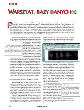 odczas pracy w rodowisku AutoCAD-a niekiedy znajdujemy siê w sytuacji, kiedy sam graficzny opis pewnych obiektów jest zdecydowanie niewystarczaj¹cy. Czasem po prostu musimy dodaæ kilka s³ów komentarza, np.: specyfikacjê techniczn¹ urz¹dzenia lub listê lokatorów pomieszczenia. Z drugiej strony nie chcielibymy tych adnotacji umieszczaæ w formie zwyk³ego tekstu, gdy¿ niepotrzebnie zaciemnia³by on rysunek. Jeli jest to rzeczywicie tylko kilka s³ów mo¿emy ewentualnie pos³u¿yæ siê ukrytymi atrybutami bloków. Ale co zrobiæ, gdy do projektu musimy do³¹czyæ znaczn¹ iloæ czêsto zmieniaj¹cych siê danych, które na dodatek dostarczane s¹ nam przez osobê nie maj¹c¹ dostêpu do naszego rysunku i w ogóle nie potrafi¹c¹ obs³ugiwaæ AutoCAD-a? W takim przypadku pos³ugiwanie siê atrybutami by³oby nieefektywne i niewygodne. Rozwi¹zaniem tego problemu jest zawarty w AutoCADzie R14 interfejs, pozwalaj¹cy na do³¹czanie zewnêtrznych baz danych. Za jego porednictwem mo¿emy powi¹zaæ graficzne obiekty przechowywane w pliku DWG z niegraficznymi daUwaga! Praca z zewnêtrznymi bazami nymi pobieranymi z baz danych danych w AutoCAD-zie R14 nie ORACLE, dBASE lub ze ród³a bêdzie mo¿liwa, jeli podczas instalacji programu nie zosta³ danych ODBC. Co daje nam utwowybrany typ instalacji P E £ N Y rzenie takich relacji? Przede (lub U ¯YTKOWNIKA z w³¹czon¹ opcj¹ wszystkim pozwala wskazaæ na ZEWN. BAZY D.). rysunku dowolny obiekt i za¿¹daæ, by program wywietli³ nam treæ do³¹czonych do niego informacji pochodz¹cych z bazy danych. Umo¿liwia te¿ realizacjê zadania dok³adnie odwrotnego, tzn. przegl¹daj¹c bazê danych mo¿emy nakazaæ, by program wskaza³ nam na rysunku wszystkie obiekty, do których do³¹czono konkretny opis. Istnieje równie¿ mo¿liwoæ umieszczania na rysunku informacji pochodz¹cych z bazy danych w postaci widocznych atrybutów tekstowych. Treæ takich atrybutów mo¿e byæ póniej automatycznie aktualizowana, gdy do bazy danych wprowadzimy jakiekolwiek modyfikacje. Dodatkow¹ zalet¹ jest fakt, ¿e przechowywanie czêci danych poza rysunkiem AutoCAD-a pozwala zredukowaæ rozmiary plików DWG, a tak¿e uprociæ proces sporz¹dzania zestawieñ. TWORZENIE BAZY DANYCH DBASE W EXCELU Tabele formatu dBASE (DBF) mo¿na tworzyæ i modyfikowaæ miêdzy innymi za pomoc¹ szeroko rozpowszechnionego programu Microsoft Excel, tak wiêc nikt nie powinien mieæ wiêkszych problemów z przygotowaniem w³asnych baz danych. By jednak zapisaæ standardowy arkusz Excela w postaci DBF, nale¿y go odpowiednio przygotowaæ. Przeledmy proces tworzenia tabeli dBASE na konkretnym przyk³adzie. Za³ó¿my, ¿e mamy projekt niewielkiego biura. Do rysunku AutoCAD-a, zapisanego na dysku w folderze C:\Projekt, do³¹czyæ chcemy bazê danych przechowuj¹c¹ dane personalne pracowników biura. Poszczególne kolumny tabeli zawieraæ bêd¹: unikatowy numer iden- 36 tyfikacyjny osoby, jej nazwisko i imiê, dzia³, w którym jest zatrudniona, stanowisko, a tak¿e numer telefonu wewnêtrznego oraz numer zajmowanego pomieszczenia. Rys. 1 W pierwszym wierszu nale¿y umieciæ nazwy poszczególnych kolumn, natomiast w pozosta³ych szczegó³owy opis kolejnych pracowników. Nale¿y pamiêtaæ, aby ustawiæ odpowiednio szerokoæ wszystkich kolumn. Excel zapamiêtuje w komórce s³owa d³u¿sze ni¿ widoczny obszar. Jednak przy zapisie do formatu DBF zbyt d³ugie wyra¿enia zostan¹ obciête. Aby zmieniæ szerokoæ pola NAZWISKO, kliknij lewym klawiszem myszy na nag³ówku kolumny C arkusza (co spowoduje jej zaznaczenie), a nastêpnie w tym samym miejscu kliknij prawym klawiszem. Z kontekstowego menu, które siê wówczas pojawi, wybierz polecenie SZEROKOÆ KOLUMNY... i w oknie dialogowym okrel nowy rozmiar. Nastêpnie musimy poinformowaæ Excela, ¿e ma traktowaæ Uwaga! Ze wzglêdu na odmienny spopowy¿sz¹ tabelkê jako bazê danych. Kliknij lewym klawi- sób kodowania polskich znaków, Excel nie jest niestety idealnym szem myszy na komórce B2 narzêdziem do tworzenia tabel i nie puszczaj¹c przycisku prze- dBASE. Gdy wczytasz plik daci¹gnij kursor do komórki H12. ne_per.dbf do AutoCAD-a, zamiast Z menu WSTAWàNAZWA wy- polskich liter zobaczysz niestety krzaczki. bierz polecenie DEFINIUJ. Gdy pojawi siê okno dialogowe DEFINIUJ NAZWY, wpisz w polu NAZWY W SKOROSZYCIE: baza_danych (gdy u¿ywasz angielskiej wersji Excela wpisz database). Rys. 2 Rys. 3 Po tych wszystkich przygotowaniach mo¿emy z menu PLIK wybraæ polecenie ZAPISZ JAKO.... W oknie dialogowym okrel nazwê dla naszego pliku (np. dane_per.dbf; staraj siê nadawaæ nazwy nie d³u¿sze ni¿ omioliterowe i bez polskich liter), natomiast w polu ZAPISZ JAKO TYP: wybierz DBF 3 (dBASE III) (*.dbf). Teraz w folderze naszego projektu mo¿emy utworzyæ podkatalog (np. C:\Projekt\Tabele), do którego skopiujemy utworzon¹ przed chwil¹ bazê danych. w AutoCAD-zie jako domylne. Wybierz wiêc z listy Default Catalog wartoæ PROJ, a z Default Schema TABELE. Analogicznych zmian dokonaj na zak³adce Indexes z listy Catalog wybierz PROJ, z listy Schema TABELE, a z Table dane_per. Jeli wszystko siê zgadza, zatwierd ustawienia przyciskiem OK. Gdy w przysz³oci utworzysz kolejne tabele DBF, wystarczy, ¿e skopiujesz je do katalogu C:\Projekt\Tabele, a stan¹ siê one natychmiast dostêpne dla AutoCAD-a. KONFIGURACJA BAZY DANYCH W AUTOCAD-ZIE ADMINISTRACJA BAZY DANYCH W AUTOCAD-ZIE W menu START Windows, w grupie ikon AutoCAD-a 14, obok ikony uruchamiaj¹cej samego AutoCAD-a znajduje siê skrót do programu KONFIGURACJA ZEWNÊTRZNEJ BAZY DANYCH. Za jego pomoc¹ poinformujemy AutoCAD-a, ¿e w folderze C:\Projekt\Tabele znajduje siê tabela dane_per.dbf, któr¹ ma do³¹czyæ do naszego projektu. Gdy wybierzesz ikonê KONFIGURACJA ZEWNÊTRZNEJ BAZY DANYCH, na ekranie pojawi siê okno dialogowe External Database Configuration. Upewnij siê, ¿e jest w nim aktywna zak³adka Environments. Po lewej stronie okna ulokowana jest lista do