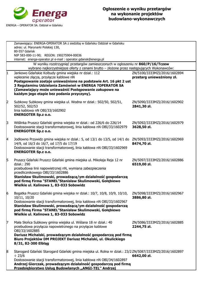 Ogłoszenie o wyniku przetargów na wykonanie projektów budowlano-wykonawczych ENERGA – OPERATOR SA. Oddział w Gdańsku Zamawiający: ENERGA-OPERATOR SA z siedzibą w Gdańsku Oddział w Gdańsku adres: ul. Marynarki Polskiej 130, 80-557 Gdańsk NIP 583-000-11-90; REGON: 190275904-00036 internet: energa-operator.pl e-mail : [email protected] 1 W wyniku rozstrzygnięć przetargów zamieszczonych w ogłoszeniu nr 860/P/16/Tczew wybrano najkorzystniejsze oferty z cenami brutto – złożone przez następujących Wykonawców: Jankowo Gdańskie Kolbudy gmina wiejska nr dział.: 112 ZN/5100/3333MZI/2016/1602894 wplecenie złącza, przyłącze kablowe nN przetarg unieważniony zł. Postępowanie zostaje unieważnione na podstawie Art. 16 pkt 2 ust 3 Regulaminu Udzielania Zamówień w ENERGA ?OPERATOR SA (Zamawiający może unieważnić Postępowanie zakupowe na każdym jego etapie bez podania przyczyny). 2 Subkowy Subkowy gmina wiejska ul. Wodna nr dział.: 502/50, 502/51, 502/52, 502/53 linia kablowa nN OBI/33/1602902 ENERGOTER Sp.z o.o. ZN/5090/3333MZI/2016/1602902 2841,30 zł. 3 Wiślinka Pruszcz Gdański gmina wiejska nr dział.: od 226/6 do 226/14 Dostosowanie stacji transformatorowej, linia kablowa nN OBI/33/1602979 ENERGOTER Sp.z o.o. ZN/5092/3333MZI/2016/1602979 3628,50 zł. 4 Jodłowno Przywidz gmina wiejska nr dział.: 5, od 13/1 do 13/5, od 14/1 do ZN/5093/3333MZI/2016/1602969 14/9, od 16/3 do 16/7, od 17/5 do 17/19 8474,70 zł. Dostosowanie stacji transformatorowej, linia kablowa nN OBI/33/1602969 ENERGOTER Sp.z o.o. 5 Pruszcz Gdański Pruszcz Gdański gmina miejska ul. Mikołaja Reja 12 nr dział.: 290 przebudowa linii napowietrznej nN, wymiana zabezpieczenia przedlicznikowego OBI/33/1602886 Stanisław Skulimowski, prowadzącą/ym działalność gospodarczą pod firmą Firma "STANEL"Stanisław Skulimowski, Gołębiewo Wielkie ul. Kalinowa 1, 83-033 Sobowidz ZN/5097/3333MZI/2016/1602886 6519,00 zł. 6 Bogatka Pruszcz Gdański gmina wiejska nr dział.: 10/7, 10/8, 10/9, 10/10, 10/11, 10/20 Dostosowanie stacji transformatorowej, linia kablowa nN OBI/33/1602967 Stanisław Skulimowski, prowadzącą/ym działalność gospodarczą pod firmą Firma "STANEL"Stanisław Skulimowski, Gołębiewo Wielkie ul. Kalinowa 1, 83-033 Sobowidz ZN/5098/3333MZI/2016/1602967 3886,80 zł. 7 Mała Słońca Subkowy gmina wiejska ul. Wiślana 18 nr dział.: 40 ZN/5086/3333MZI/2016/1602885 przebudowa przyłącza napowietrznego na przyłącze kablowe 2244,75 zł. OBI/33/1602885 Dariusz Michalski, prowadzącym działalność gospodarczą pod firmą Biuro Projektów DM PROJEKT Dariusz Michalski, ul. Okulickiego 8/31, 82-300 Elbląg 8 Starogard Gdański Starogard Gdański gmina miejska ul. Rolna nr dział.: 23/2 ZN/5087/3333MZI/2016/1602897 ÷ 23/6 6642,00 zł. Dostosowanie stacji transformatorowej, linia kablowa nN OBI/34/1602897 Andrzej Gierczak, prowadzącym działalność gospodarczą pod firmą Przedsiębiorstwo Usług Budowlanych ,,ANGI-TEL'' Andrzej Ogłoszenie o wyniku przetargów na wykonanie projektów budowlano-wykonawczych ENERGA – OPERATOR SA. Oddział w Gdańsku Gierczak, Osiedle Piastów 2/15, 83-200 Starogard Gdański 9 Kleszczewko Pszczółki gmina wiejska nr dział.: 42, 37/1, 37/2. Dostosowanie stacji transformatorowej, linia kablowa nN OBI/33/1602899 Stanisław Skulimowski, prowadzącą/ym działalność gospodarczą pod firmą Firma "STANEL"Stanisław Skulimowski, Gołębiewo Wielkie ul. Kalinowa 1, 83-033 Sobowidz ZN/5088/3333MZI/2016/1602899 3985,20 zł. Kleszczewko Pszczółki gmina wiejska nr dział.: 42, 37/1, 37/2. Dostosowanie stacji transformatorowej, linia kablowa nN OBI/33/1602899 null zł. ENERGOTER Sp.z o.o. Oferta zostaje odrzucona zgodnie z Art. 12 ust. 4 Regulaminu Udzielania Zamówień w ENERGA-OPERATOR SA. Zamawiający odrzuca ofertę, jeżeli jej treść nie odpowiada treści WZ lub zaproszenia. Wykonawca złożył dwie oferty do postępowania. Sporządził(a): Natalia Kosiła Gdańsk, dnia 02.11.2016 r. .............................................................. /podpis/