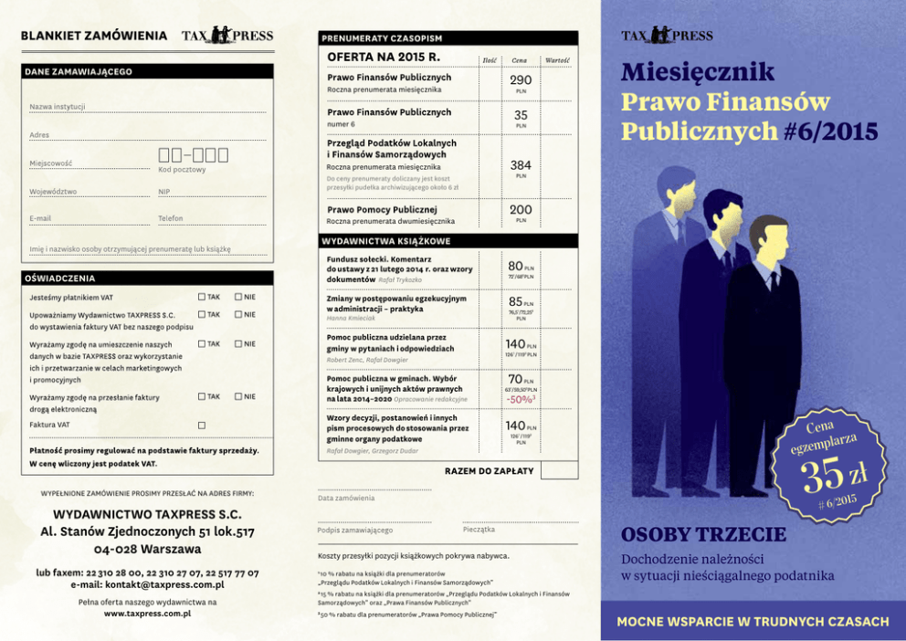 Oferta na 2015 r. 290 Roczna prenumerata miesięcznika pLN 35 numer 6 pLN 384 Roczna prenumerata miesięcznika pLN Do ceny prenumeraty doliczany jest koszt przesyłki pudełka archiwizującego około 6 zł 200 Roczna prenumerata dwumiesięcznika Imię i nazwisko osoby otrzymującej prenumeratę lub książkę 80 pLN Zmiany w postępowaniu egzekucyjnym w administracji – praktyka 85 pLN Pomoc publiczna udzielana przez gminy w pytaniach i odpowiedziach Robert Zenc, Rafał Dowgier Pomoc publiczna w gminach. Wybór krajowych i unijnych aktów prawnych na lata 2014–2020 Opracowanie redakcyjne Wzory decyzji, postanowień i innych pism procesowych do stosowania przez gminne organy podatkowe Faktura VAT pLN Fundusz sołecki. Komentarz do ustawy z 21 lutego 2014 r. oraz wzory dokumentów Rafał Trykozko Hanna Kmieciak Miesięcznik Prawo Finansów Publicznych #6/2015 721 / 682 pLN 76,51 /72,252 pLN 140 pLN 126 1 / 1192 pLN 70 pLN 631 / 59,502 pLN -50%3 Cena plarza egzem 140 pLN 126 1 / 1192 pLN 35 zł Rafał Dowgier, Grzegorz Dudar WYPEŁNIONE ZAMÓWIENIE PROSIMY PRZESŁAĆ NA ADRES FIRMY: WYDAWNICTWO TAXPRESS S.C. Al. Stanów Zjednoczonych 51 lok.517 04-028 Warszawa lub faxem: 22 310 28 00, 22 310 27 07, 22 517 77 07 e-mail: [email protected] Pełna oferta naszego wydawnictwa na www.taxpress.com.pl 15 # 6/20 Data zamówienia Osoby Trzecie Koszty przesyłki pozycji książkowych pokrywa nabywca. 10 % rabatu na książki dla prenumeratorów „Przeglądu Podatków Lokalnych i Finansów Samorządowych” 1 Dochodzenie należności w sytuacji nieściągalnego podatnika 15 % rabatu na książki dla prenumeratorów „Przeglądu Podatków Lokalnych i Finansów Samorządowych” oraz „Prawa Finansów Publicznych” 2 50 % rabatu dla prenumeratorów „Prawa Pomocy Publicznej” 3 MOCNE WSPARCIE W TRUDNYCH CZASACH