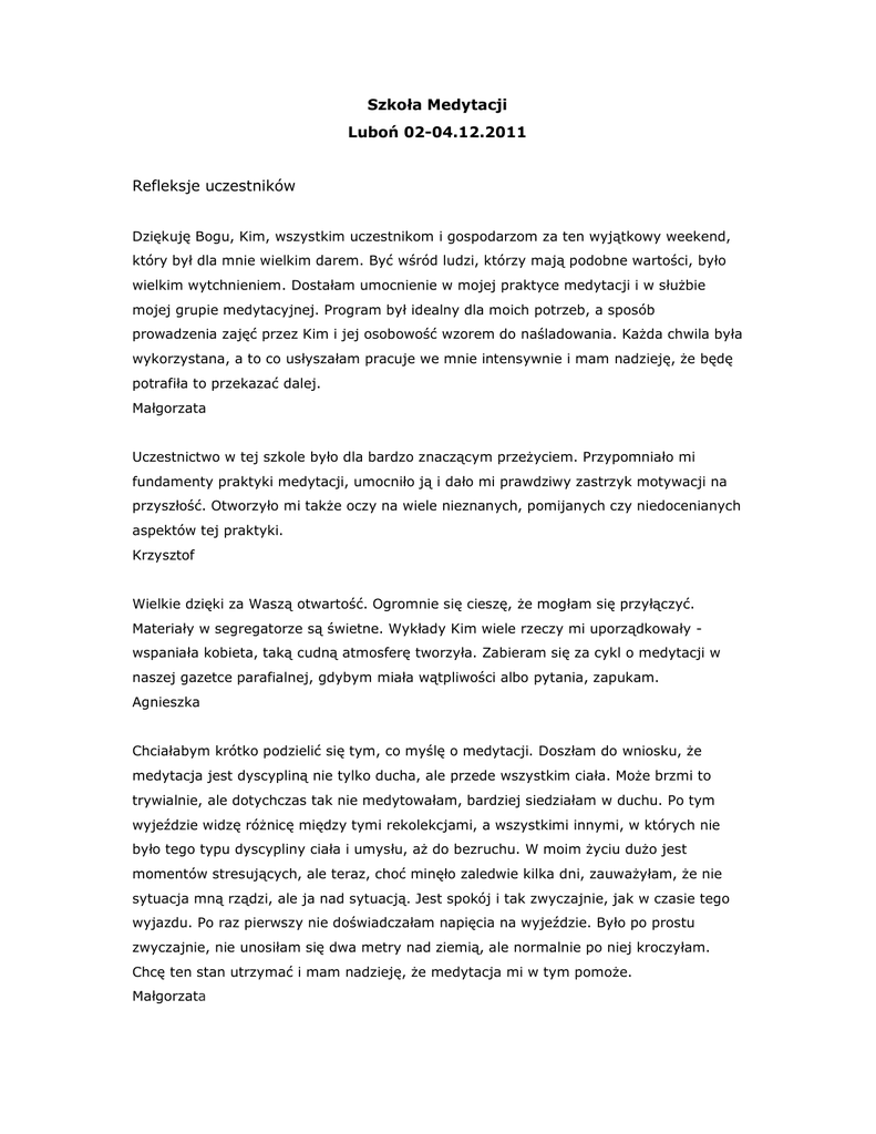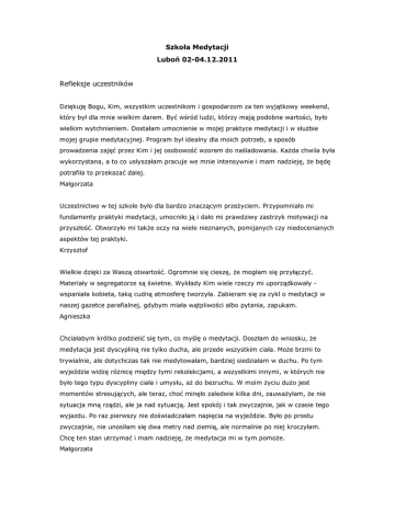 Szkoła Medytacji Luboń 02-04.12.2011 Refleksje uczestników Dziękuję Bogu, Kim, wszystkim uczestnikom i gospodarzom za ten wyjątkowy weekend, który był dla mnie wielkim darem. Być wśród ludzi, którzy mają podobne wartości, było wielkim wytchnieniem. Dostałam umocnienie w mojej praktyce medytacji i w służbie mojej grupie medytacyjnej. Program był idealny dla moich potrzeb, a sposób prowadzenia zajęć przez Kim i jej osobowość wzorem do naśladowania. Każda chwila była wykorzystana, a to co usłyszałam pracuje we mnie intensywnie i mam nadzieję, że będę potrafiła to przekazać dalej. Małgorzata Uczestnictwo w tej szkole było dla bardzo znaczącym przeżyciem. Przypomniało mi fundamenty praktyki medytacji, umocniło ją i dało mi prawdziwy zastrzyk motywacji na przyszłość. Otworzyło mi także oczy na wiele nieznanych, pomijanych czy niedocenianych aspektów tej praktyki. Krzysztof Wielkie dzięki za Waszą otwartość. Ogromnie się cieszę, że mogłam się przyłączyć. Materiały w segregatorze są świetne. Wykłady Kim wiele rzeczy mi uporządkowały wspaniała kobieta, taką cudną atmosferę tworzyła. Zabieram się za cykl o medytacji w naszej gazetce parafialnej, gdybym miała wątpliwości albo pytania, zapukam. Agnieszka Chciałabym krótko podzielić się tym, co myślę o medytacji. Doszłam do wniosku, że medytacja jest dyscypliną nie tylko ducha, ale przede wszystkim ciała. Może brzmi to trywialnie, ale dotychczas tak nie medytowałam, bardziej siedziałam w duchu. Po tym wyjeździe widzę różnicę między tymi rekolekcjami, a wszystkimi innymi, w których nie było tego typu dyscypliny ciała i umysłu, aż do bezruchu. W moim życiu dużo jest momentów stresujących, ale teraz, choć minęło zaledwie kilka dni, zauważyłam, że nie sytuacja mną rządzi, ale ja nad sytuacją. Jest spokój i tak zwyczajnie, jak w czasie tego wyjazdu. Po raz pierwszy nie doświadczałam napięcia na wyjeździe. Było po prostu zwyczajnie, nie unosiłam się dwa metry nad ziemią, ale normalnie po niej kroczyłam. Chcę ten stan utrzymać i mam nadzieję, że medytacja mi w tym pomoże. Małgorzata Moje notatki W życiu ważną rzeczą jest mieć kogoś, kto uważnie słucha. Medytacja jest ćwiczeniem prawdziwego słuchania. Słuchanie, to prawdziwy początek medytacji. Być z Bogiem, doświadczyć Go jako podstawy naszej istoty. Od opierania się na zewnętrznych rytuałach, doktrynach do doświadczenia Boga w sercu. Medytacja jest byciem otwartym na Ducha Miłości, Ducha Bożego. Ignorancja nie pozwala nam zobaczyć prawdy. Medytacja to nauka doceniania i odpowiadania na głębię własnej istoty. Wymawiaj mantrę jako wyraz wiary i miłości. Zadaniem medytacji jest zaproszenie całego ruchliwego i rozproszonego umysłu do bezruchu, ciszy i koncentracji. Twój wybór: czemu poświęcasz swoją uwagę mantrze, czy myślom, ale nie walcz. Myśli reprezentują ego, które zbudowane jest z myśli o sobie i innych. Jezus nie powiedział zniszcz ego, tylko zostaw ego poza sobą. W czasie medytacji dajesz czas Bogu, nieważne co się wydarzy. *** Odkrycie medytacji przez Johna Maina dokonało się na Wschodzie. Medytacja sięga początków chrześcijaństwa, zanim nastąpiły podziały w Kościele. Nasz świat nie jest oddzielony od świata duchowego. Ego nie jest naszym prawdziwym ja. Grzech pojawia się, gdy odwracamy się od Boga i zaprzyjaźniamy się z naszym ego. Wystarczy zwrócić się ku Bogu, ku naszemu prawdziwemu ja. Bóg jest niewidzialny, nieokreślony. Możemy się do Niego zbliżyć poprzez modlitwę. Modlimy się do Tego, który bada serca, nie zważa na słowa. Celem medytacji jest dotknięcie Boga, który jest miłością. *** Ego, to wiele obrazów, które mamy w głowie o sobie i innych. Patrząc na ludzi widzimy tylko swoje projekcje o nich, nie ich naprawdę. Nieświadomość siebie, gdzie ego zablokowało wszystkie uczucia, które były dla nas niebezpieczne objawiają się: - nagły płacz, - irytacja 2 - fale gniewu, - nuda, - uczucie suchości i bezcelowości (acedia). Samo nazwanie emocji powoduje, że ona się zmniejsza. Po acedii pojawia się apatea. Pytanie ego: jaki to ma sens, jeśli po tym czuję się jeszcze gorzej? Jeśli pozwolimy emocjom wyzwolić się wówczas pozwolimy, aby duch Chrystusa zaczął w nas działać. *** Lewa półkula – filtr wszystkich wrażeń, siedziba ego. Prawa półkula – myśli globalne, poczucie empatii, łączności, miejsce Boga. Medytacja włącza inny bieg życia, w inny tryb myślenia. Dzięki niej tworzą się połączenia między lewą i prawą półkulą. Nasz mózg zaczyna być budowany od prawej strony. Gdy dziecko idzie do szkoły zaczyna dominować lewa półkula. Potrzeby: bezpieczeństwa, miłości, kontroli, uznania, władzy, przyjemności. Niezaspokojone potrzeby – tworzy się łańcuch ego: - brak miłości – Bóg nie może Cię kochać bezwarunkowo. Nie zasługujesz na miłość. - brak kontroli – czy przypadkiem nie tracisz kontroli nad sobą, - brak bezpieczeństwa – nie wiem, czy to jest bezpieczne, - brak ważności – ty tu nie pasujesz. Zranienia, które były w przeszłości nie muszą wpływać na twoje życie. Grzeszymy, gdy mylnie uznajemy ego za prawdziwe Ja. Jezus pokazuje także ludzką zdolność życia w zdrowej równowadze pomiędzy ego i Ja. Dorota 3