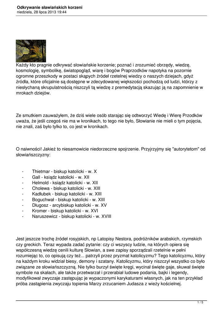 Odkrywanie sławiańskich korzeni niedziela, 28 lipca 2013 19:44 Każdy kto pragnie odkrywać słowiańskie korzenie; poznać i zrozumieć obrzędy, wiedzę, kosmologię, symbolikę, światopogląd, wiarę i bogów Praprzodków napotyka na pozornie ogromne przeszkody w postaci skąpych źródeł rzetelnej wiedzy o naszych dziejach, gdyż źródła, które oficjalnie są dostępne w zdecydowanej większości pochodzą od ludzi, którzy z niesłychaną skrupulatnością niszczyli tą wiedzę z premedytacją skazując ją na zapomnienie w mrokach dziejów. Ze smutkiem zauważyłem, że dziś wiele osób starając się odtworzyć Wiedę i Wierę Przodków uważa, że jeśli czegoś nie ma w kronikach, to tego nie było, Słowianie nie mieli o tym pojęcia, nie znali, zaś było tylko to, co jest w kronikach. O naiwności! Jakież to niesamowicie niedorzeczne spojrzenie. Przyjrzyjmy się "autorytetom" od słowiańszczyzny: - Thietmar - biskup katolicki - w. X Gall - ksiądz katolicki - w. XII Helmold - ksiądz katolicki - w. XII Cholewa - biskup katolicki - w. XIII Kadłubek - biskup katolicki - w. XIII Boguchwał - biskup katolicki - w. XIII Długosz - arcybiskup katolicki - w. XV Kromer - biskup katolicki - w. XVI Naruszewicz - biskup katolicki - w. XVIII Jest jeszcze trochę źródeł rosyjskich, np Latopisy Nestora, podróżników arabskich, rzymskich czy greckich. Teraz wypada zadać pytanie: czy ci wszyscy ludzie, na których opiera się współczesną wiedzę cenili kulturę Słowian, a swe zapisy sporządzali rzetelnie w pełni rozumiejąc to, co opisują czy też... patrzyli przez pryzmat katolicyzmu? Tego katolicyzmu, który na każdym kroku widział biesy, demony i szatany. Katolicyzmu, który niszczył wszystko co było związane ze słowiańszczyzną. Nie tylko burzył święte kręgi, wycinał święte gaje, skuwał święte symbole na skałach, ale także przetwarzał i przerabiał ludowe podania, bajki i legendy, modyfikował zwyczaje zastępując je wypaczonymi karykaturami własnych, jak na ten przykład próba zastąpienia zwyczaju topienia Marzy zrzucaniem Judasza z wieży kościelnej. 1/5 Odkrywanie sławiańskich korzeni niedziela, 28 lipca 2013 19:44 W związku z powyższym opieranie się wyłącznie na kronikach jest szczytem naiwności by nie rzec, że głupoty. Właśnie to tysiącletnie niszczenie Słowian i przeinaczanie ich wiedzy oraz kultury upoważniło pewnego przezabawnego pana w czarnej sukience na umieszczenie w serwisie YouTube filmiku , w którym w komiczny sposób mówi o ściętym drzewie, które po ścięciu nie rośnie i staje się martwym drewnem. Pan ten mimo szczerych wysiłków nie zaimponował intelektem oraz wiedzą. Według Słowian jednym z magicznych drzew jest... wierzba. Wierzba, która ma bardzo interesujące właściwości, w tym bardzo łatwo się przeszczepia oraz... potrafi odbijać od korzeni nowe pędy. Nowe wyrasta na starym. Słudzy mroku ścieli drzewo, wypalili jego pień. To prawda. Zapomnieli jednak o korzeniach, z których dziś puszczają młode, silne i elastyczne pędy. Korzeniach, które zachowały się do dnia dzisiejszego na polskiej, rzekomo katolickiej wsi, która wbrew obiegowej opinii okazała się ostoją rodzimowierstwa oraz prastarej wiedzy. O tym, że to właśnie Polska Wieś jest ostoją Słowiańszczyzny doskonale wiedział Zorian Dołęga-Chodakowski, który tak o tym pisał: Trzeba pójść i zniżyć się pod strzechę wieśniaka w różnych odległych stronach, trzeba śpieszyć na jego uczty, zabawy i różne przygody. Tam, w dymie wznoszącym się nad głowami, snują się jeszcze stare obrzędy, nucą się dawne śpiewy i wśród pląsów prostoty odzywają się imiona Bogów zapomnianych. Wiedzieli o tym także inni badacze, w tym choćby Kazimierz Teofil Franciszek Moszyński, który dokonał wspaniałego opracowania "Kultura ludowa Słowian" wydanego w latach 30-tych ubiegłego wieku. Dzięki pracy p. Moszyńskiego można bez najmniejszego cienia wątpliwości stwierdzić, iż Słowianie dysponowali bardzo dogłębną wiedzą ezoteryczną; wiedzieli o prawach Universum, o naturze rzeczywistości, itp. Np w tomie II czytamy: 2/5 Odkrywanie sławiańskich korzeni niedziela, 28 lipca 2013 19:44 "...do dziś jeszcze przetrwały u Słowian całkiem wyraźne resztki wiary w tzw. wielość dusz (nawiasowo zaznaczmy od razu, że używając ostatniego terminu, a również posługując się taką nomenklaturą jak dusza widmo, dusza jaźni i dusza oddech vel dusza - oddech - życie, należy jasno zdać sobie sprawę, iż pierwotnie - jak stwierdzają stosunki w krajach poza-słowiańskich i w szczególności egzotycznych oraz wogóle dane porównawczej etnografiji i językoznawstwa - pewne koncepcje, których zlanie utworzyło nasze pojecie duszy, miały nieraz całkiem odrębne nazwy i nie stanowiły dla człowieka odmian jednego i tego samego, lecz rzeczy zupełnie samoistne, odrębne..." Tylko z tego fragmentu wyraźnie widać, iż Słowianie wiedzieli o tym, że człowiek posiada aż 4 różne ciała tu błędnie nazwane "duszami": 1. 2. 3. 4. chemiczne (fizyczne) stanowiące powłokę cielesną eteryczne z siedzibą w brzuchu (chi, prana) tu nazwane dusza-oddech odczuciowe z siedzibą w sercu (emocjonalne) tu nazwane dusza-widmo mentalne z siedzibą w głowie tu nazwane dusza-jaźń Ponadto Słowianie wiedzieli nie tylko o 4 ciałach, lecz także o 2 naturach ludzkich - ciemnej, demonicznej, oraz jasnej, boskiej. Człowiek żyjący godnie, będący uczciwym, słownym, rzetelnym, prawdomównym, odważnym panującym nad swymi emocjami, żądzami i instynktami rozwijał swą boską naturę i po śmierci trafiał do Niebieskiego Wyraju Ptasiego (Weli) strzeżonego przez Żar Ptaka (inaczej Złoty Kur, Raróg, Finist u Rosjan. Święty ptak Białoboga, a jednocześnie godło Polski) umiejscowionego w koronie Drzewa Życia (Kosmicznego Drzewa) i stawał się Welaninem, gdzie Weles wypasał dusze na zielonych ł